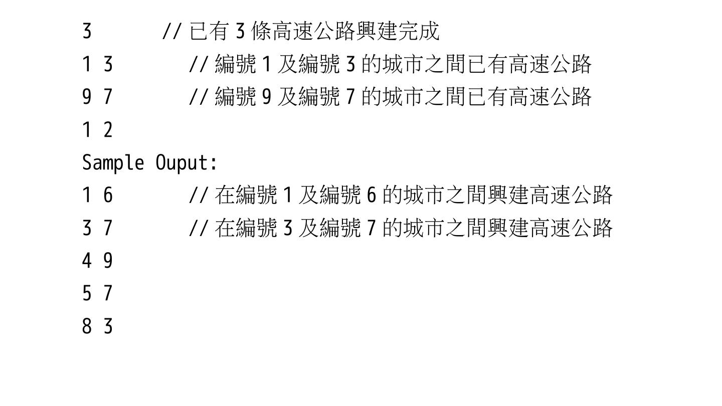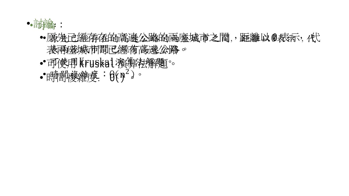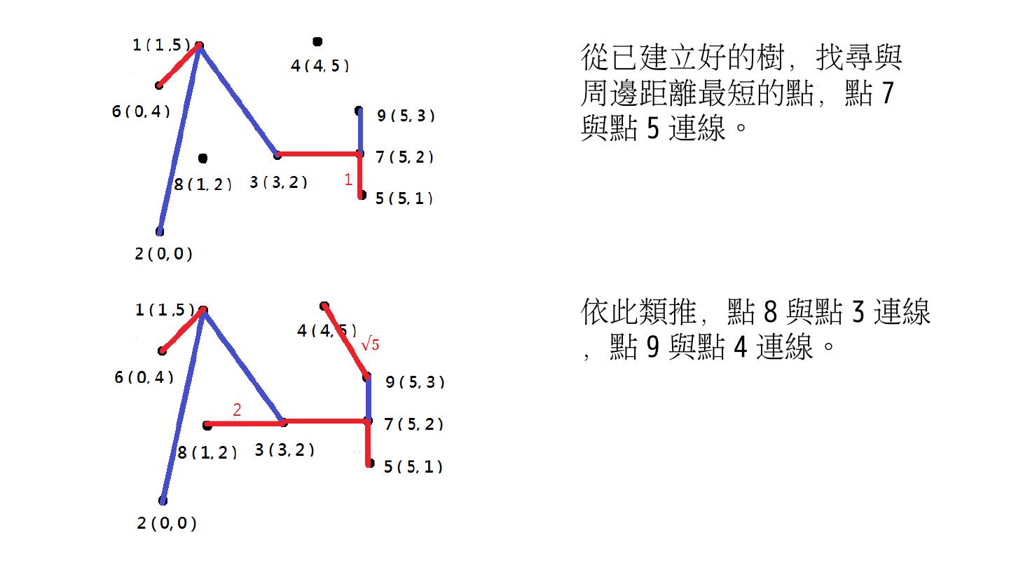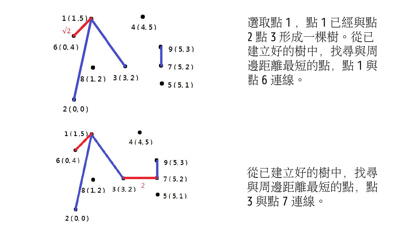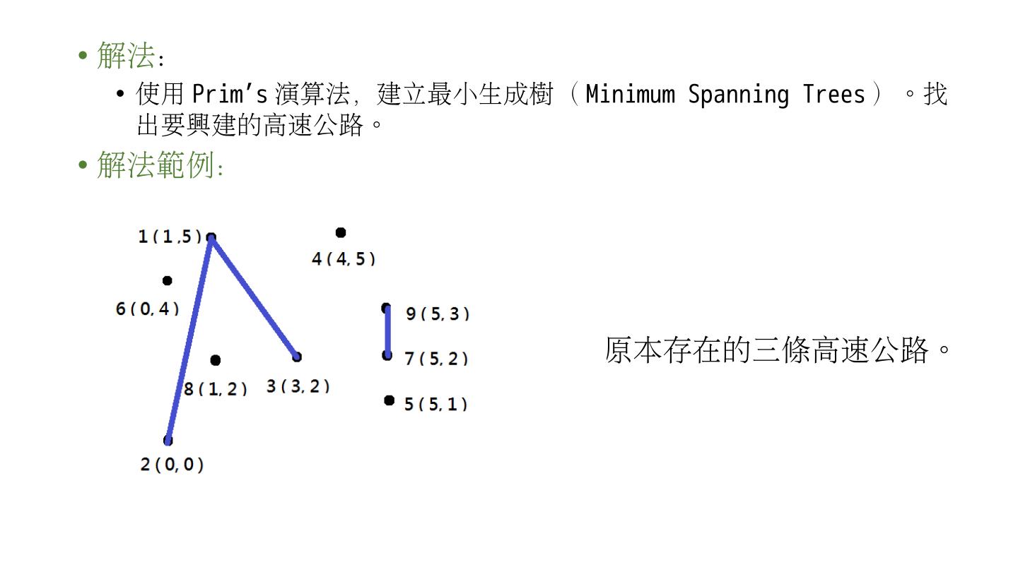使用Prim's演算法,建立最小生成樹(Minimum Spanning Trees)。找出要興建的 ... 從已建立好的樹中,找尋與周邊距離最短的點,點1與點6連線。 從已建立好的樹中, ...