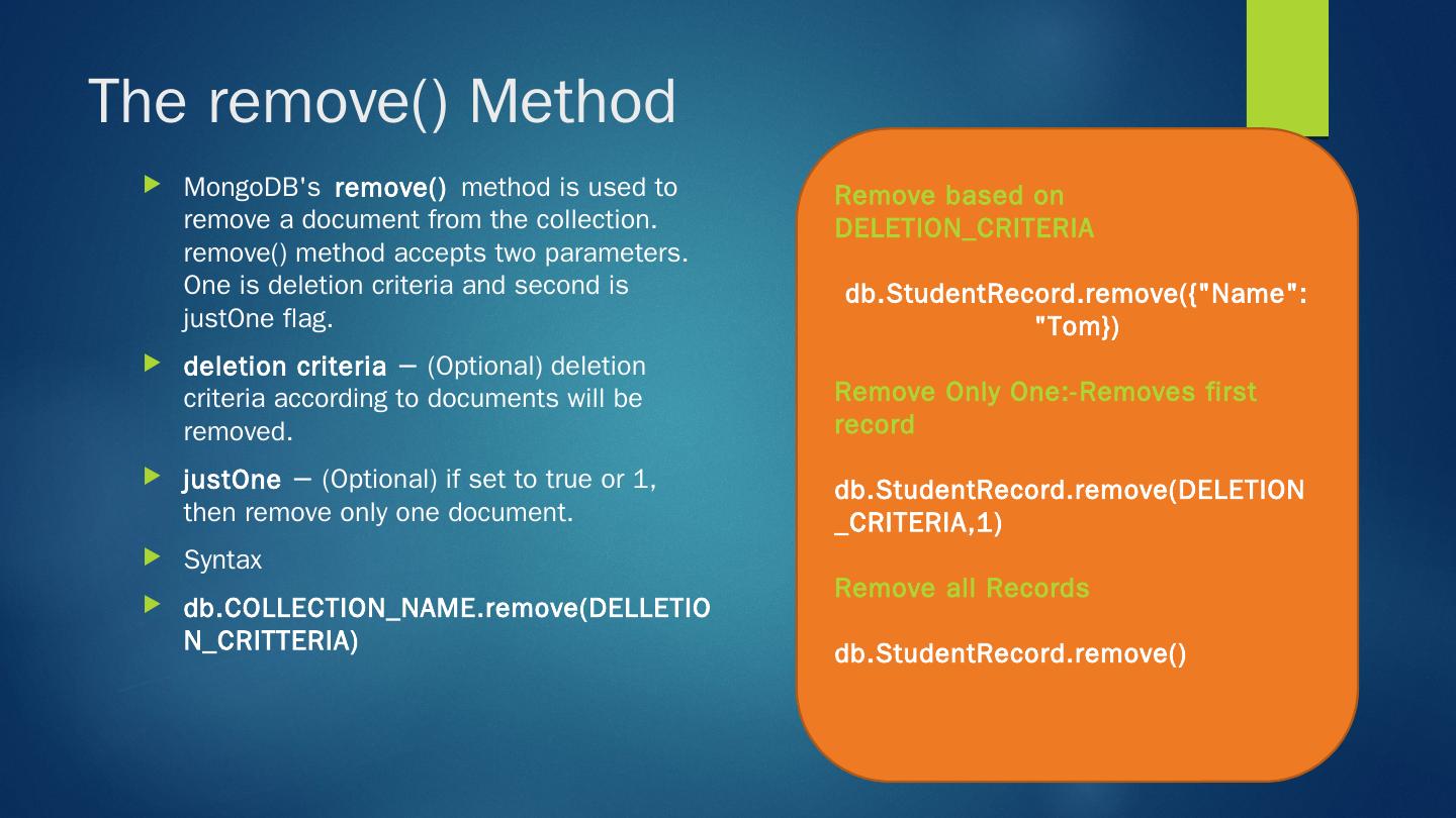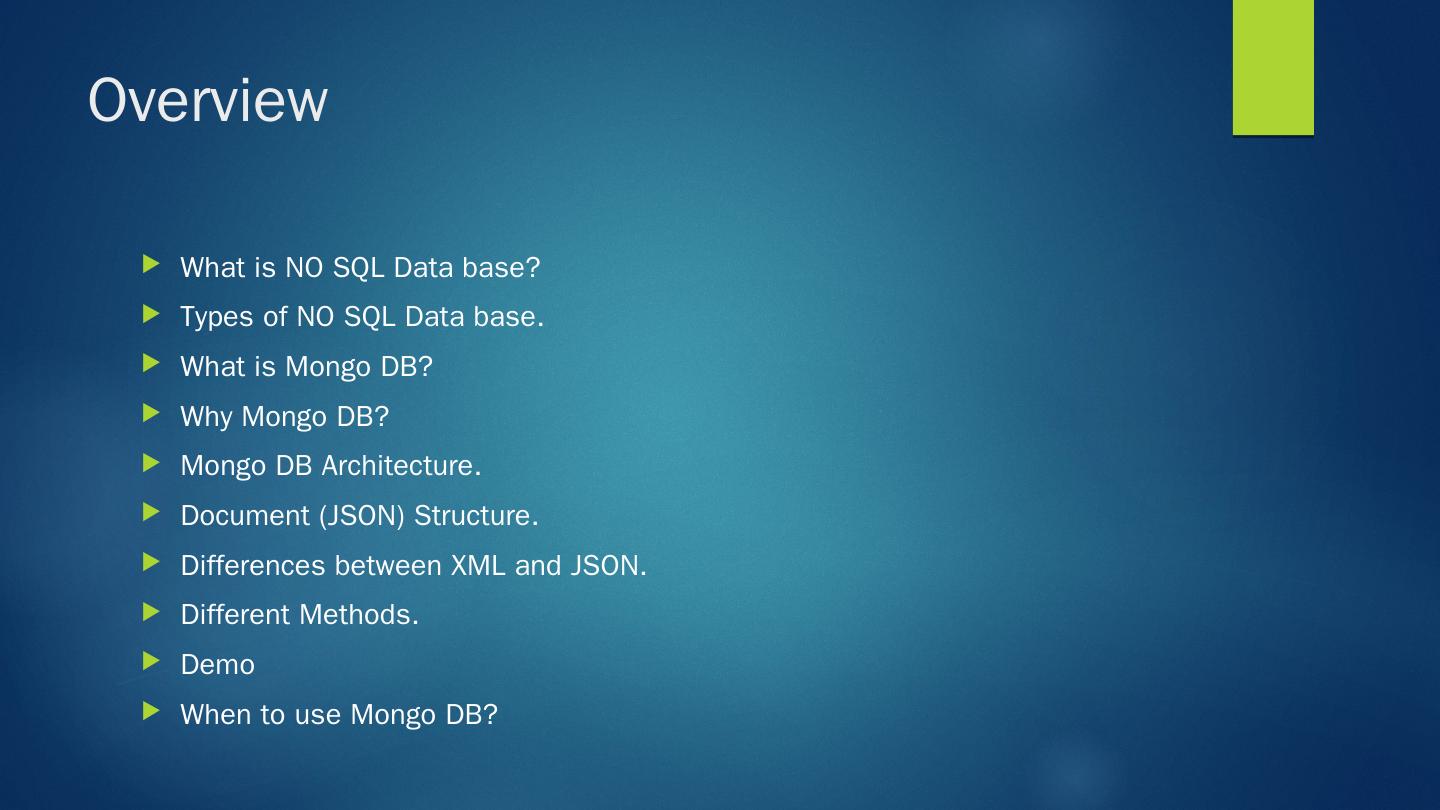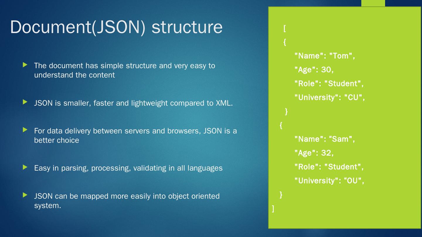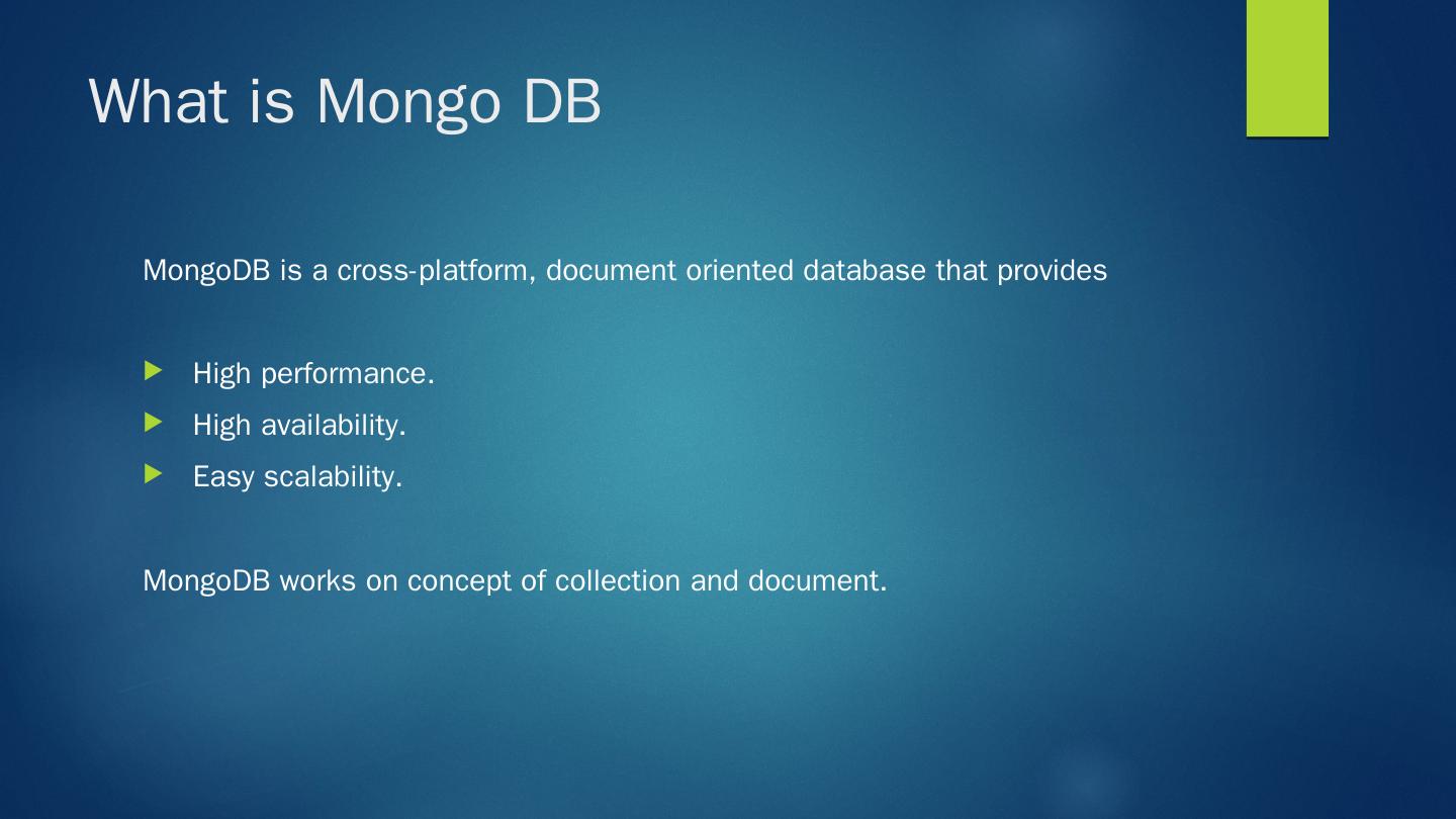 MongoDB is a cross-platform, document oriented database that provides ... MongoDB works on concept of collection and document. Why Mongo DB ?