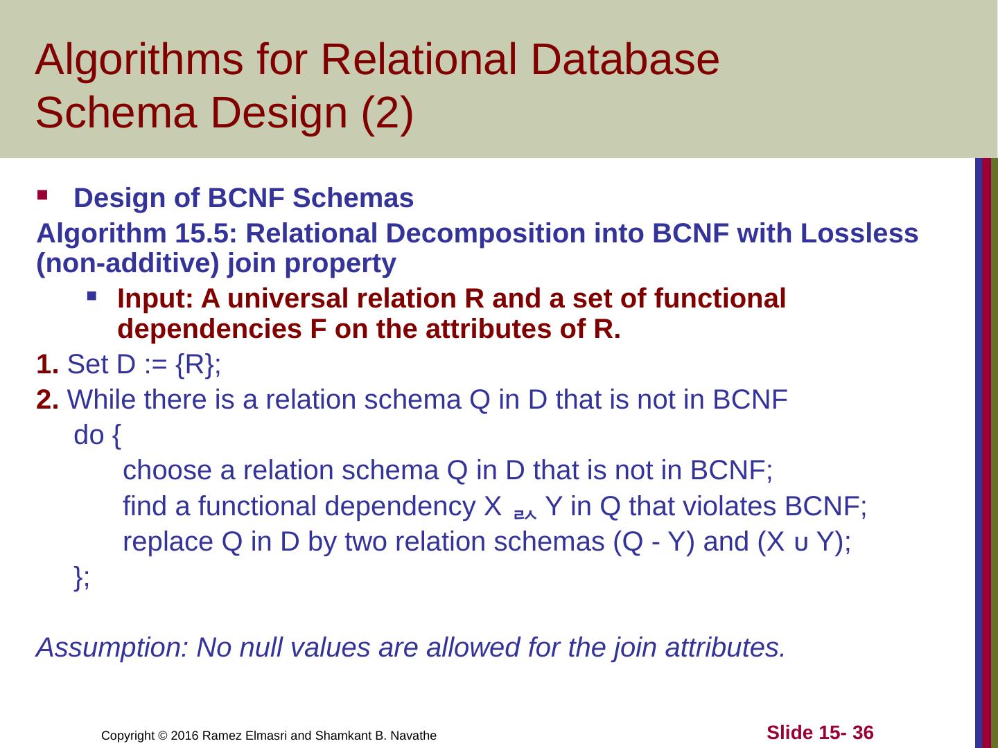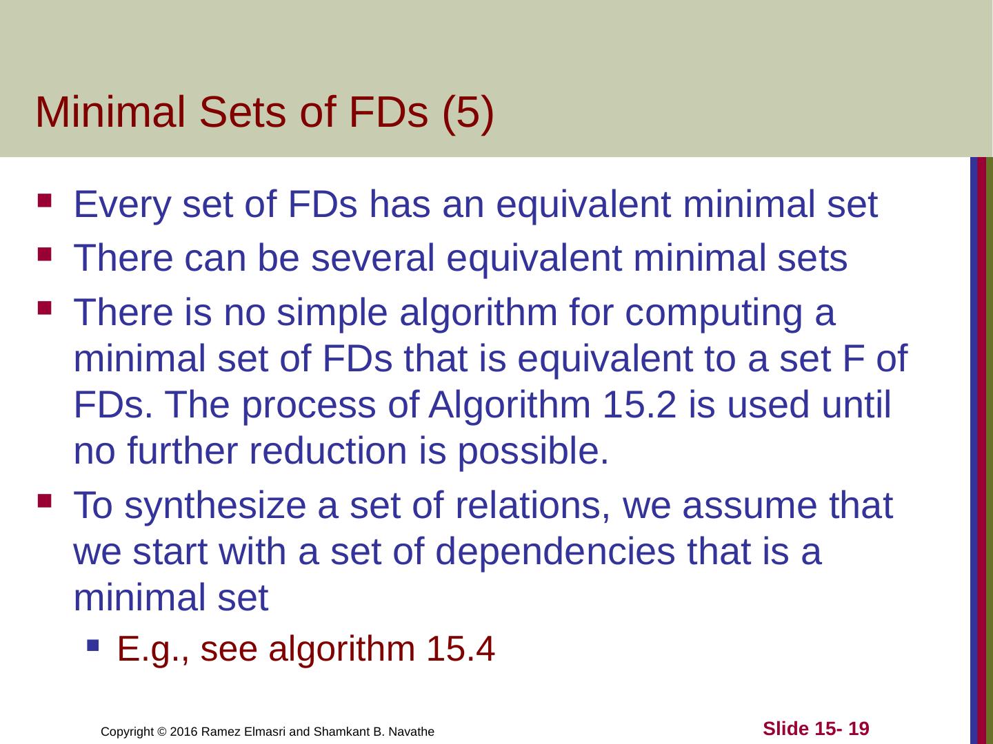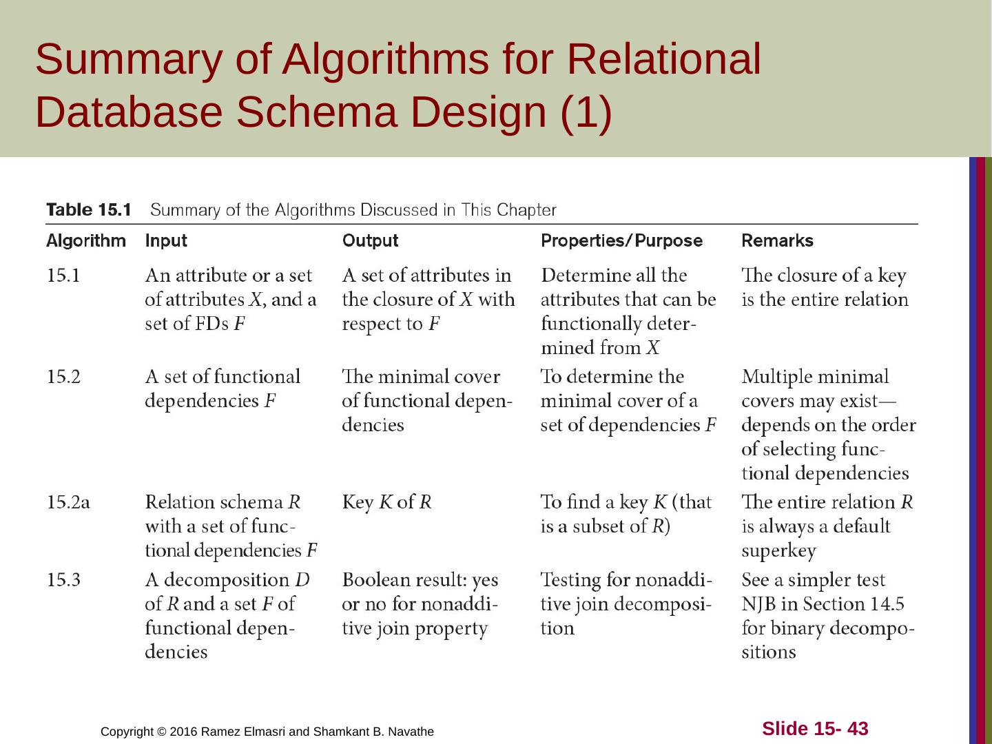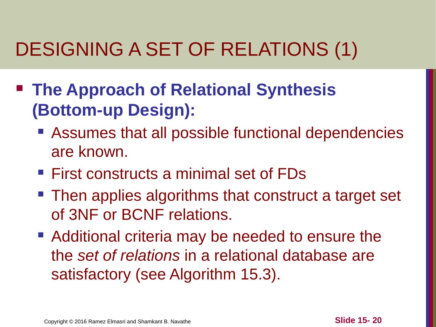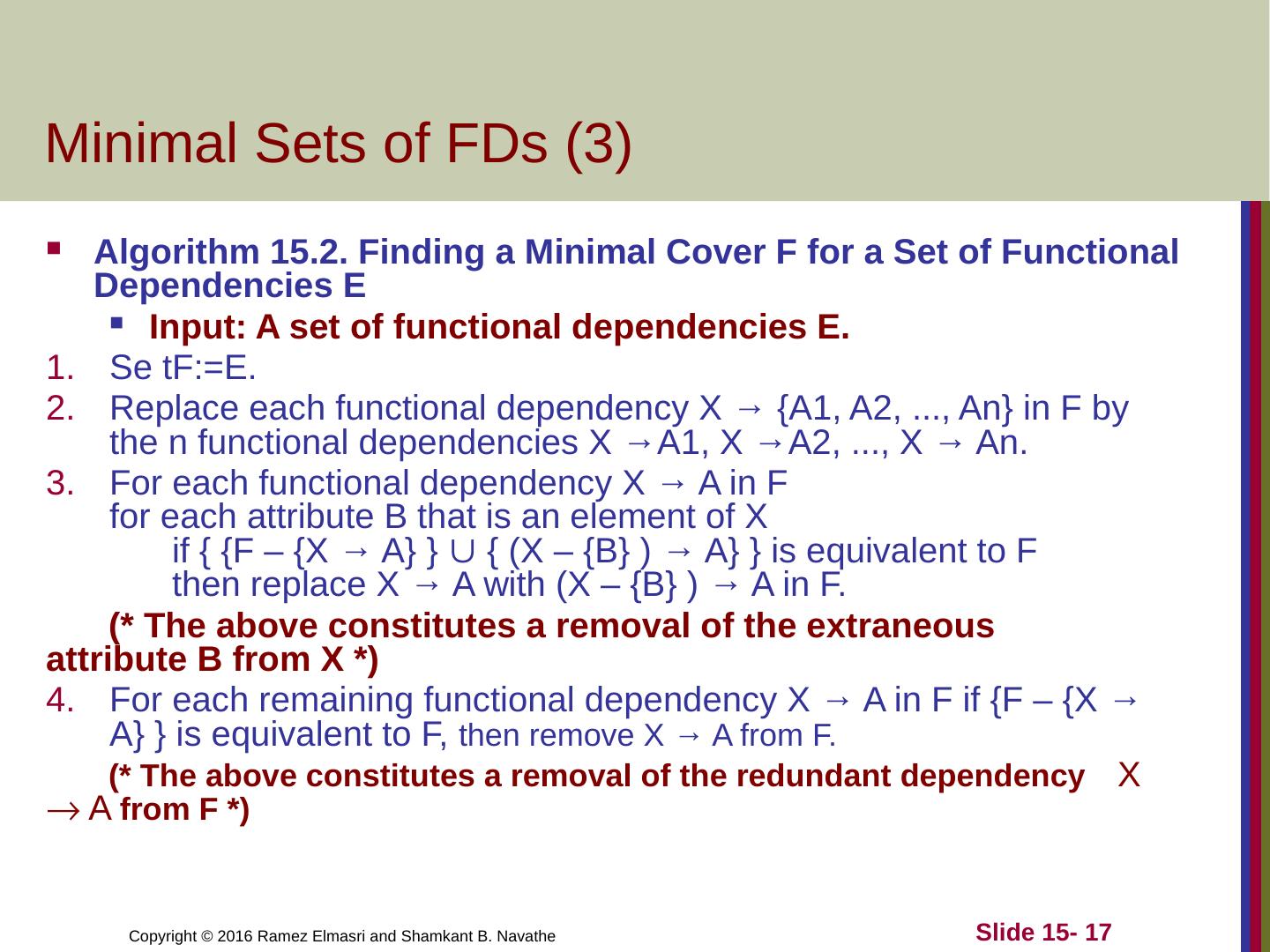 3. Algorithms for Relational Database Schema Design (1). Design of 3NF Schemas: Algorithm 15.4 Relational Synthesis into 3NF with Dependency Preservation ...