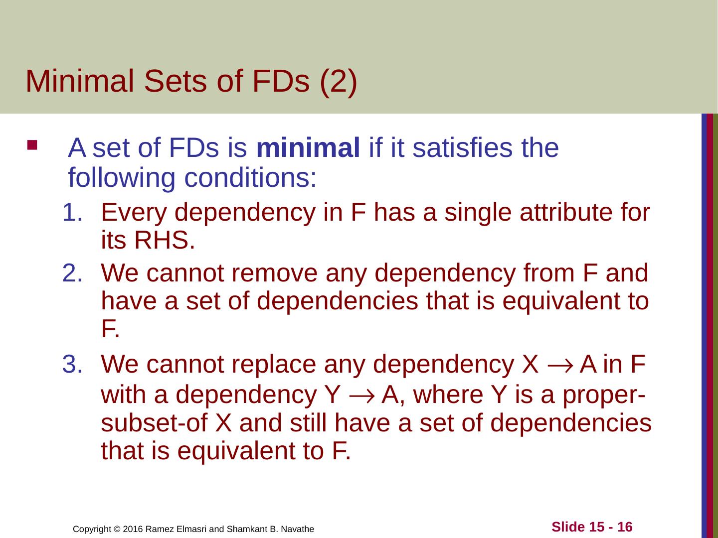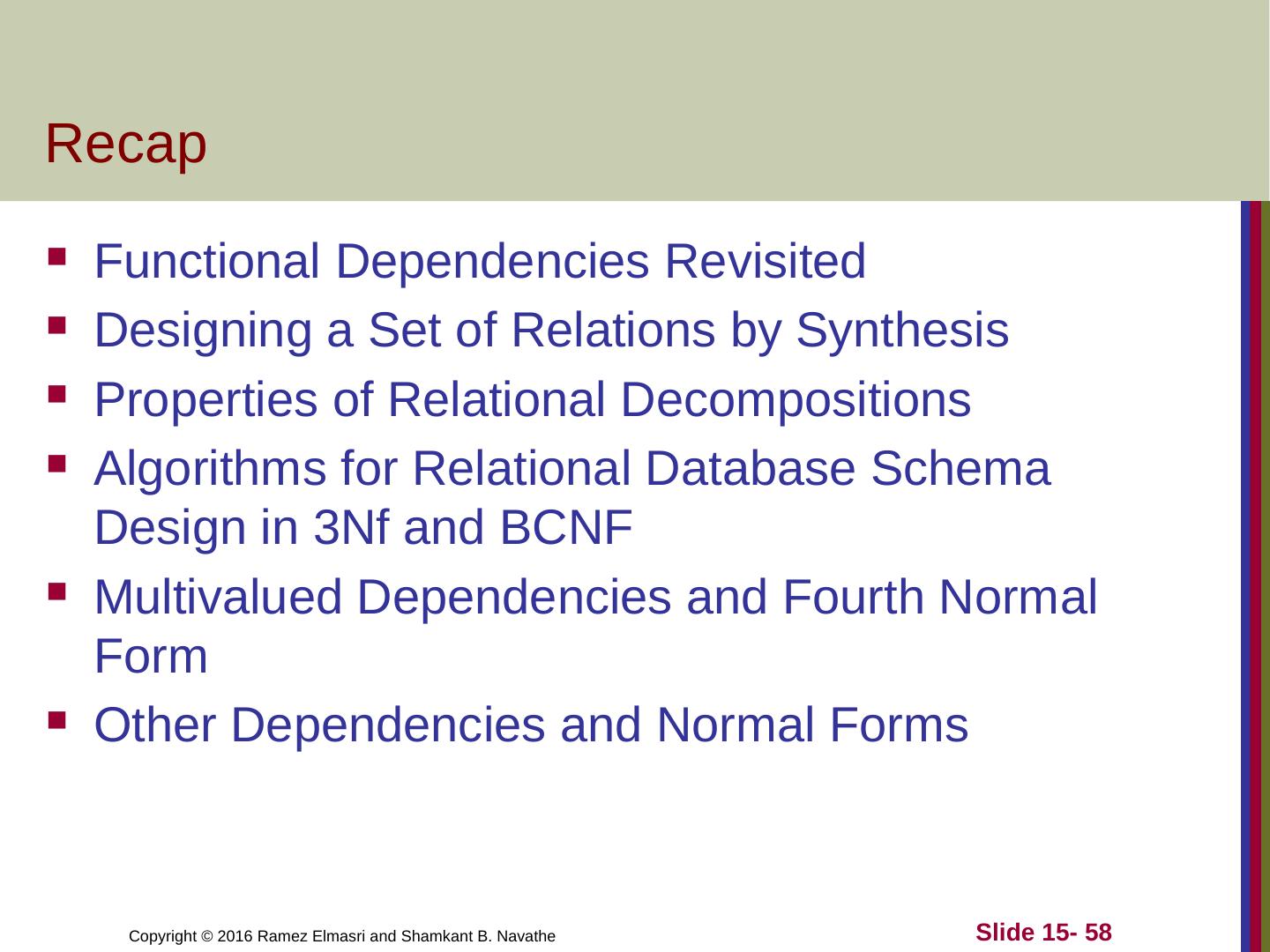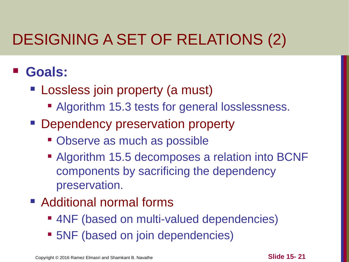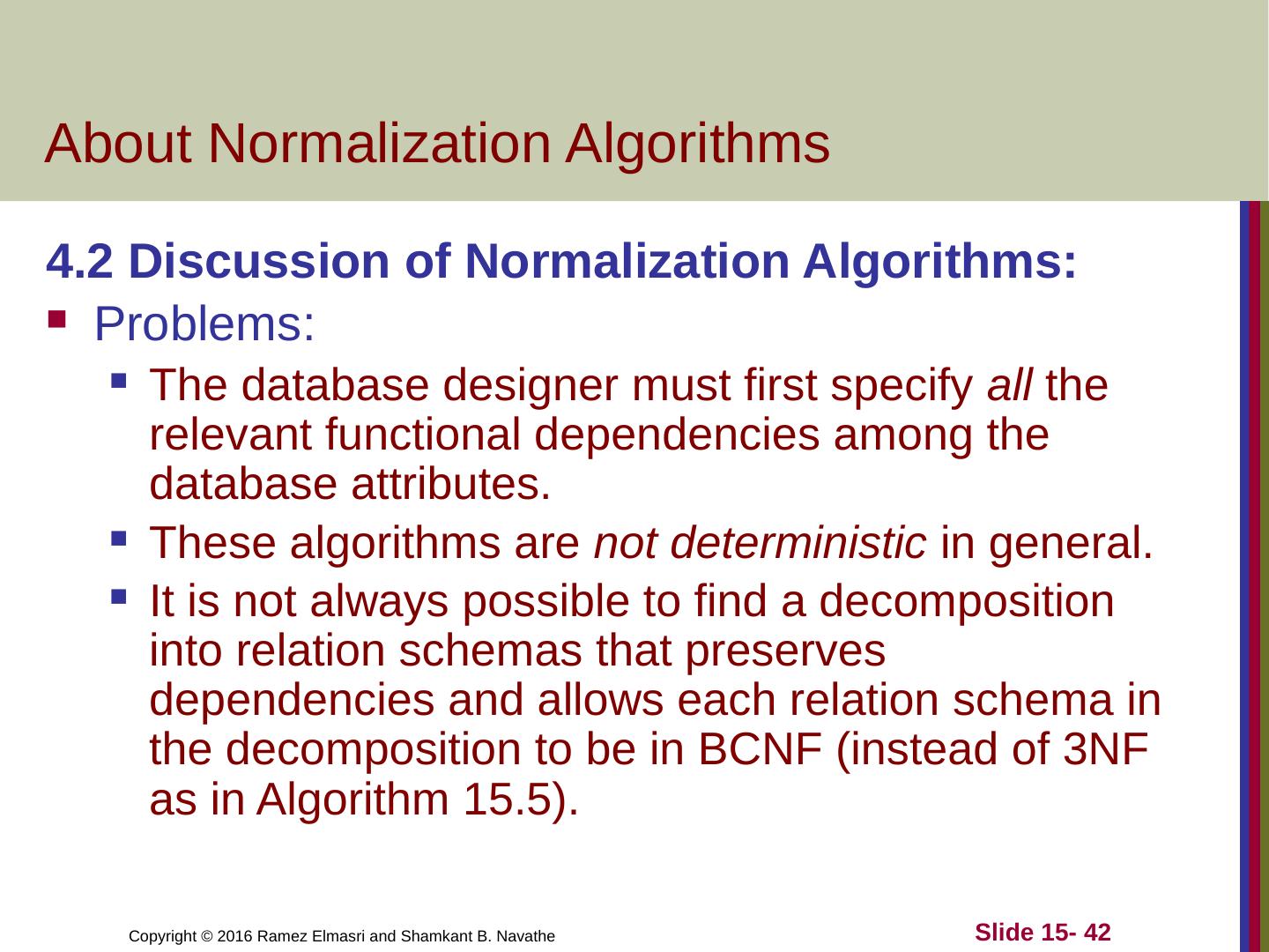 3. Algorithms for Relational Database Schema Design (1). Design of 3NF Schemas: Algorithm 15.4 Relational Synthesis into 3NF with Dependency Preservation ...
