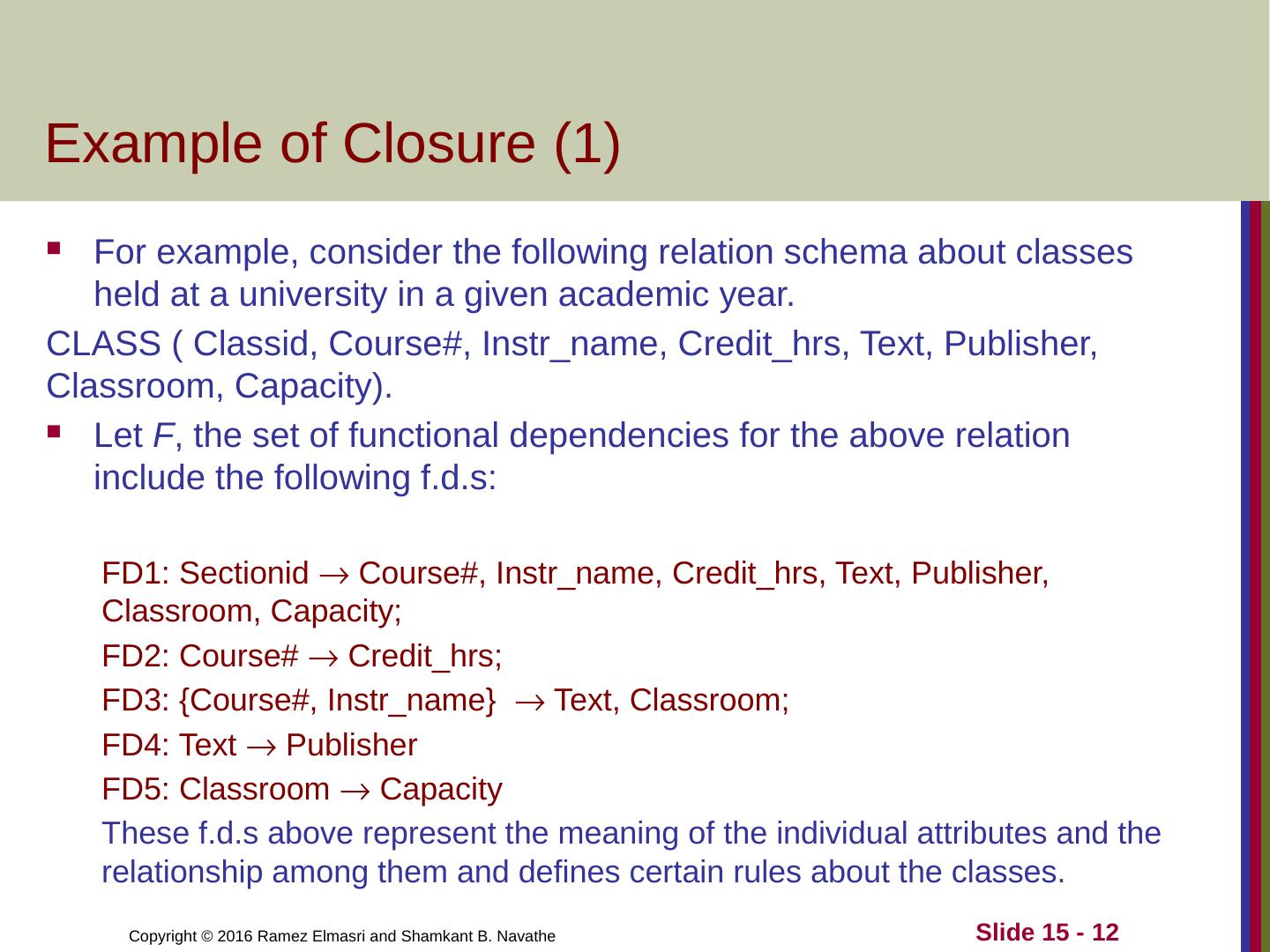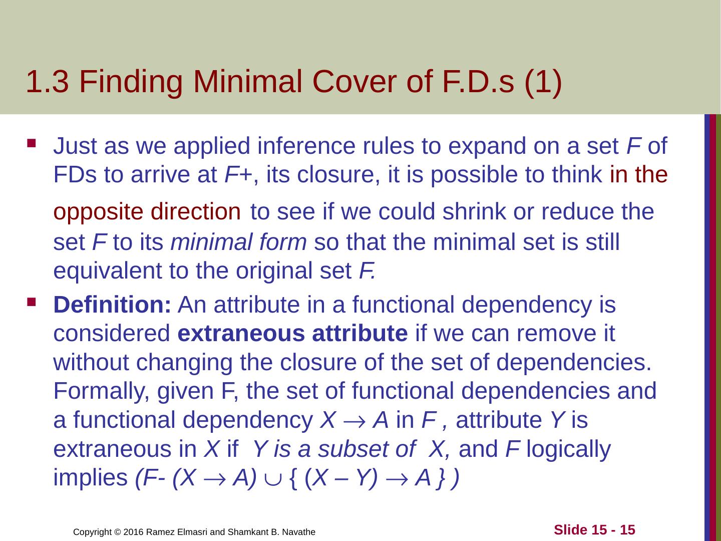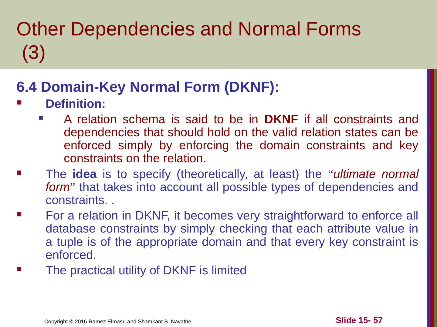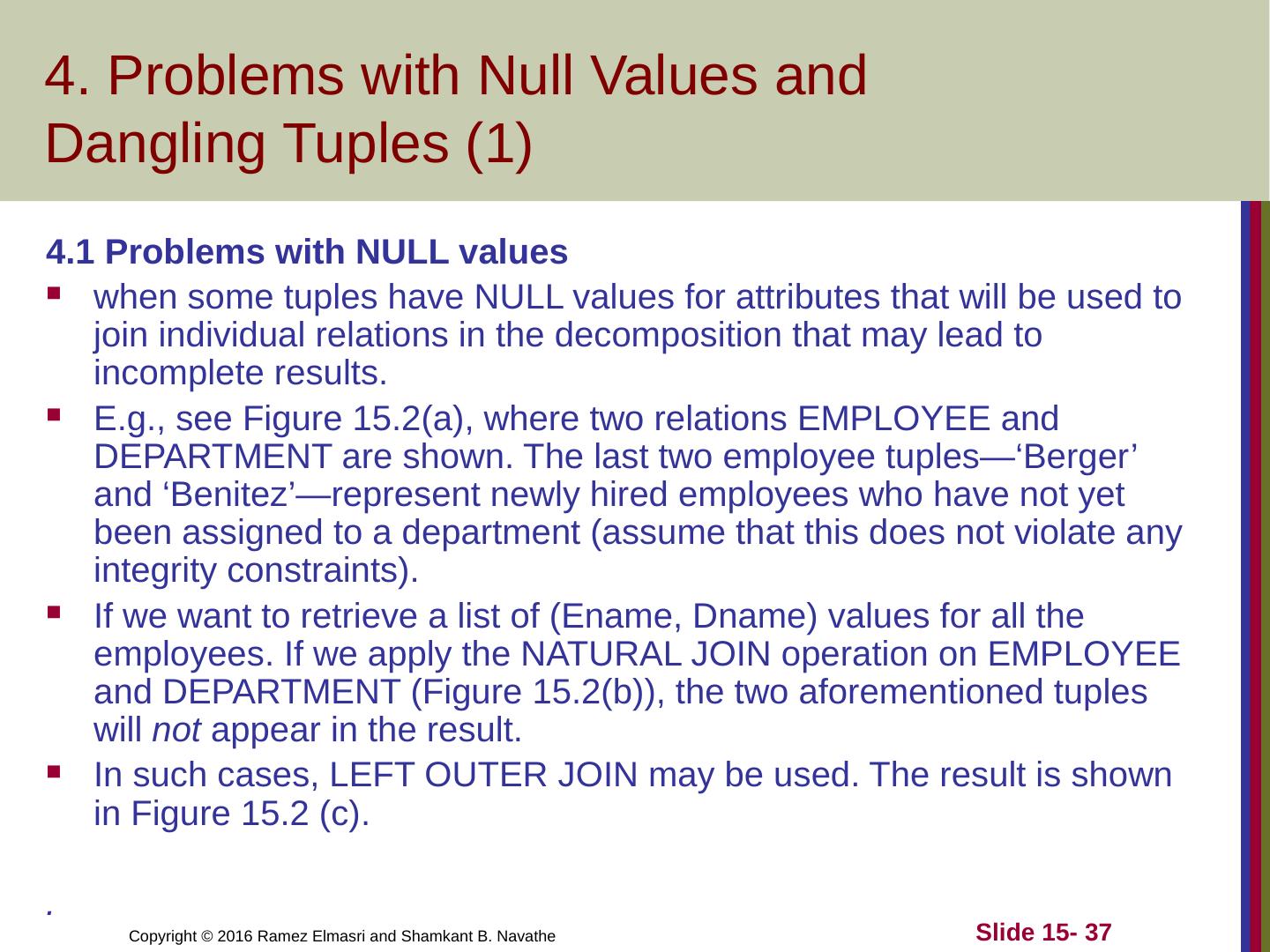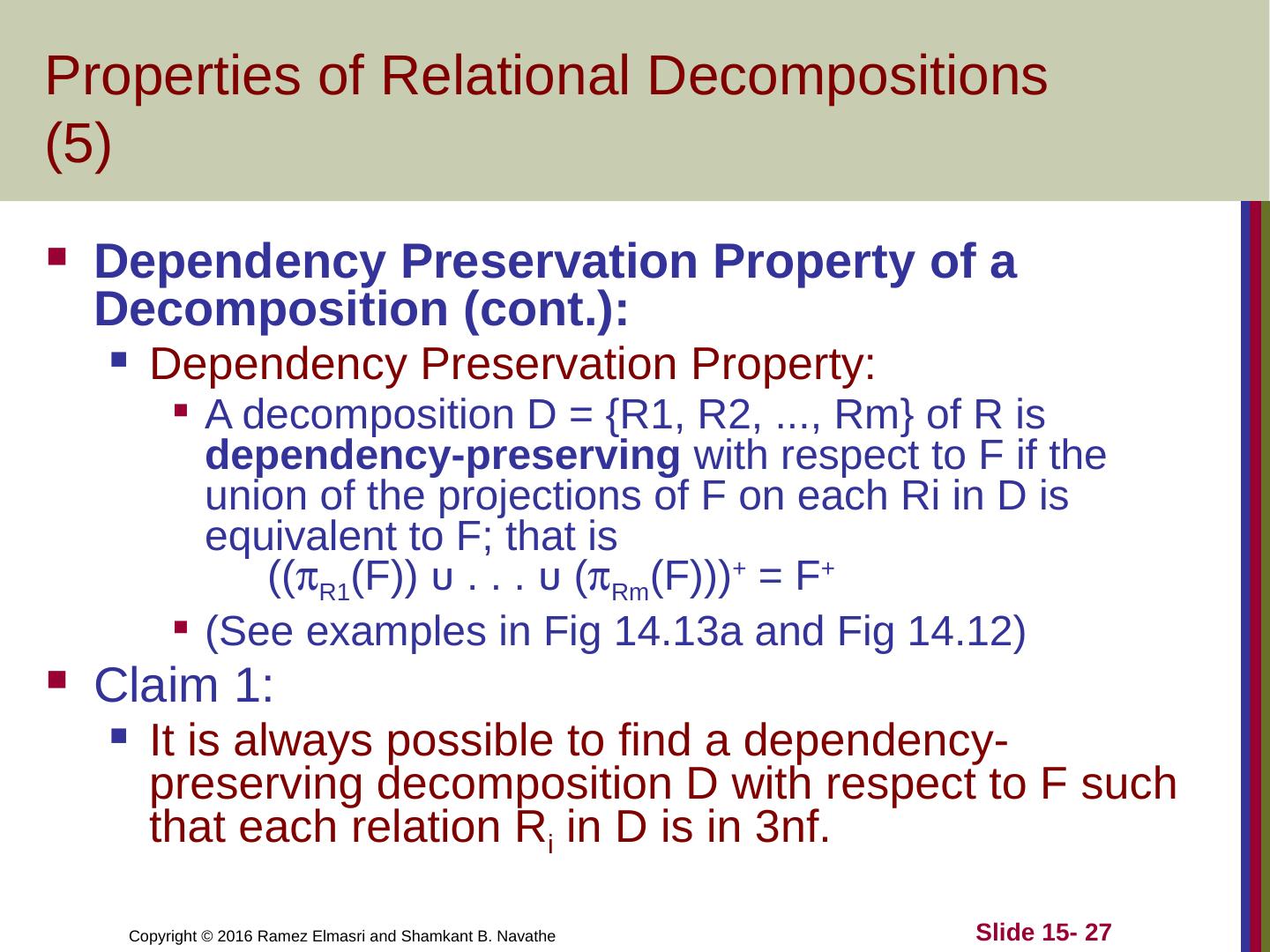 3. Algorithms for Relational Database Schema Design (1). Design of 3NF Schemas: Algorithm 15.4 Relational Synthesis into 3NF with Dependency Preservation ...