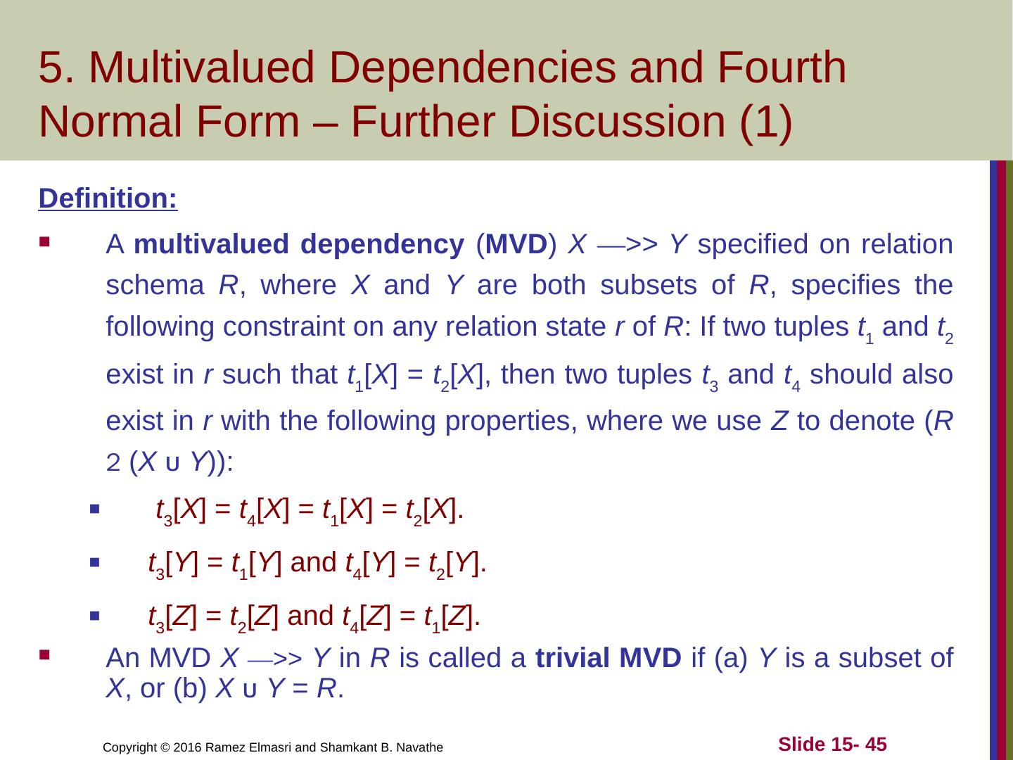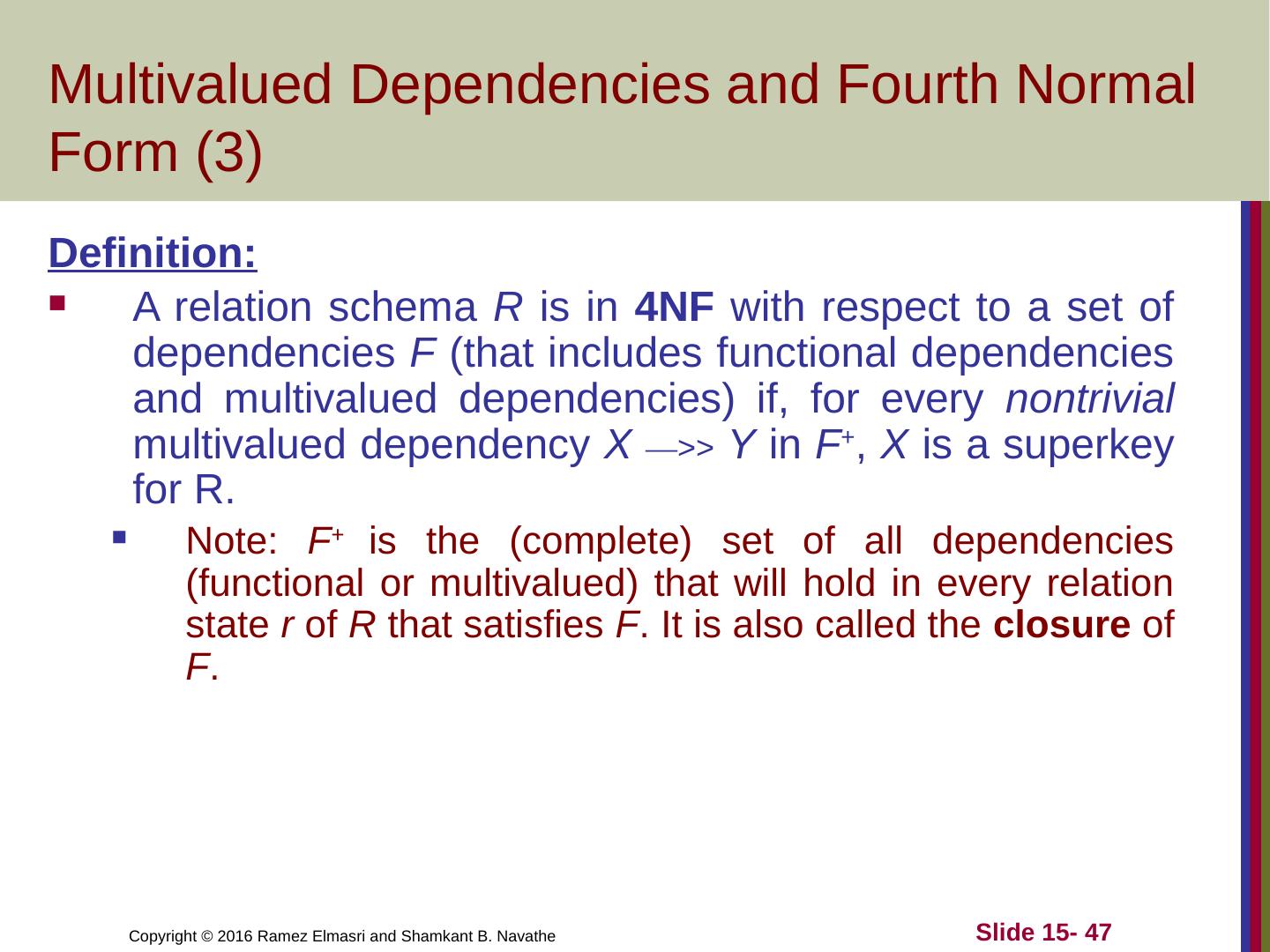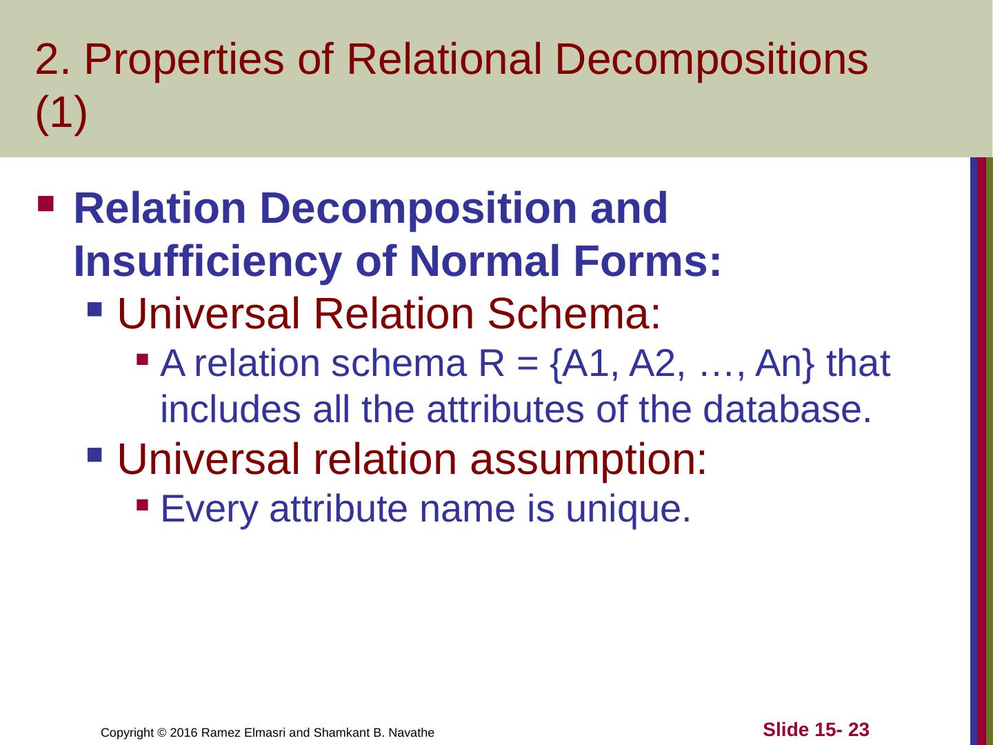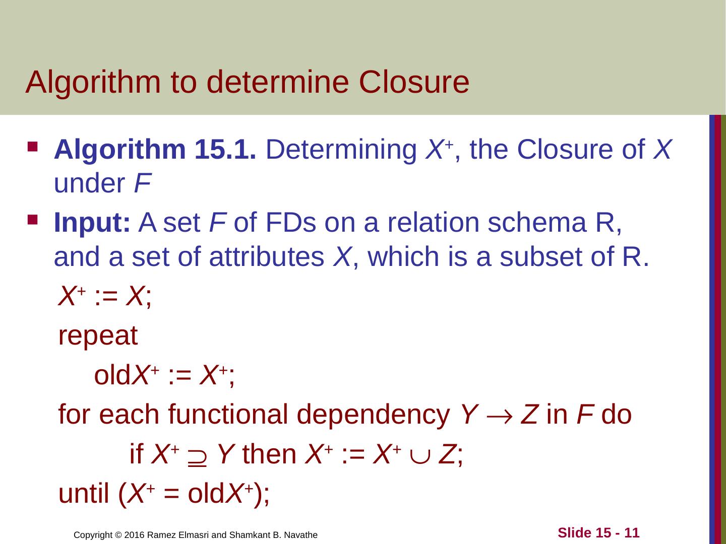 3. Algorithms for Relational Database Schema Design (1). Design of 3NF Schemas: Algorithm 15.4 Relational Synthesis into 3NF with Dependency Preservation ...