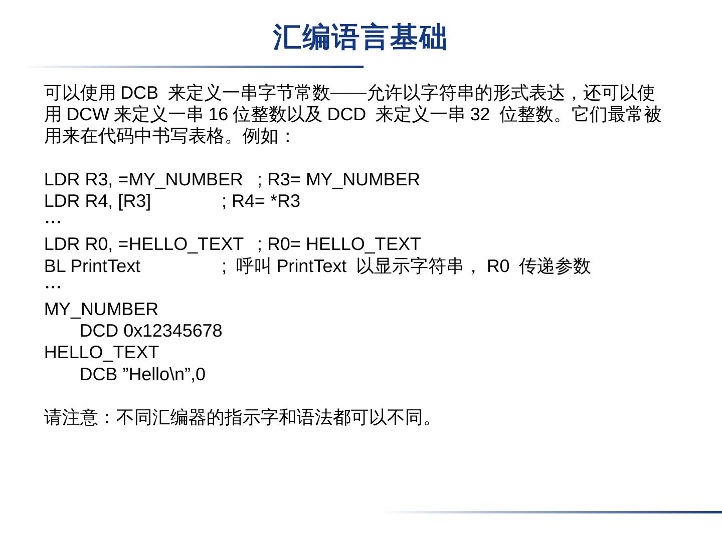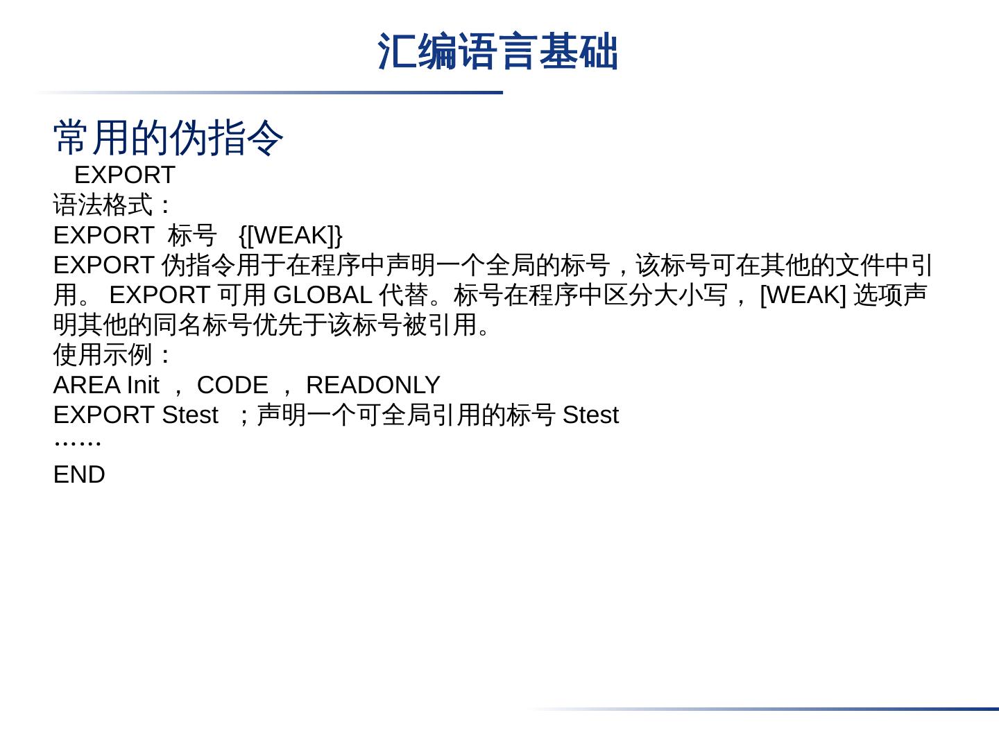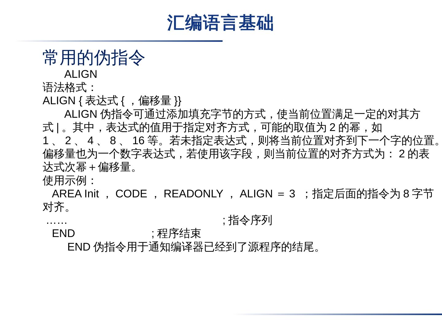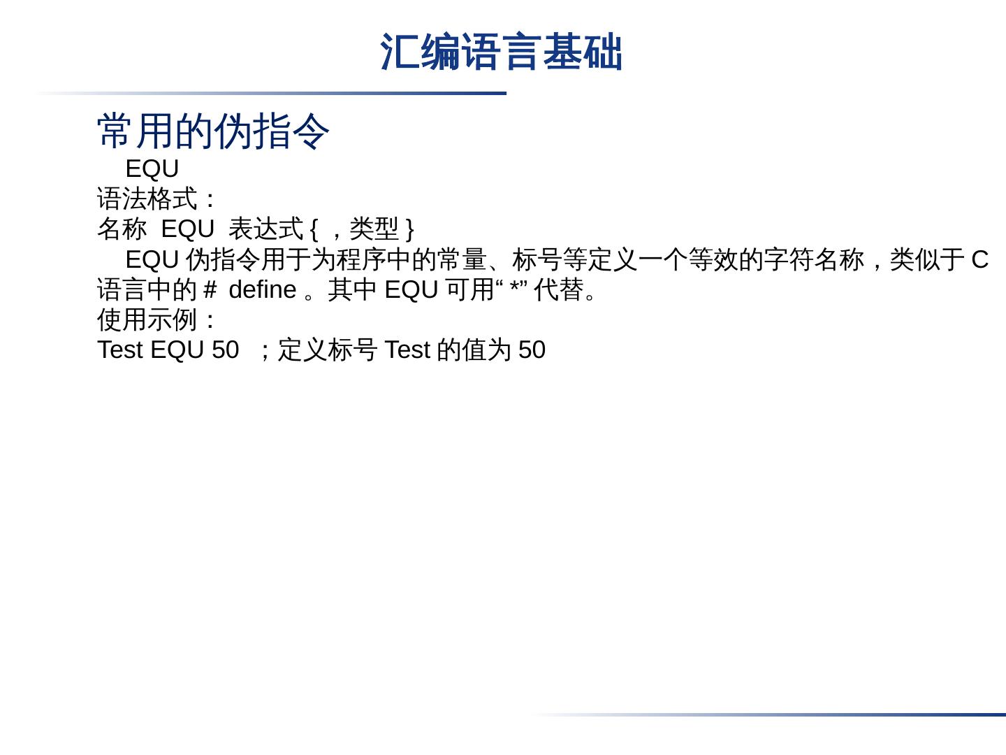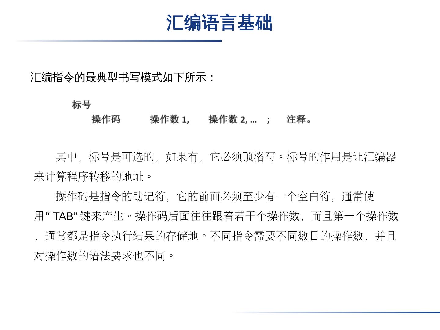 汇编语言基础. 汇编指令的最典型书写模式如下所示:. 其中,标号是可选的,如果有,它必须顶格写。标号的作用是让汇编器来计算程序转移的地址。
