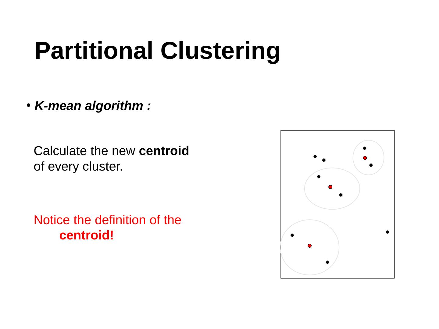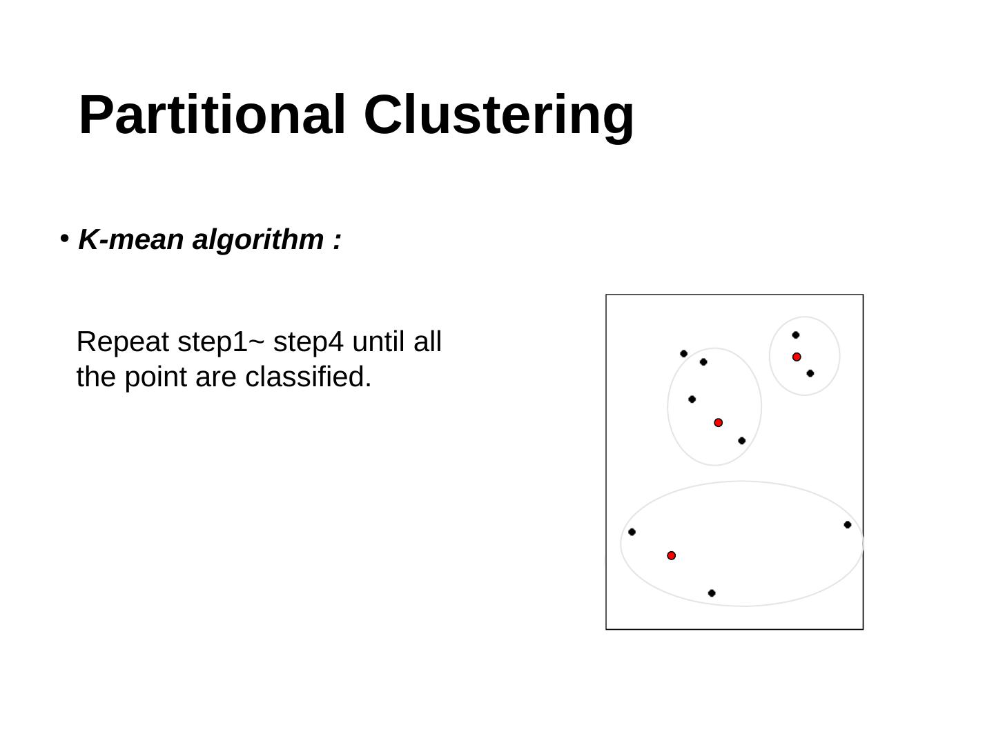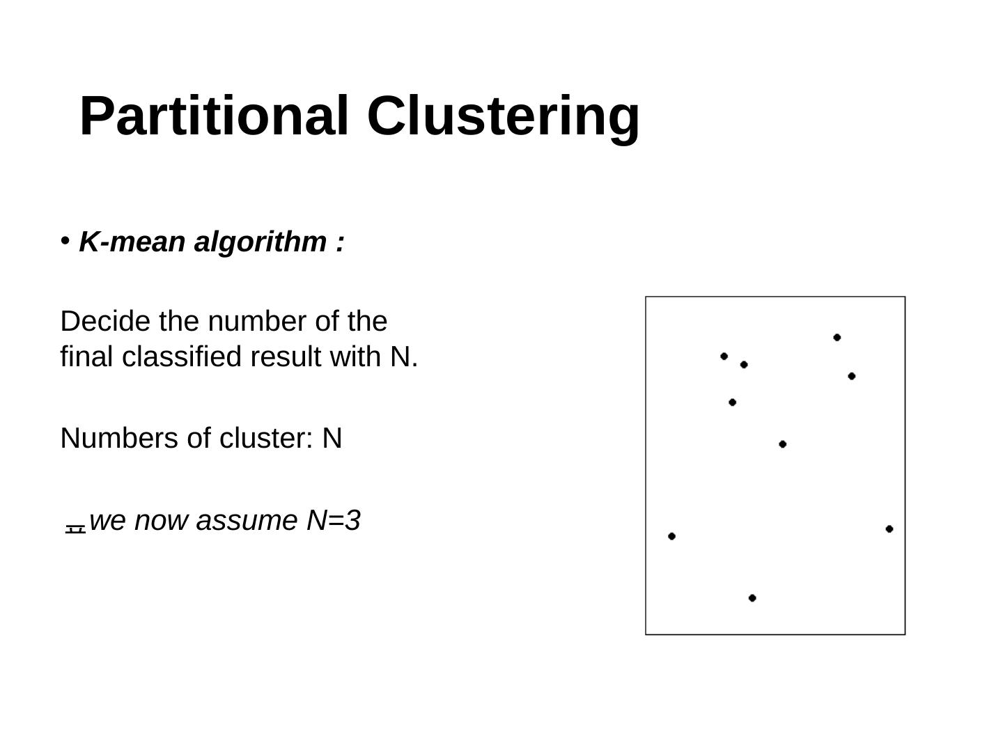 K-mean algorithm : Decide the number of the final classified result with N. Numbers of cluster: N. we now assume N=3. Partitional Clustering. K-mean algorithm ...