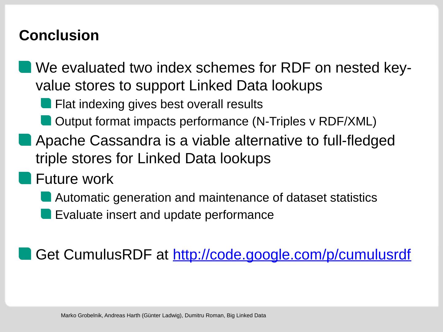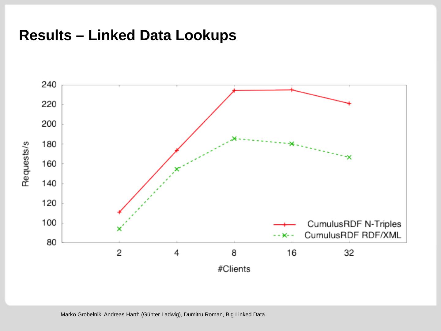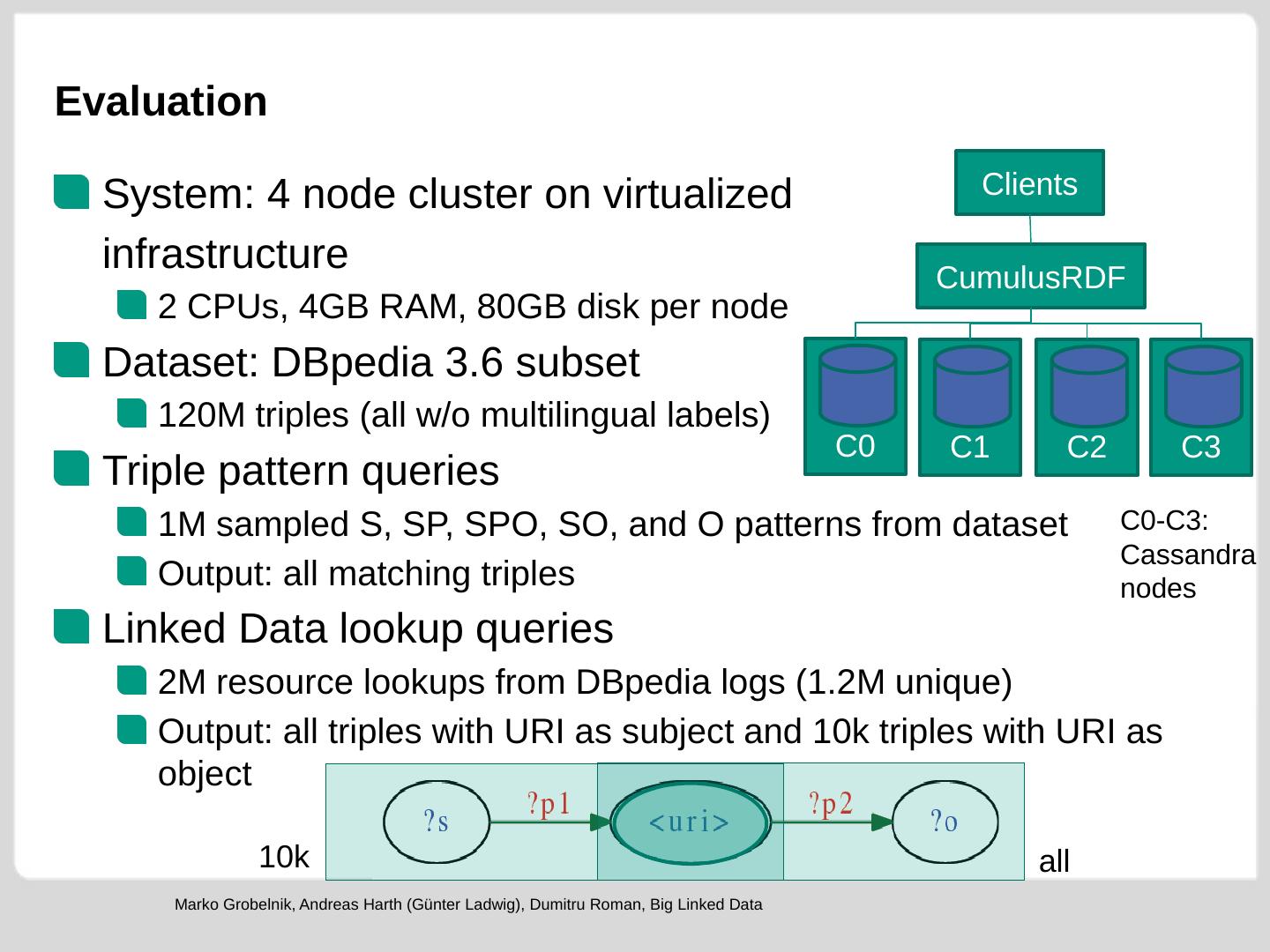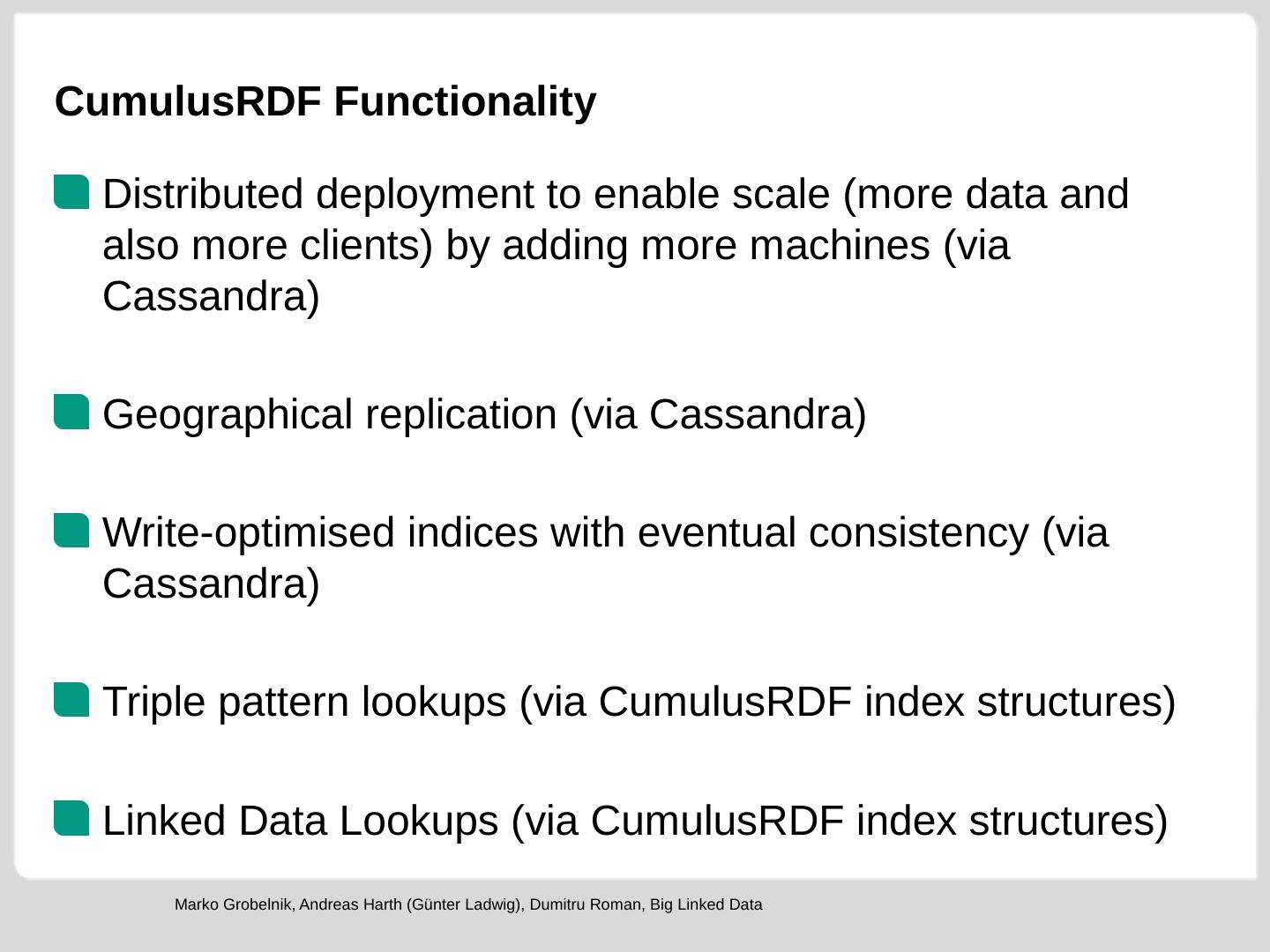 Linked Data Storage and Retrieval at Scale. Algorithmic. complexity. Size. Index Lookups. SPARQL. Reasoning. MB. GB. TB. CumulusRDF. (Apache Cassandra).