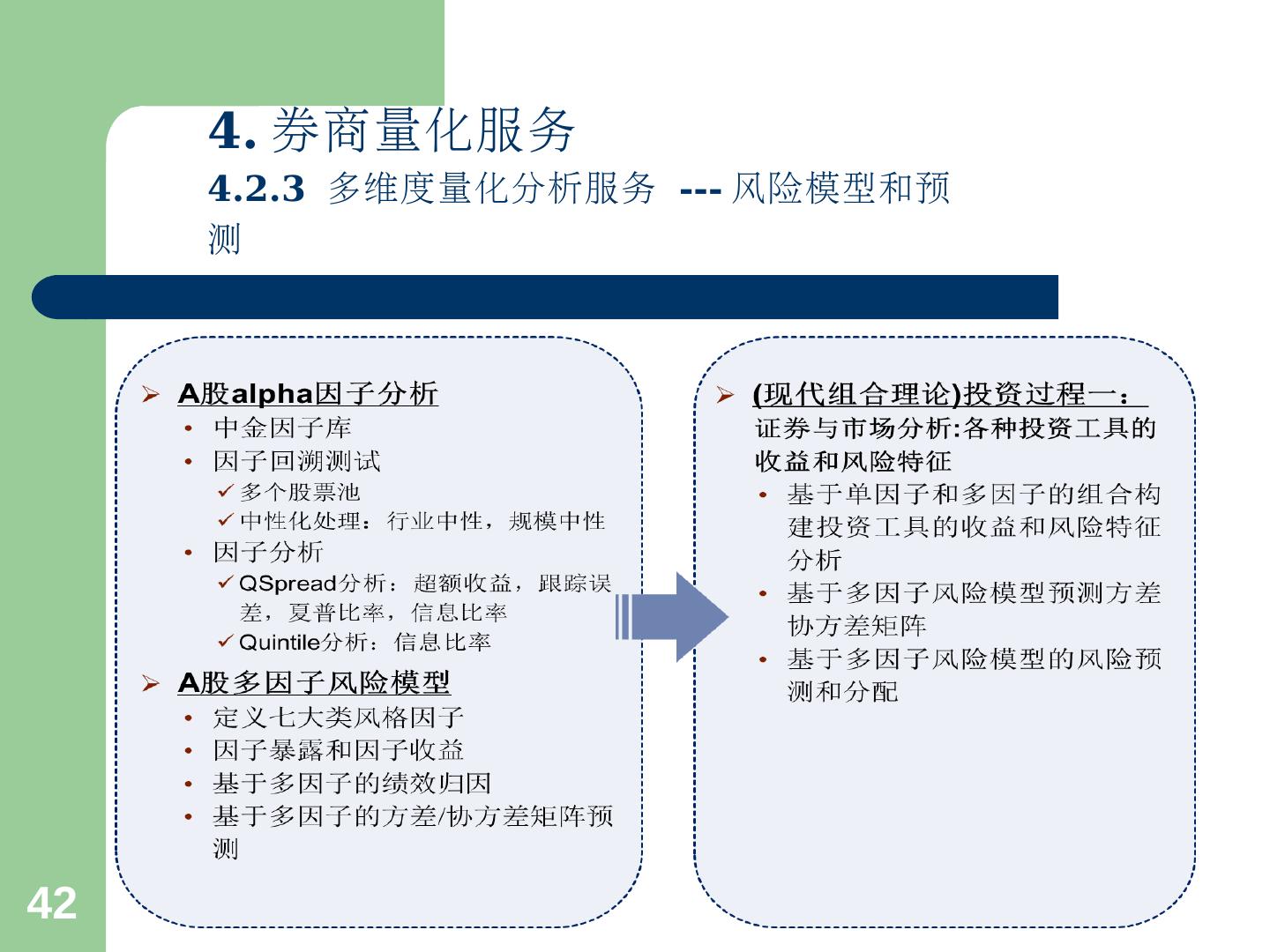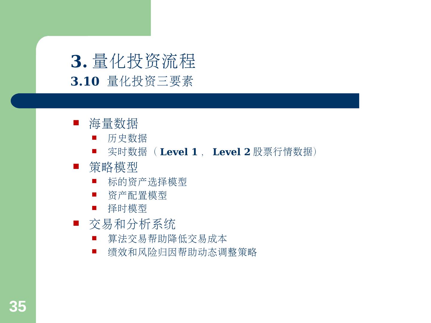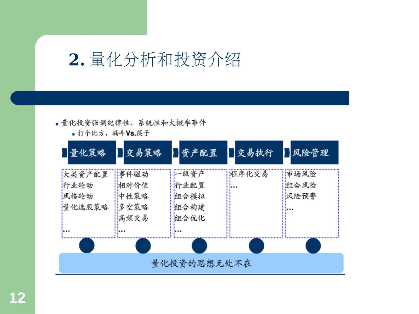 投资策略趋向复杂,组合构建和仓位变动需要复杂计算。 .... Close); 跨市场,多资产:股票,期货等; FIX引擎:DMA(Direct Market Access)交易指令.