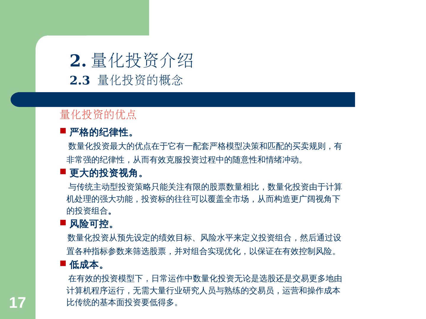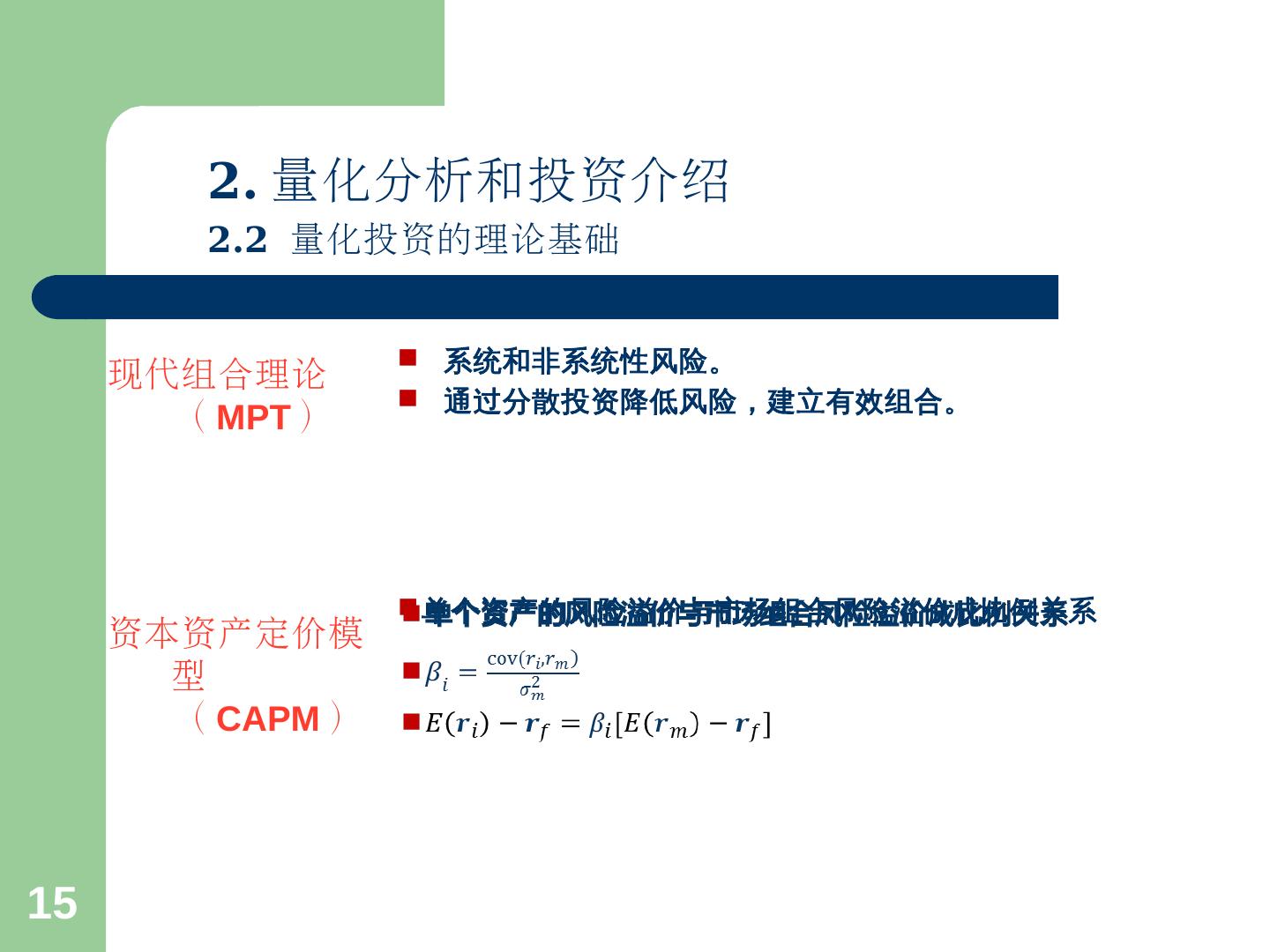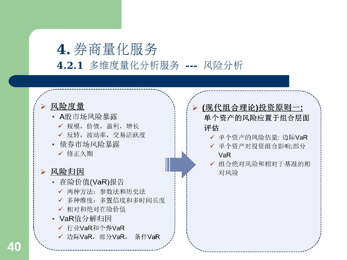 投资策略趋向复杂,组合构建和仓位变动需要复杂计算。 .... Close); 跨市场,多资产:股票,期货等; FIX引擎:DMA(Direct Market Access)交易指令.