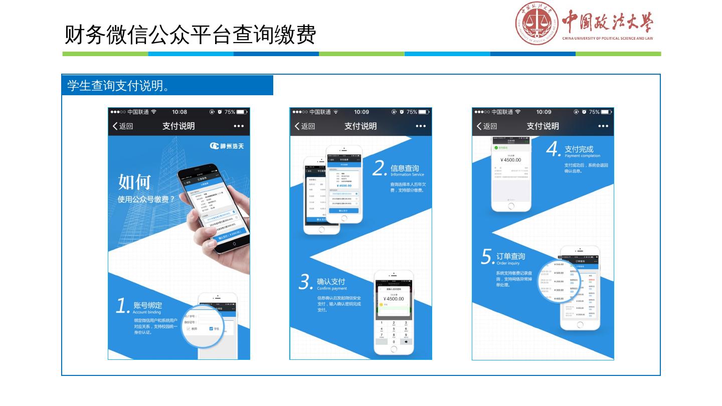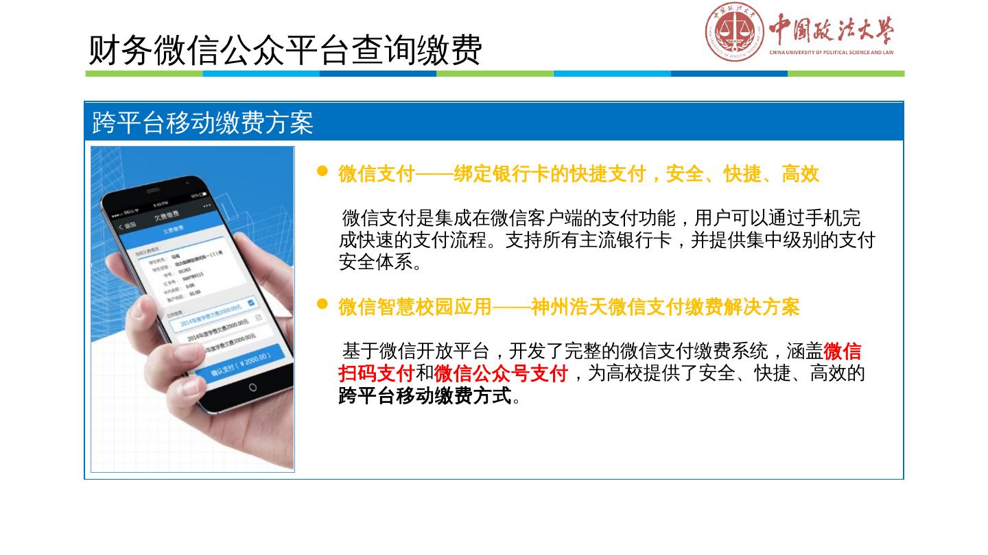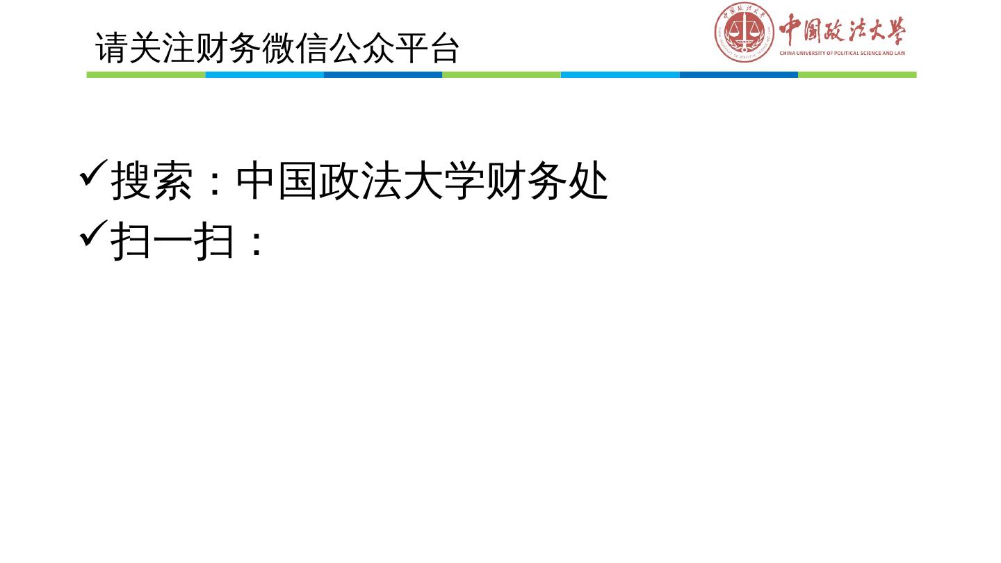 财务微信公众平台查询功能介绍. 04 ... 网络预约报销—支付方式(对私) ... 微信支付支持跨行跨地区缴费,并承诺对公立院校缴费费率始终为零,在第三方支付行业中 ...