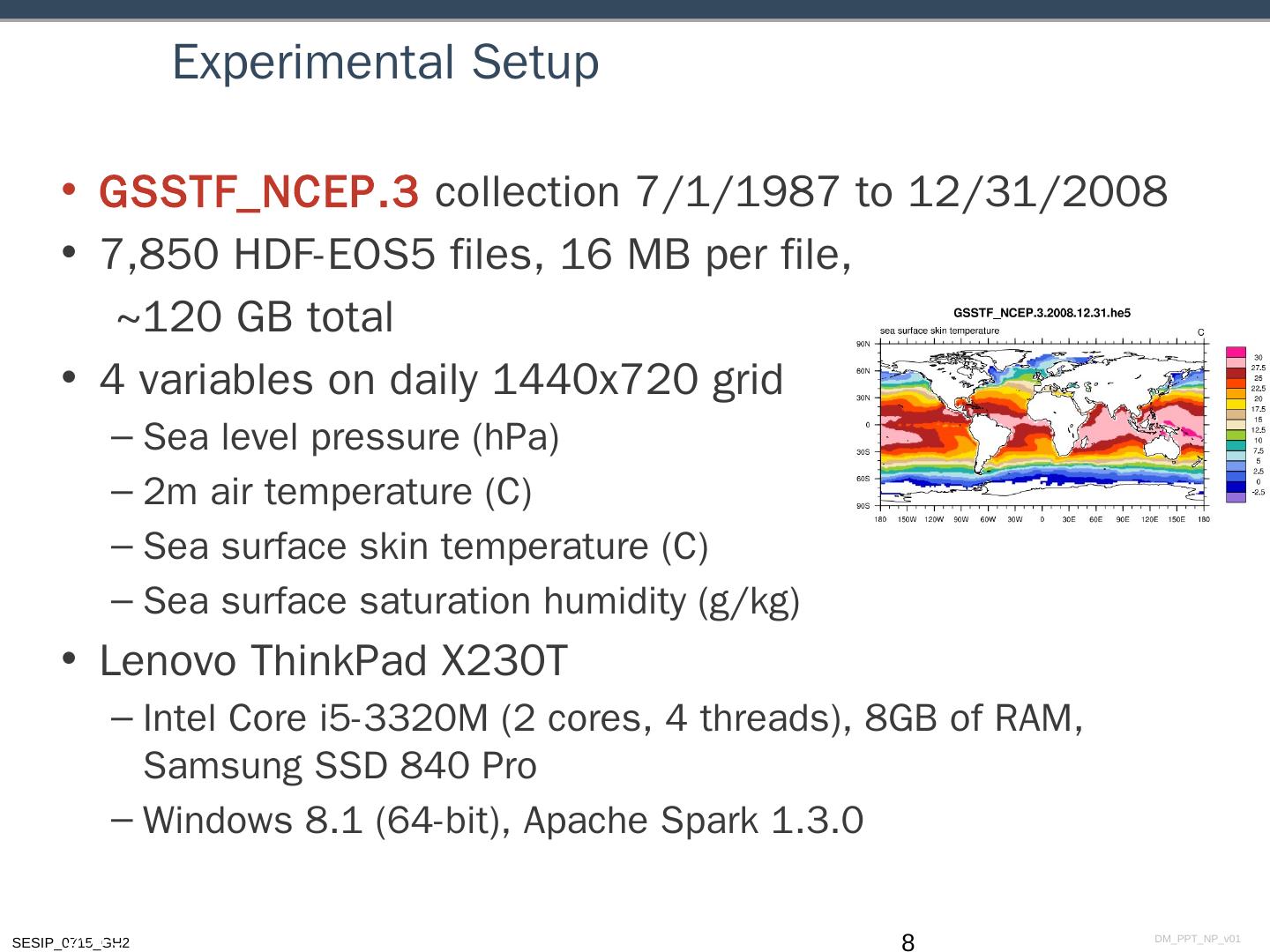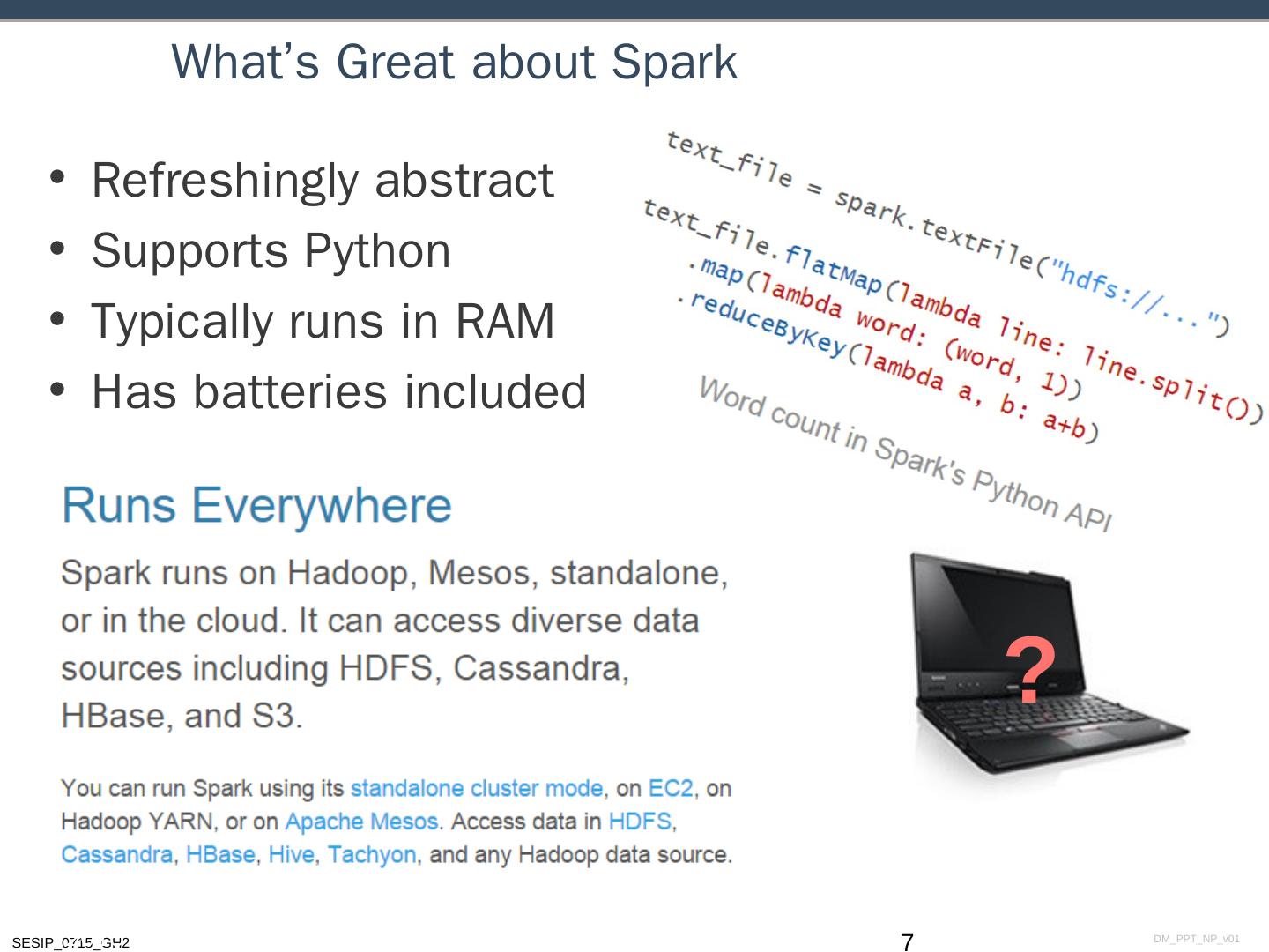 Lenovo ThinkPad X230T. Intel Core i5-3320M (2 cores, 4 threads), 8GB of RAM, Samsung SSD 840 Pro; Windows 8.1 (64-bit), Apache Spark 1.3.0. 8.