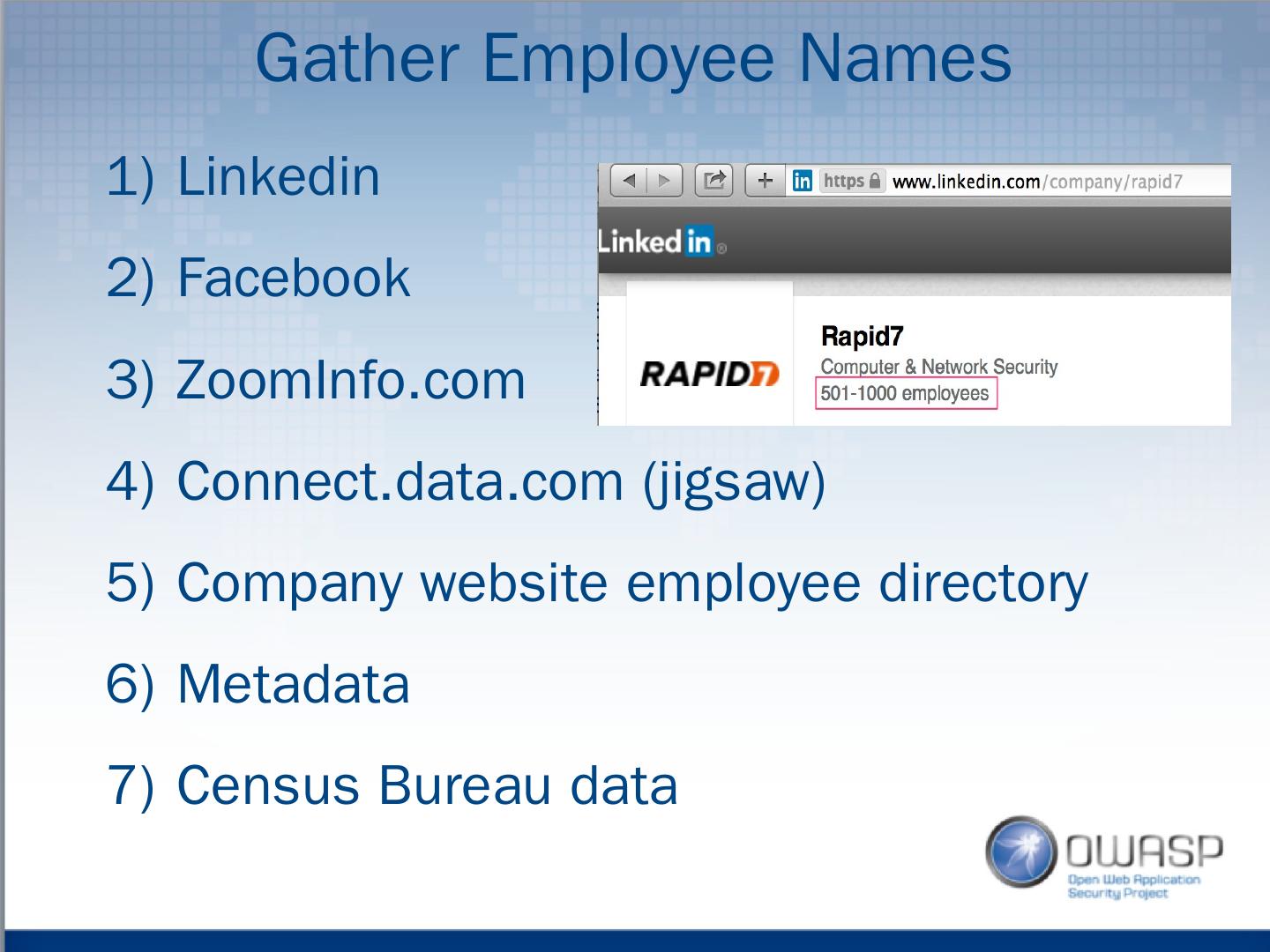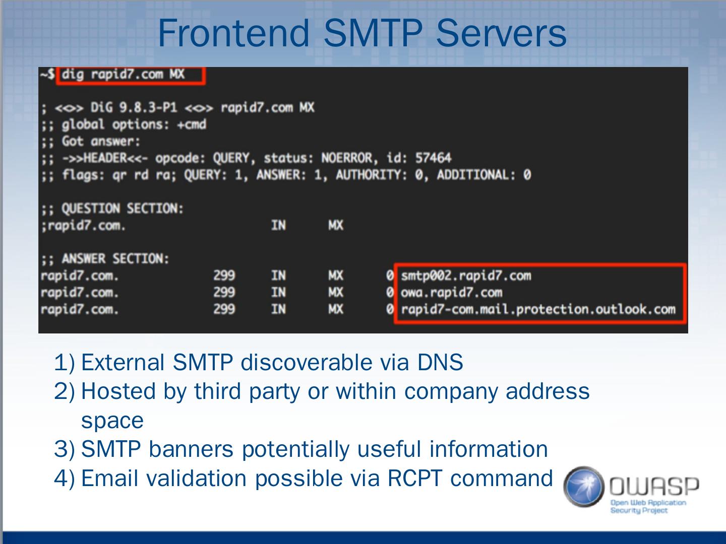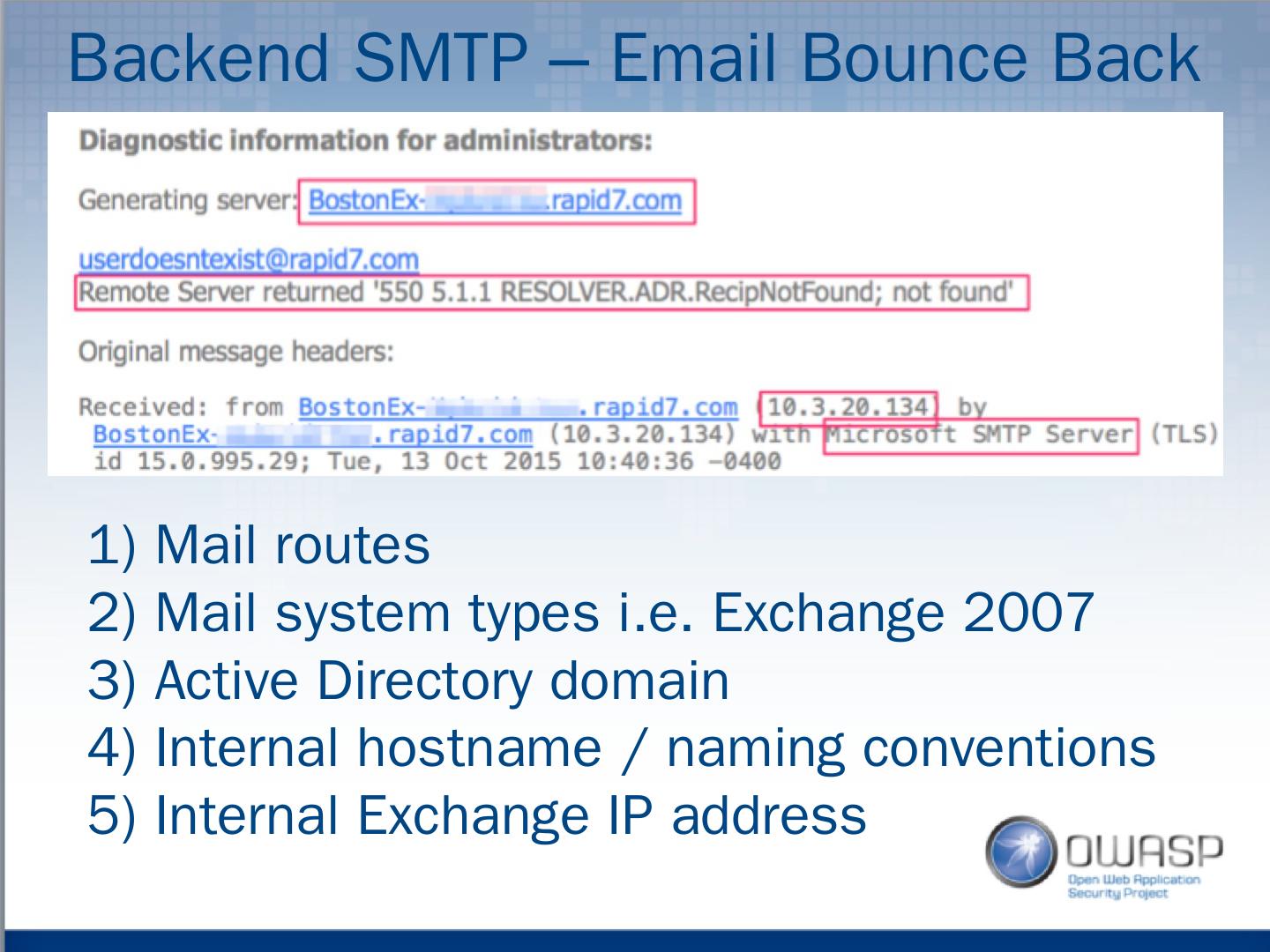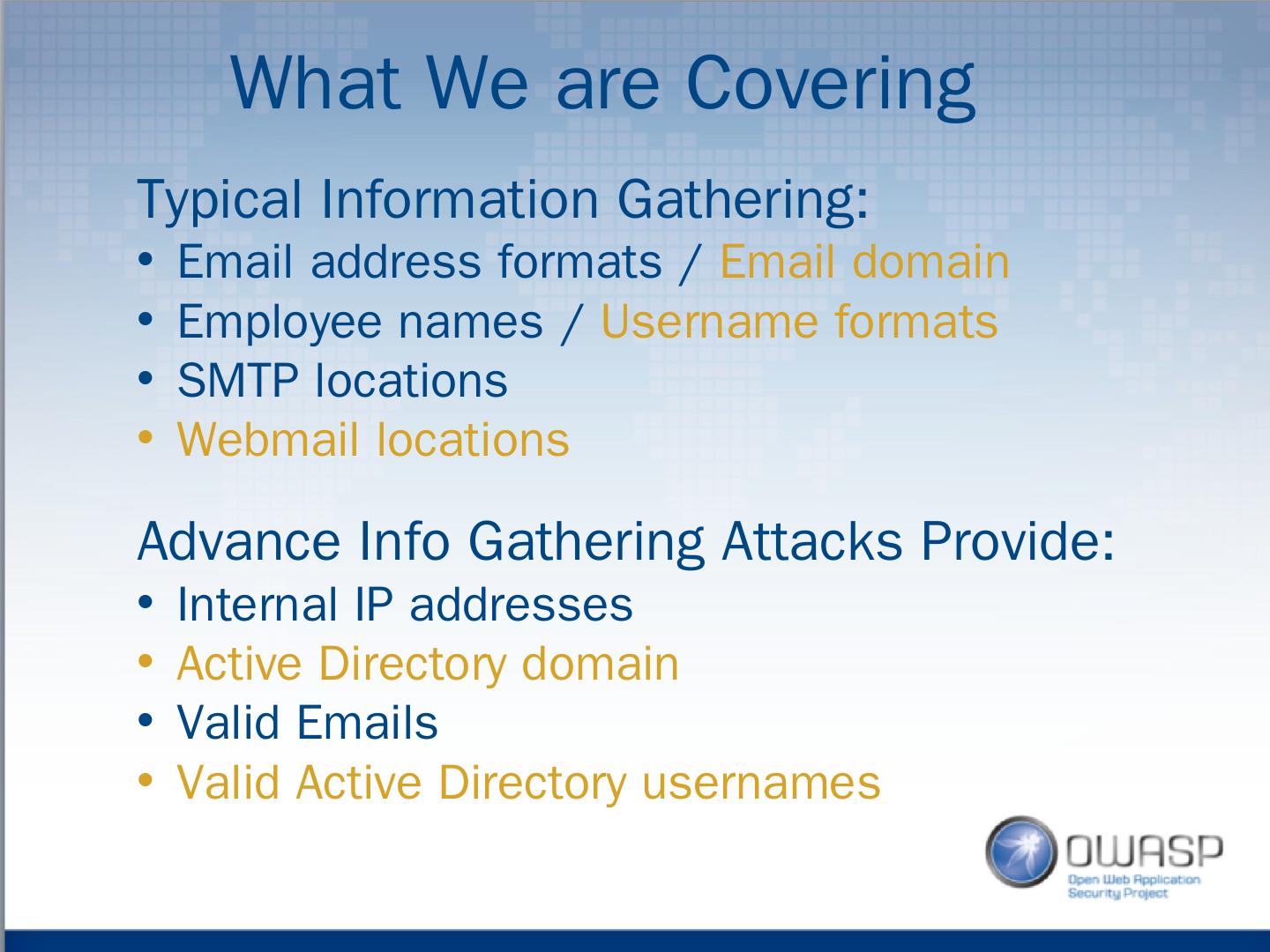 Email address formats / Email domain; Employee names / Username formats; SMTP locations; Webmail locations. Advance Info Gathering Attacks Provide:.
