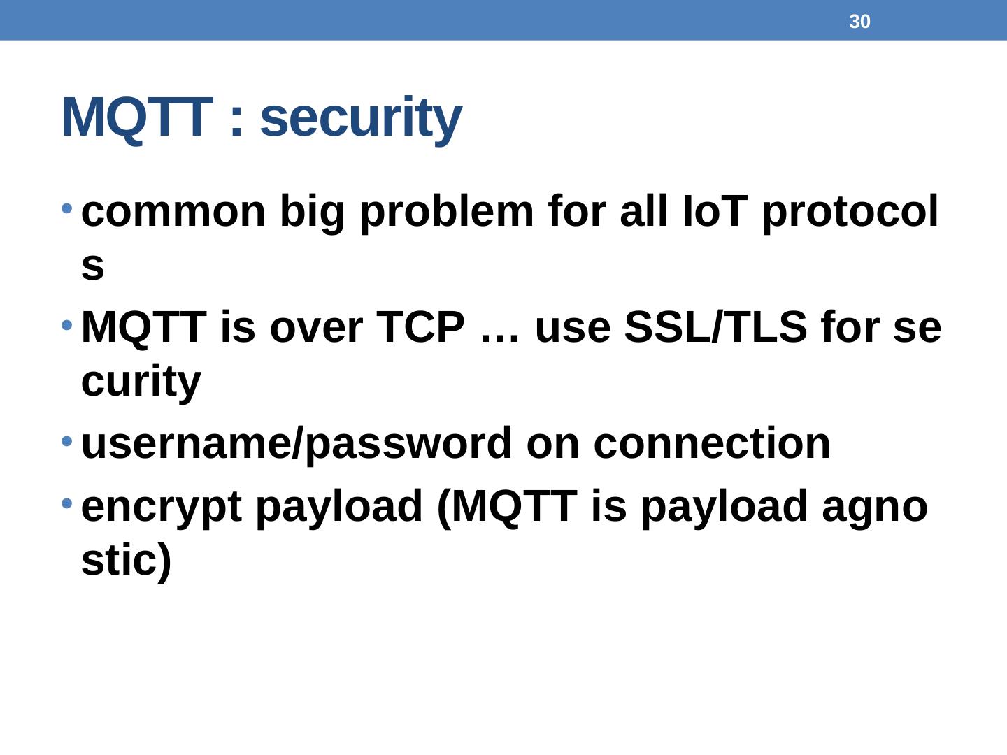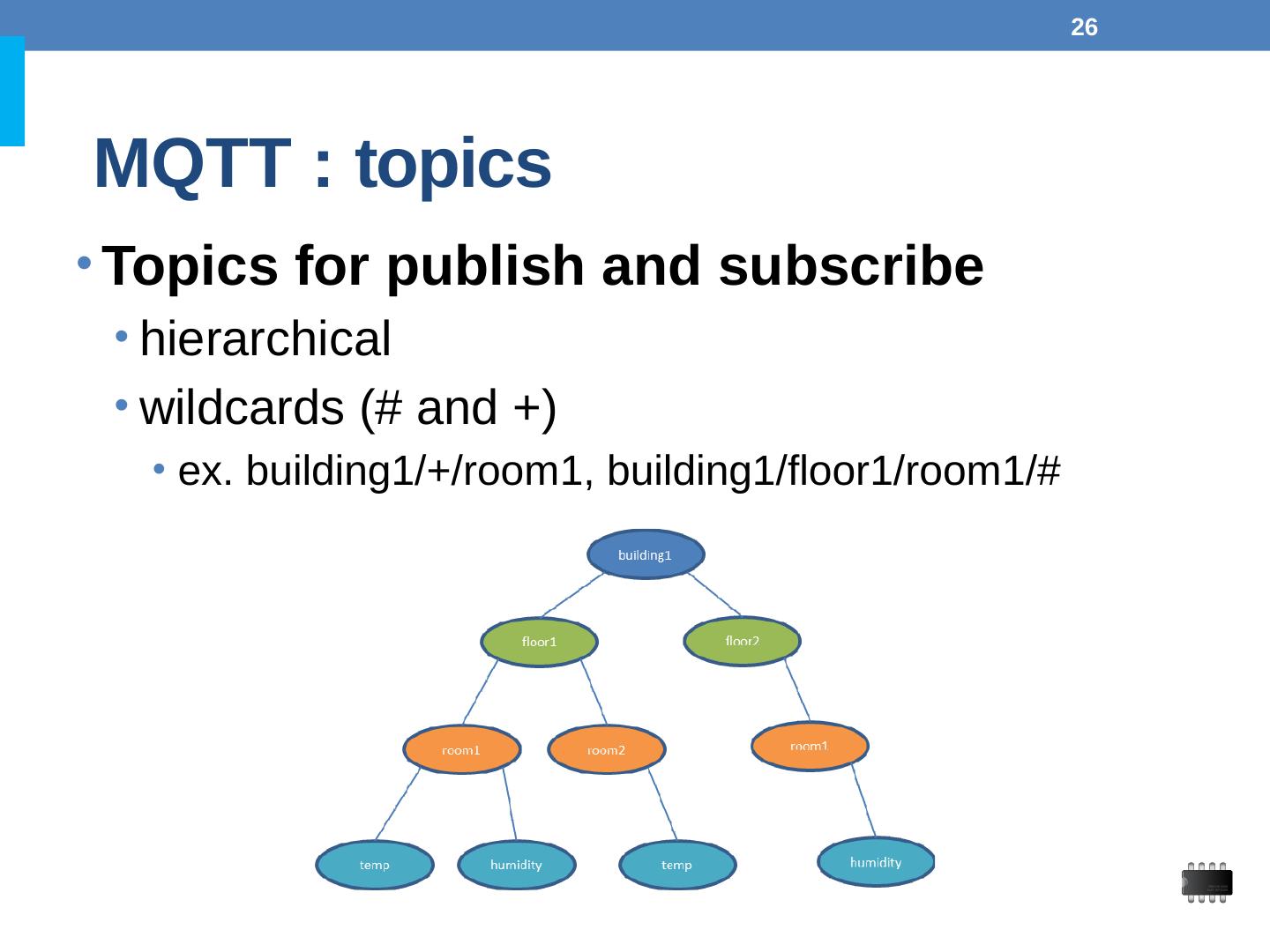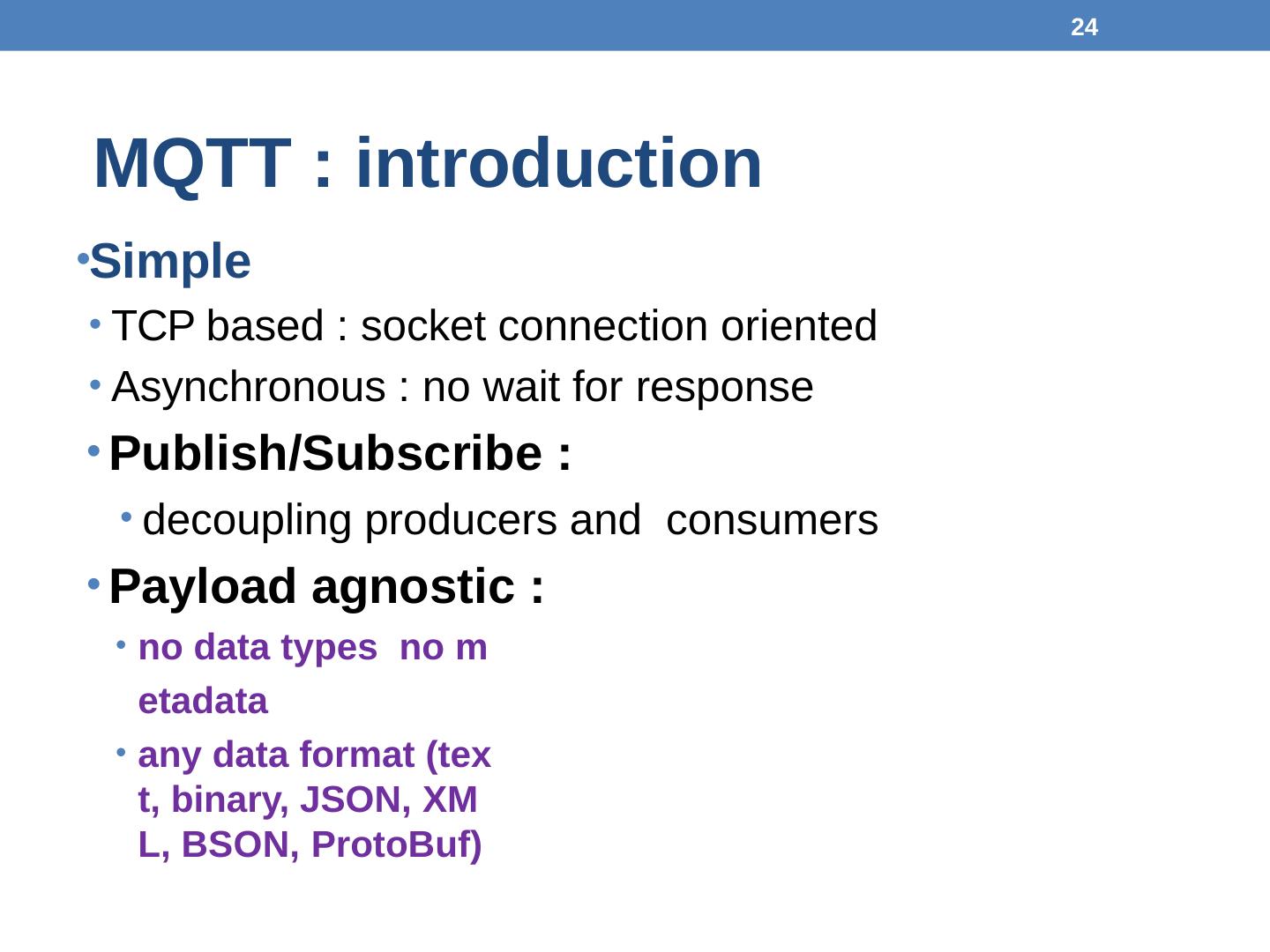 any data format (text, binary, JSON, XML, BSON, ProtoBuf). 24. MQTT : publish/subscribe. Broker and connected Clients. broker receives subscriptions from ...