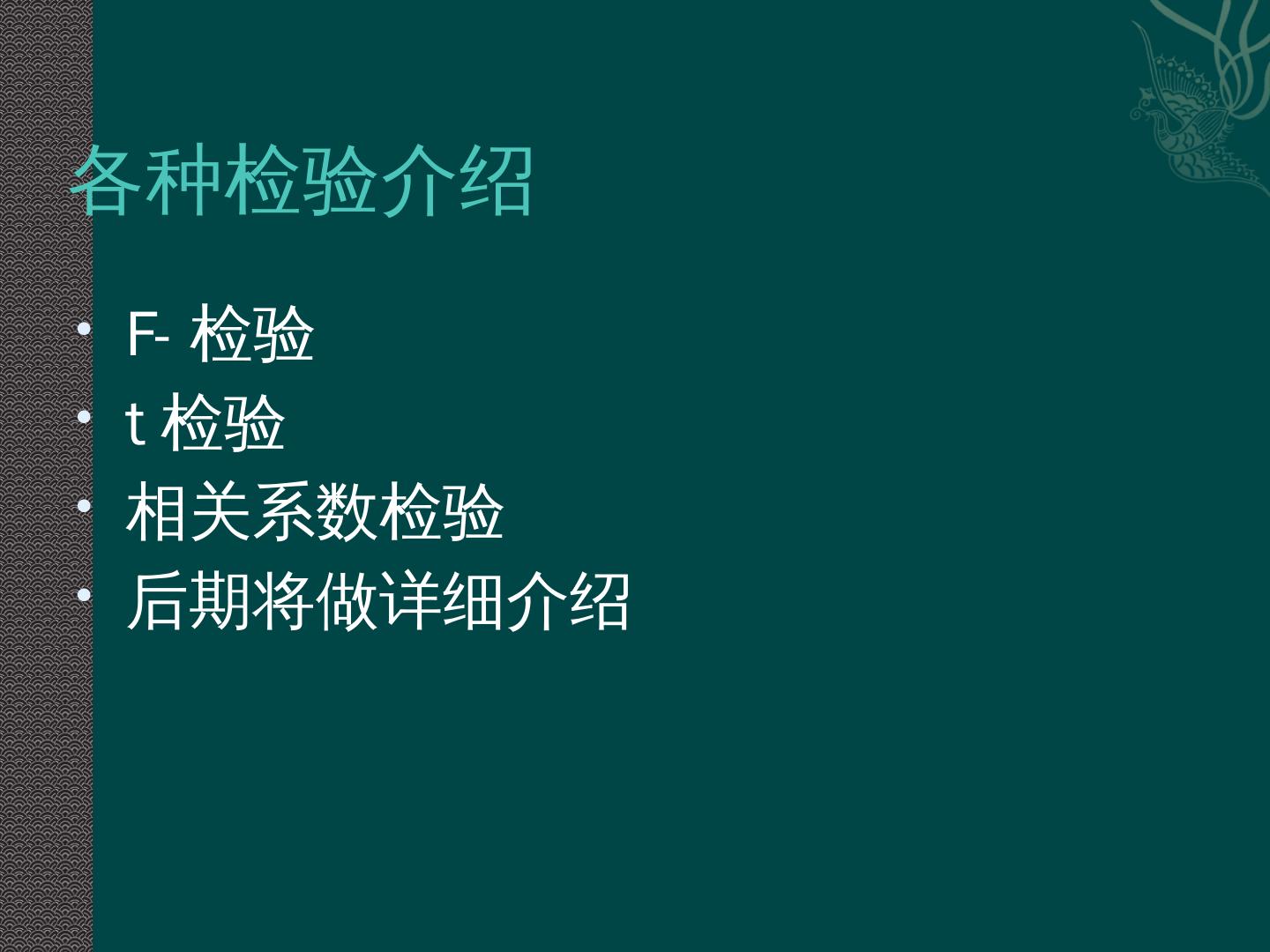 描述性数据分析; 假设检验; 主成分分析; 线性回归模型. 描述性数据分析. 直方图、条形图; 概括统计量(平均数、中位数、众数、百分位数和四分位数、方差和标准差、极 ...