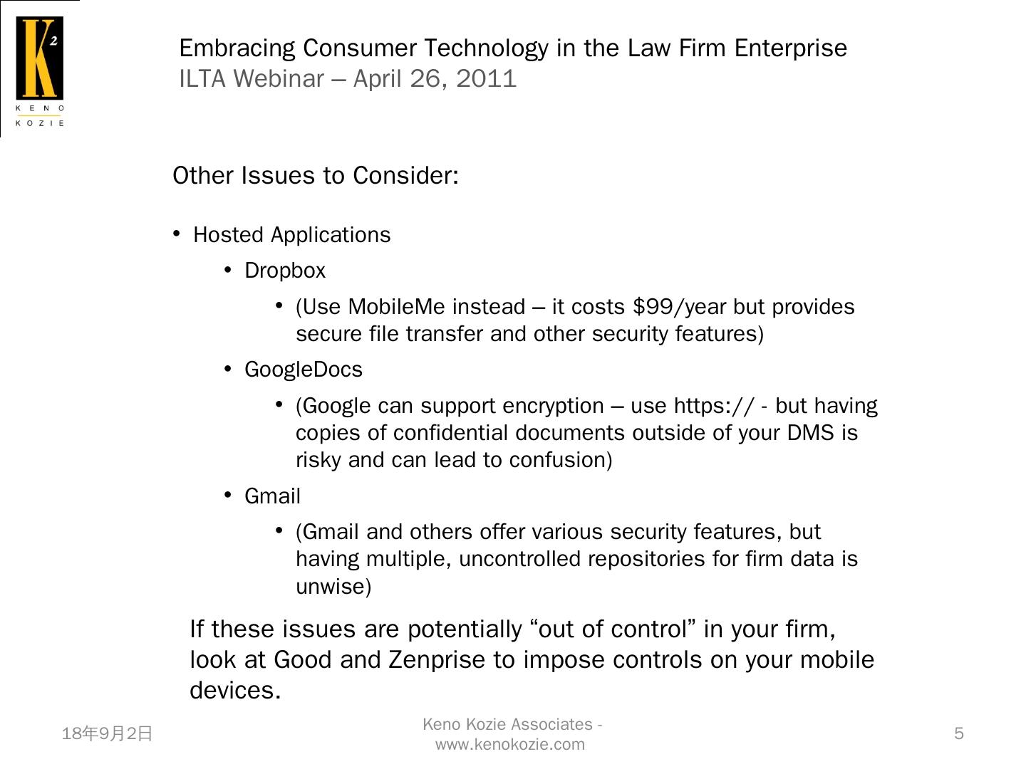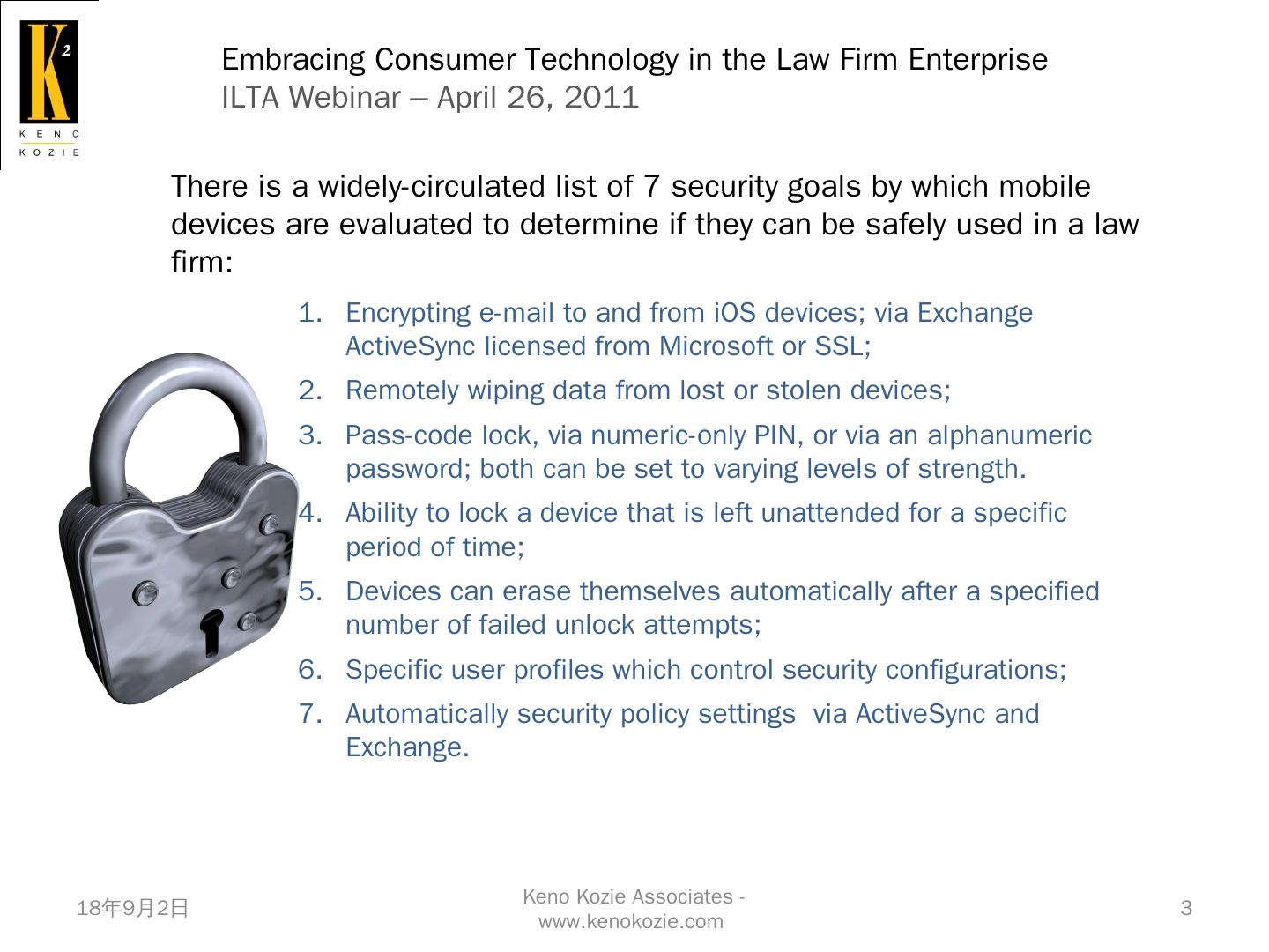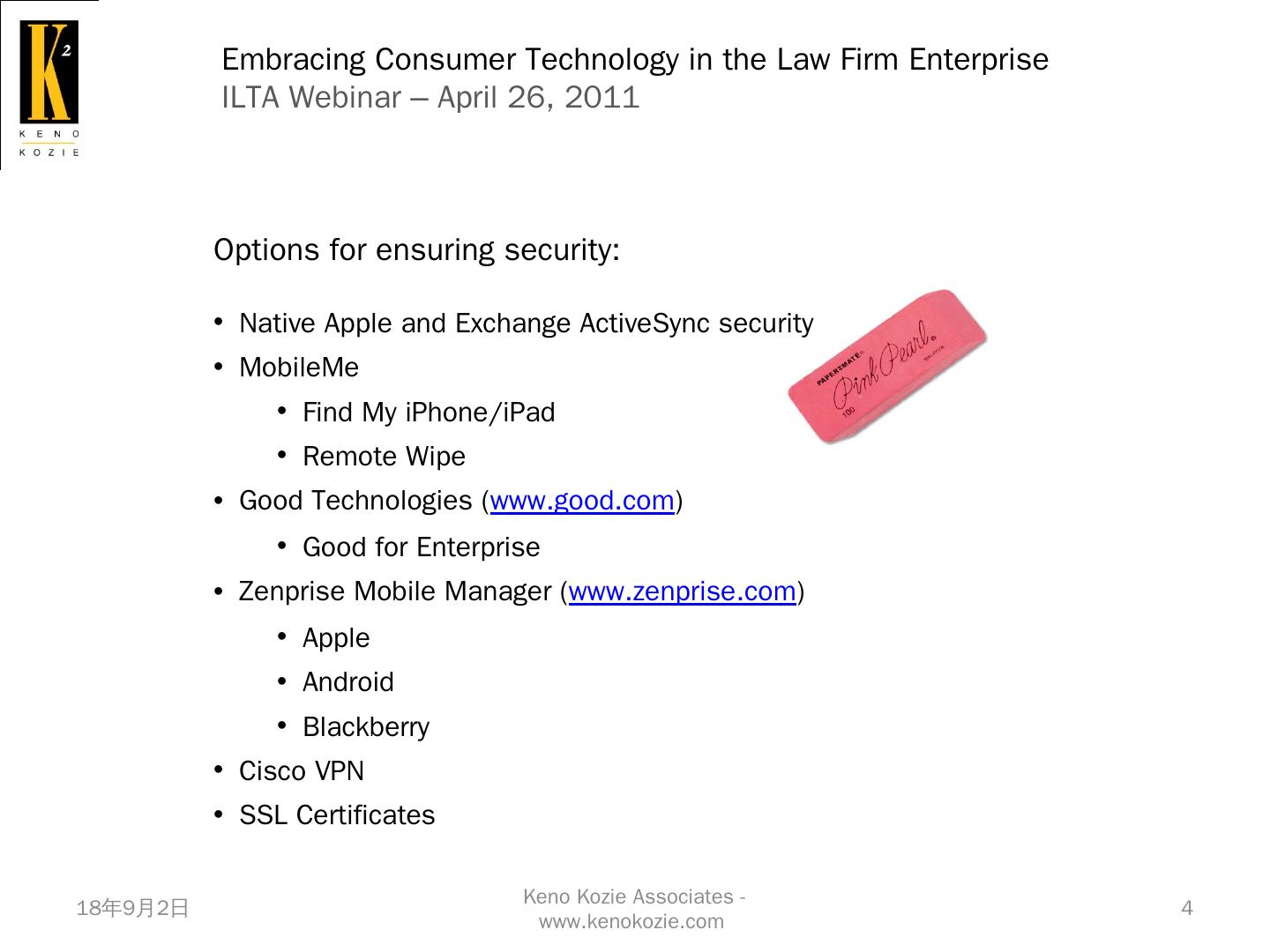 Native Apple and Exchange ActiveSync security; MobileMe. Find My iPhone/iPad; Remote Wipe. Good Technologies (www.good.com). Good for Enterprise.