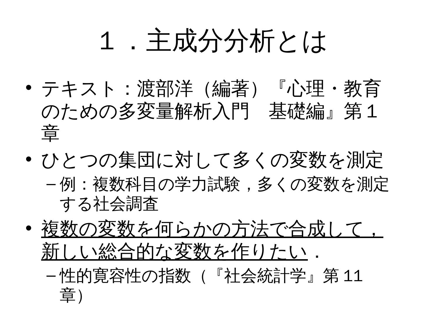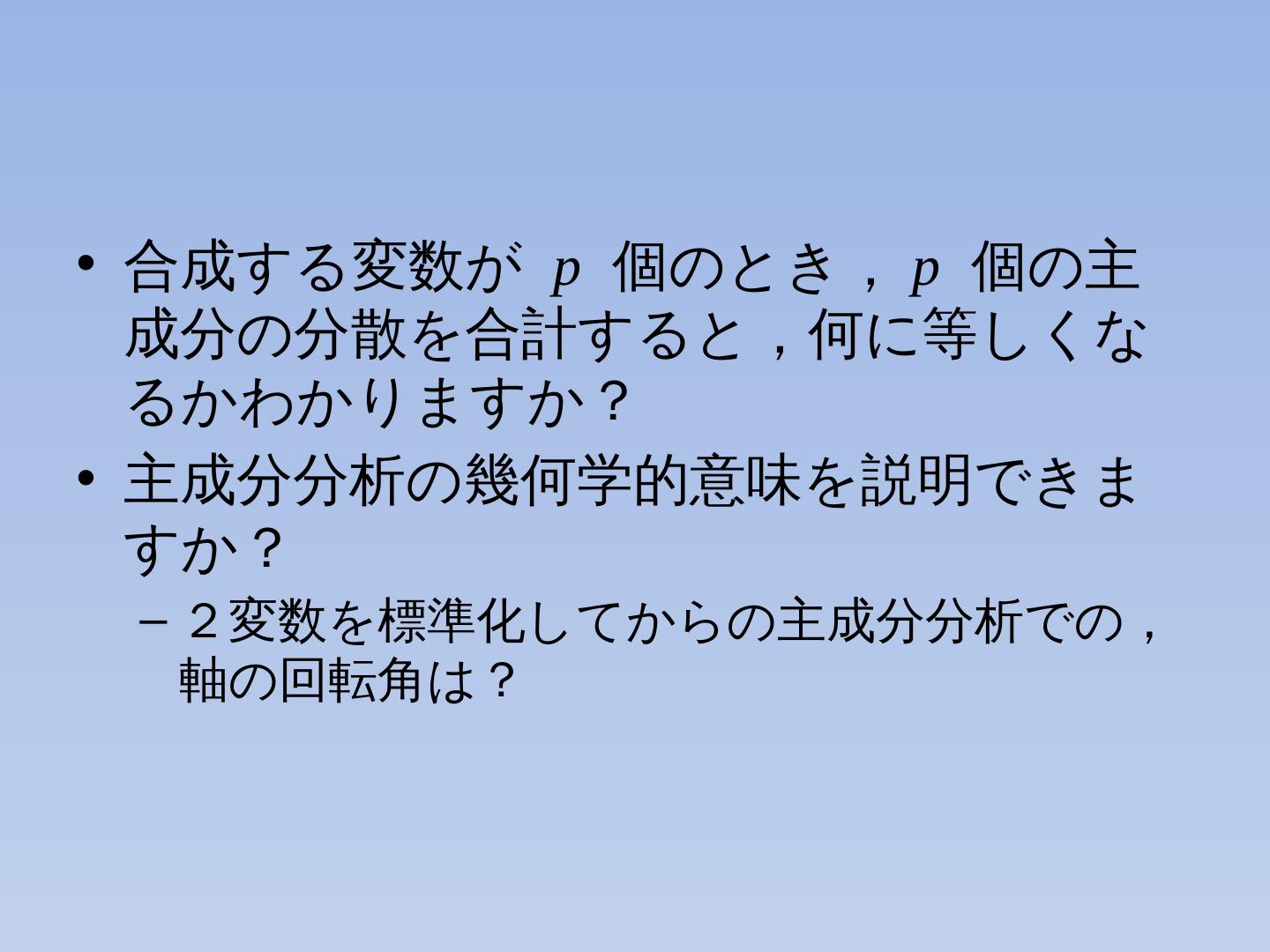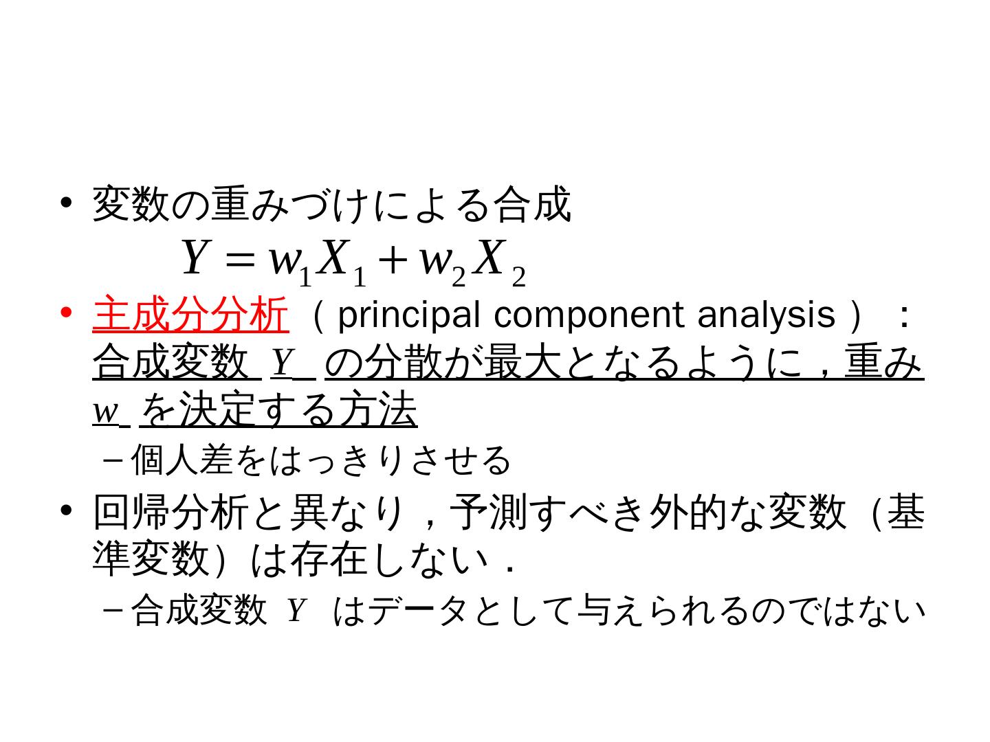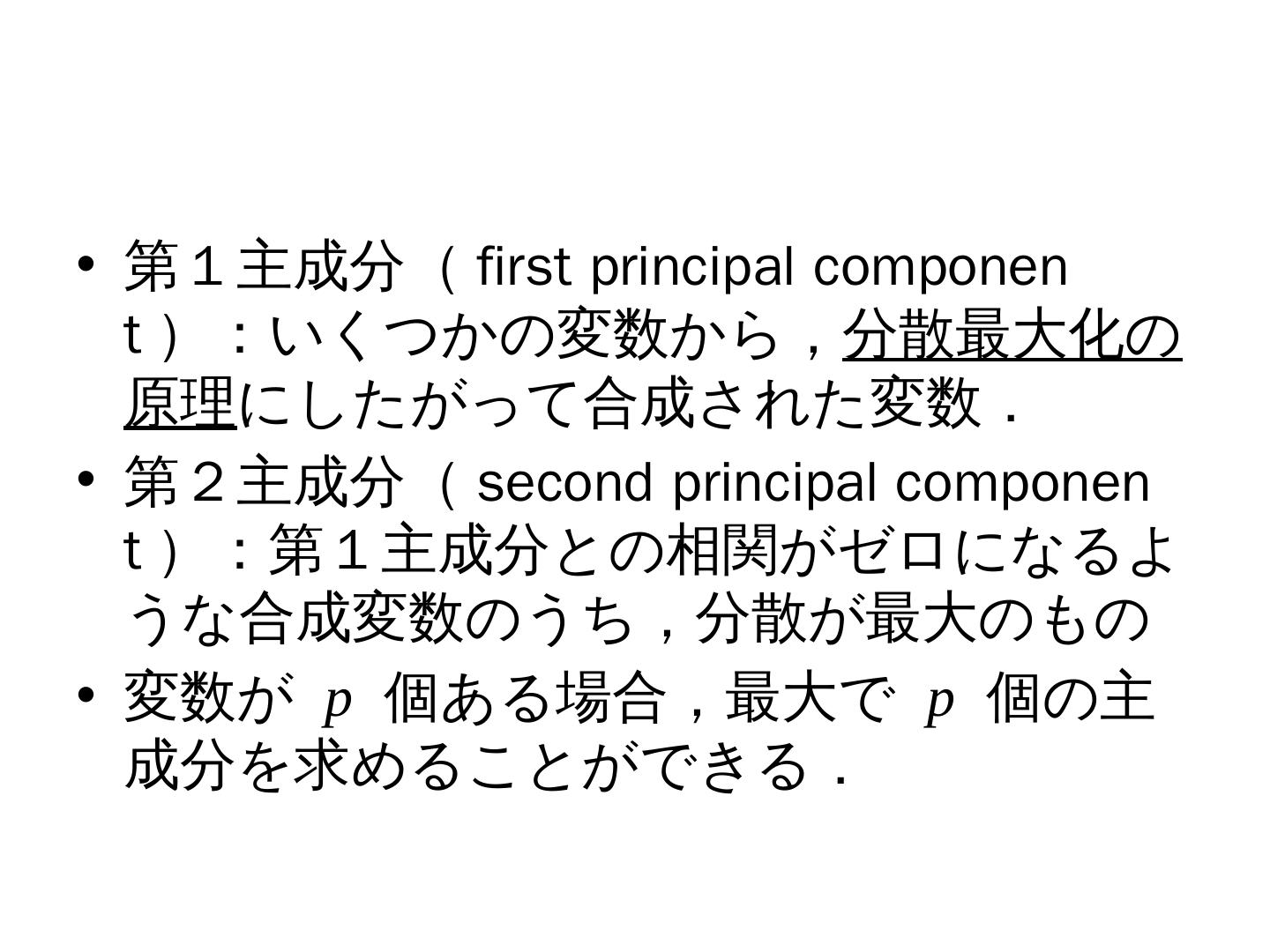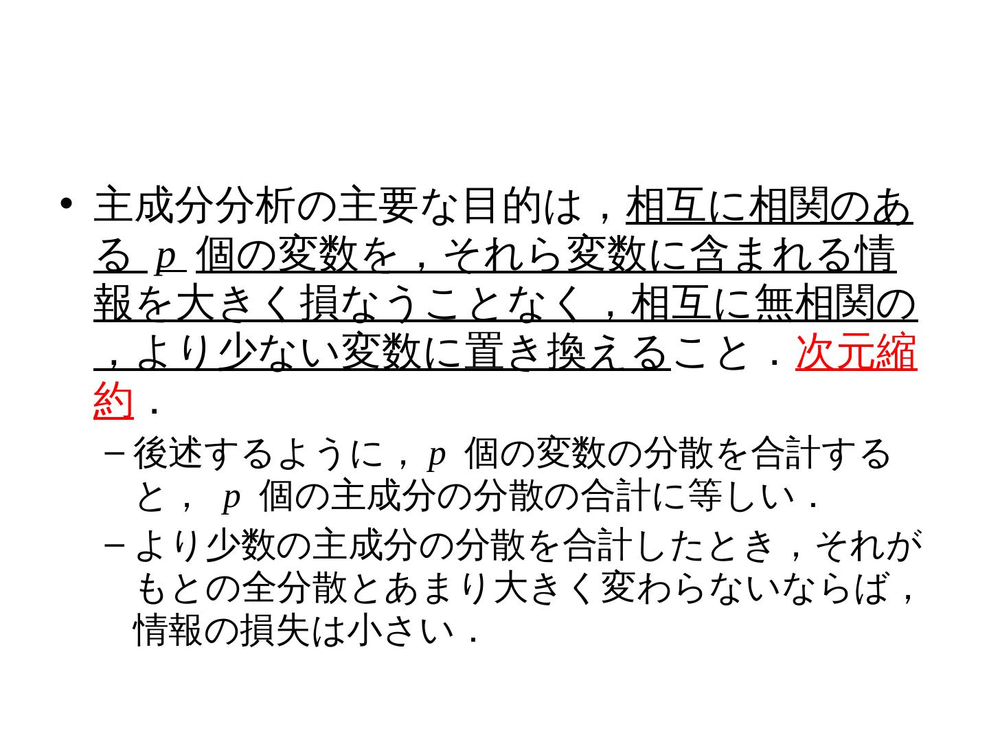 主成分分析の主要な目的は,相互に相関のある p 個の変数を,それら変数に含まれる情報を大きく損なうことなく,相互に無相関の,より少ない変数に置き換えること.