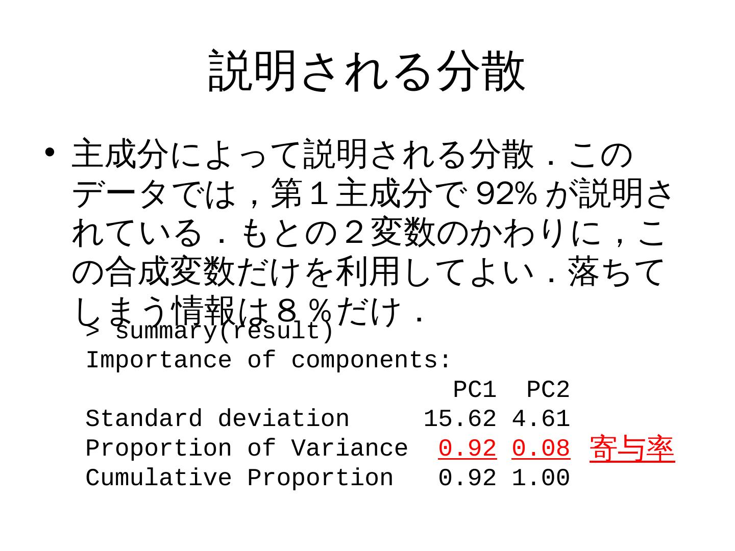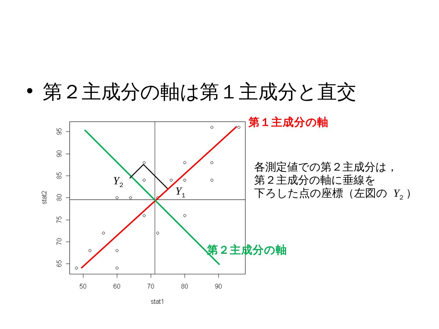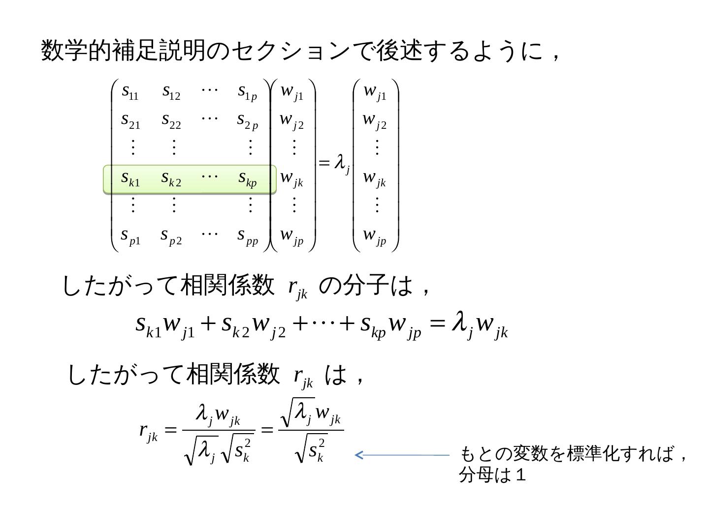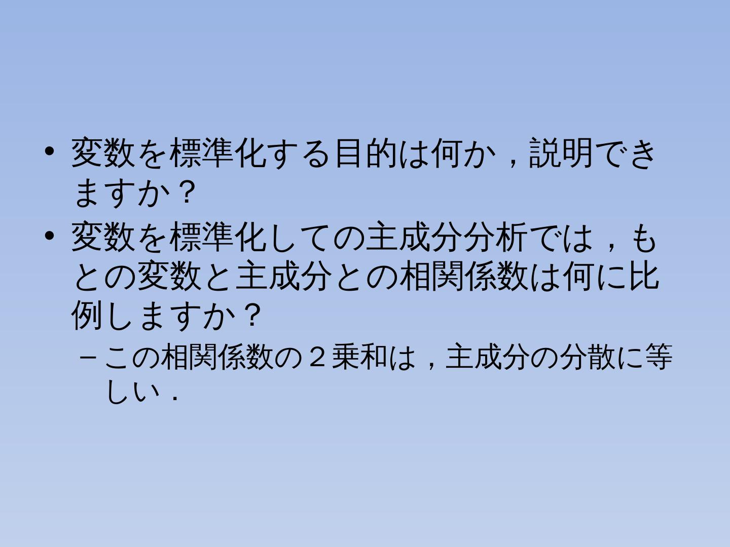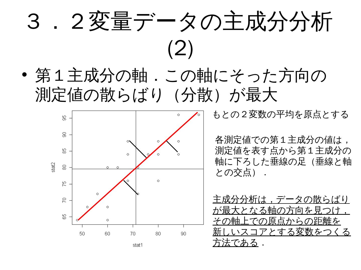 主成分分析の主要な目的は,相互に相関のある p 個の変数を,それら変数に含まれる情報を大きく損なうことなく,相互に無相関の,より少ない変数に置き換えること.