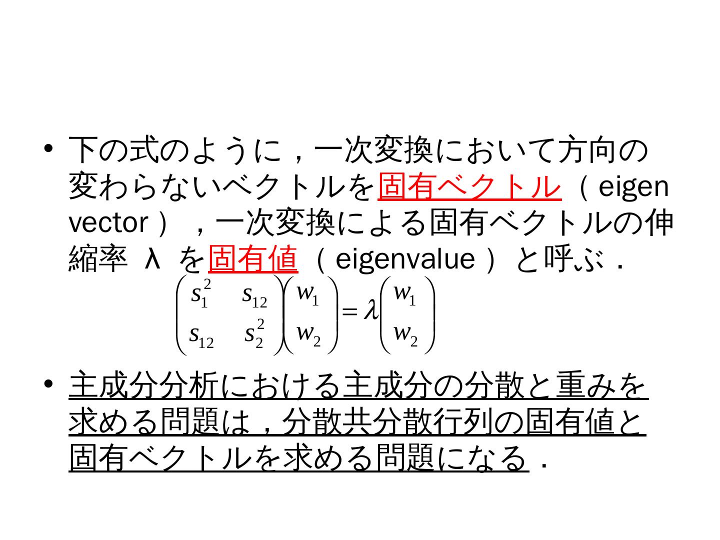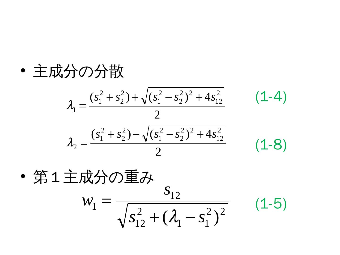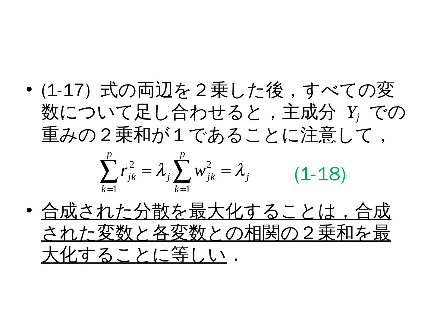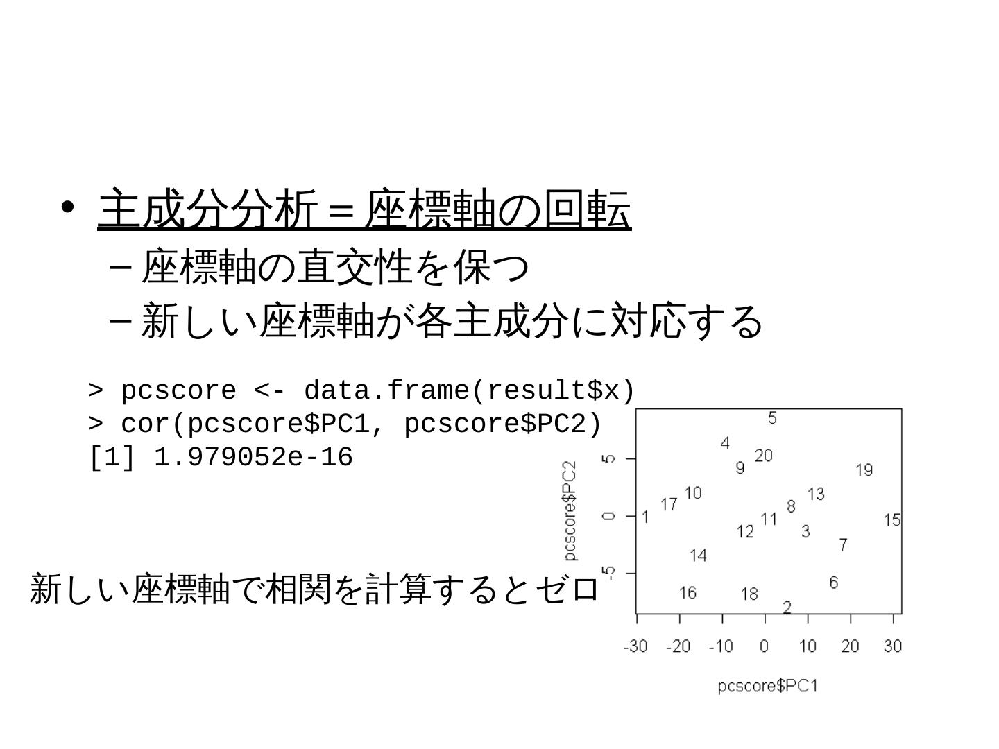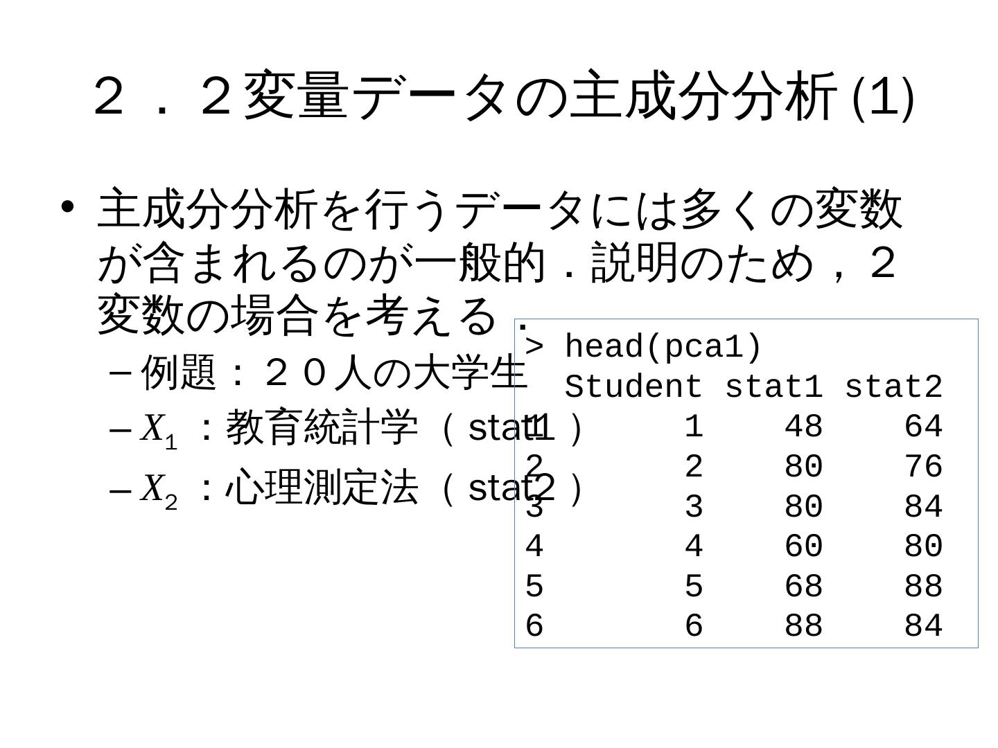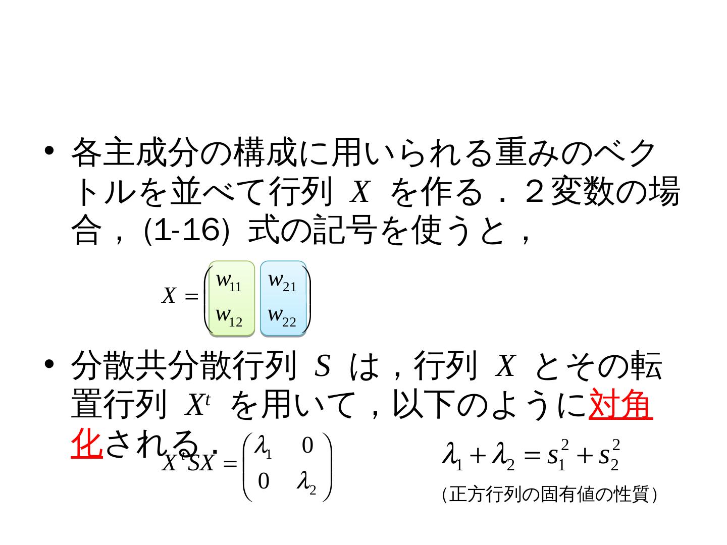 主成分分析の主要な目的は,相互に相関のある p 個の変数を,それら変数に含まれる情報を大きく損なうことなく,相互に無相関の,より少ない変数に置き換えること.