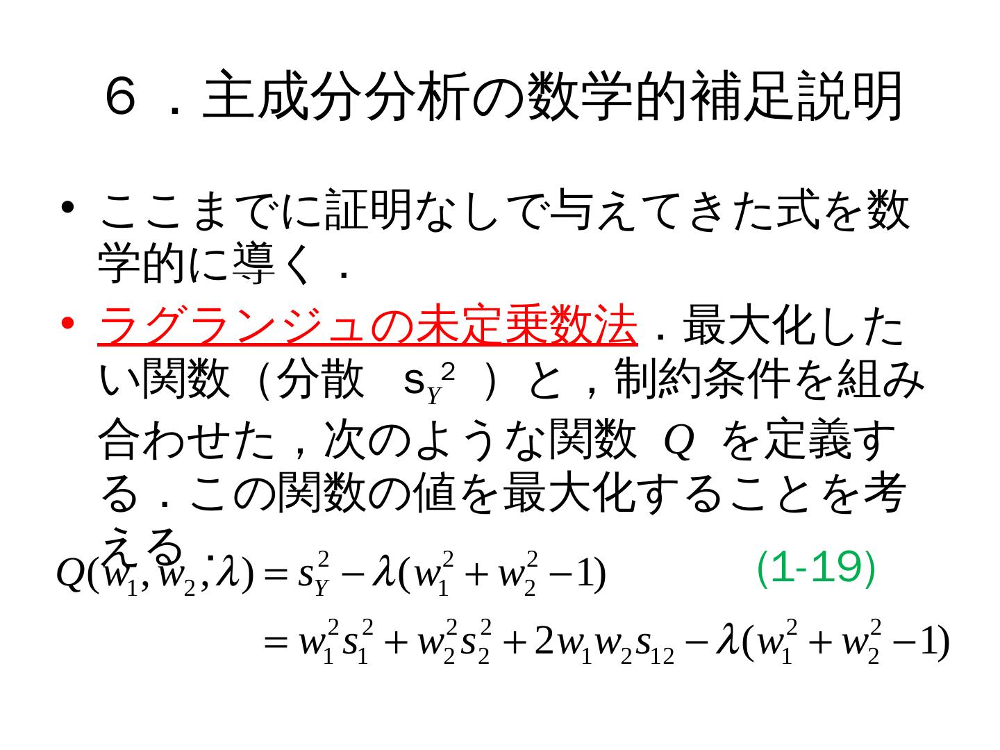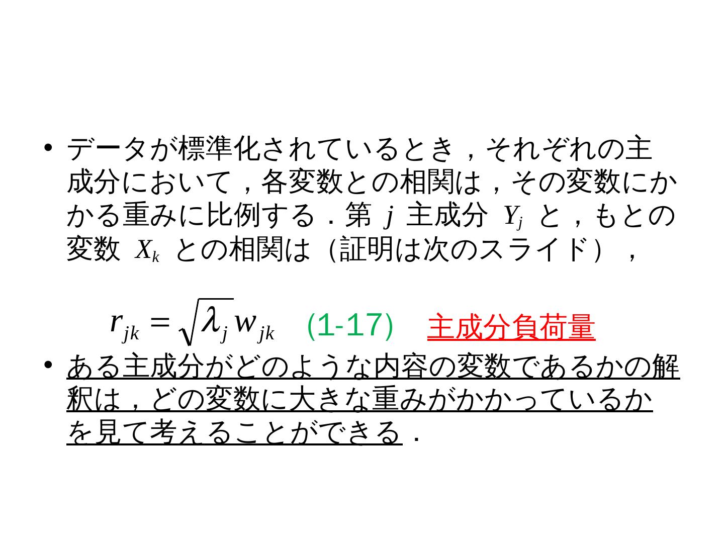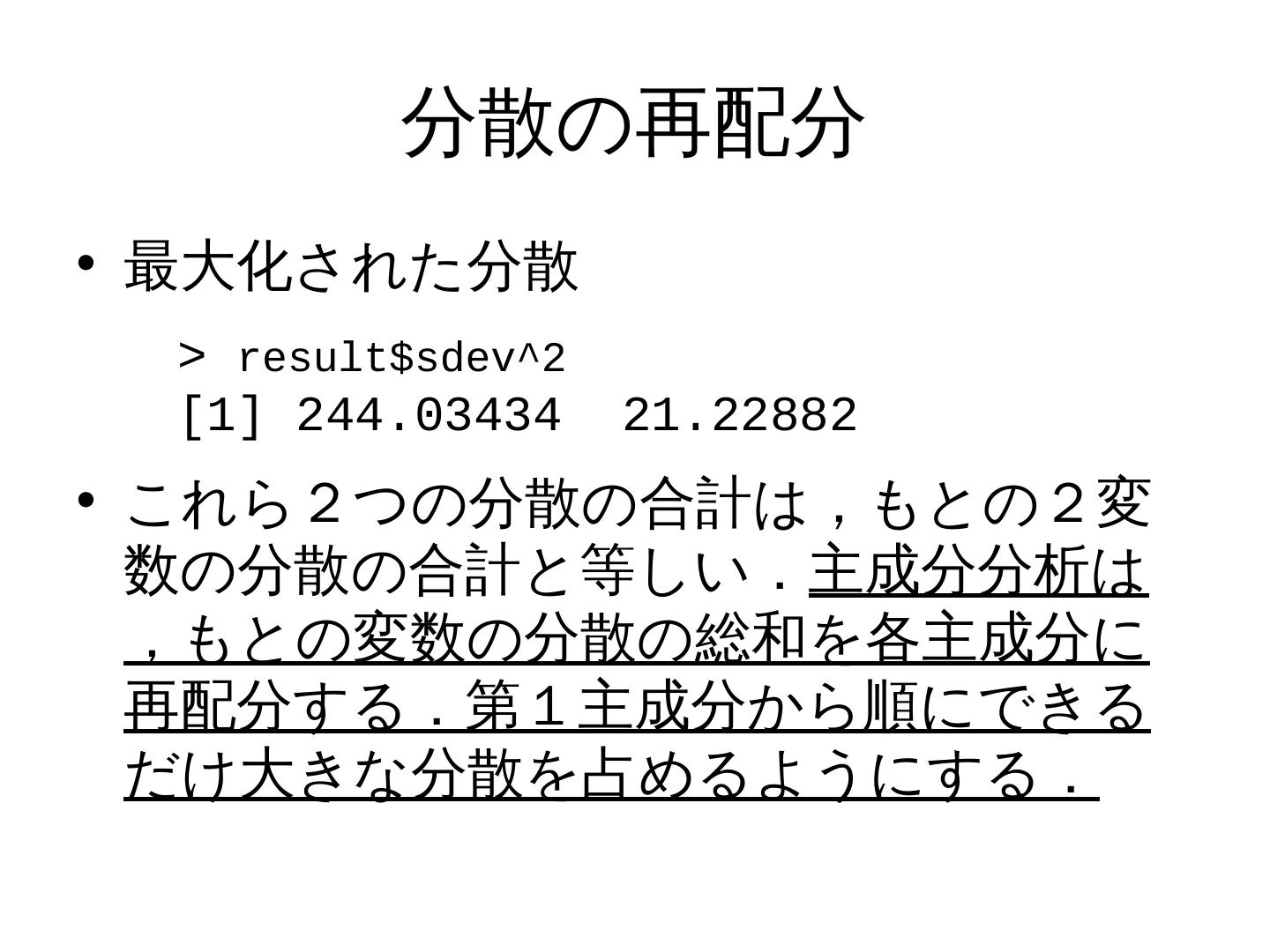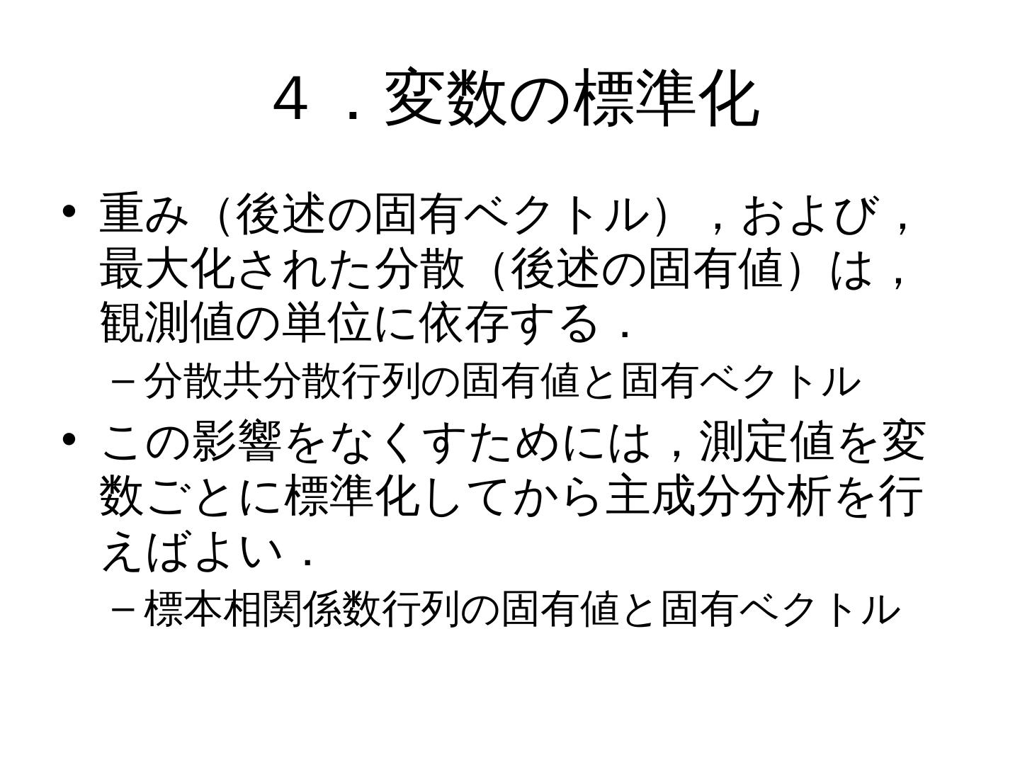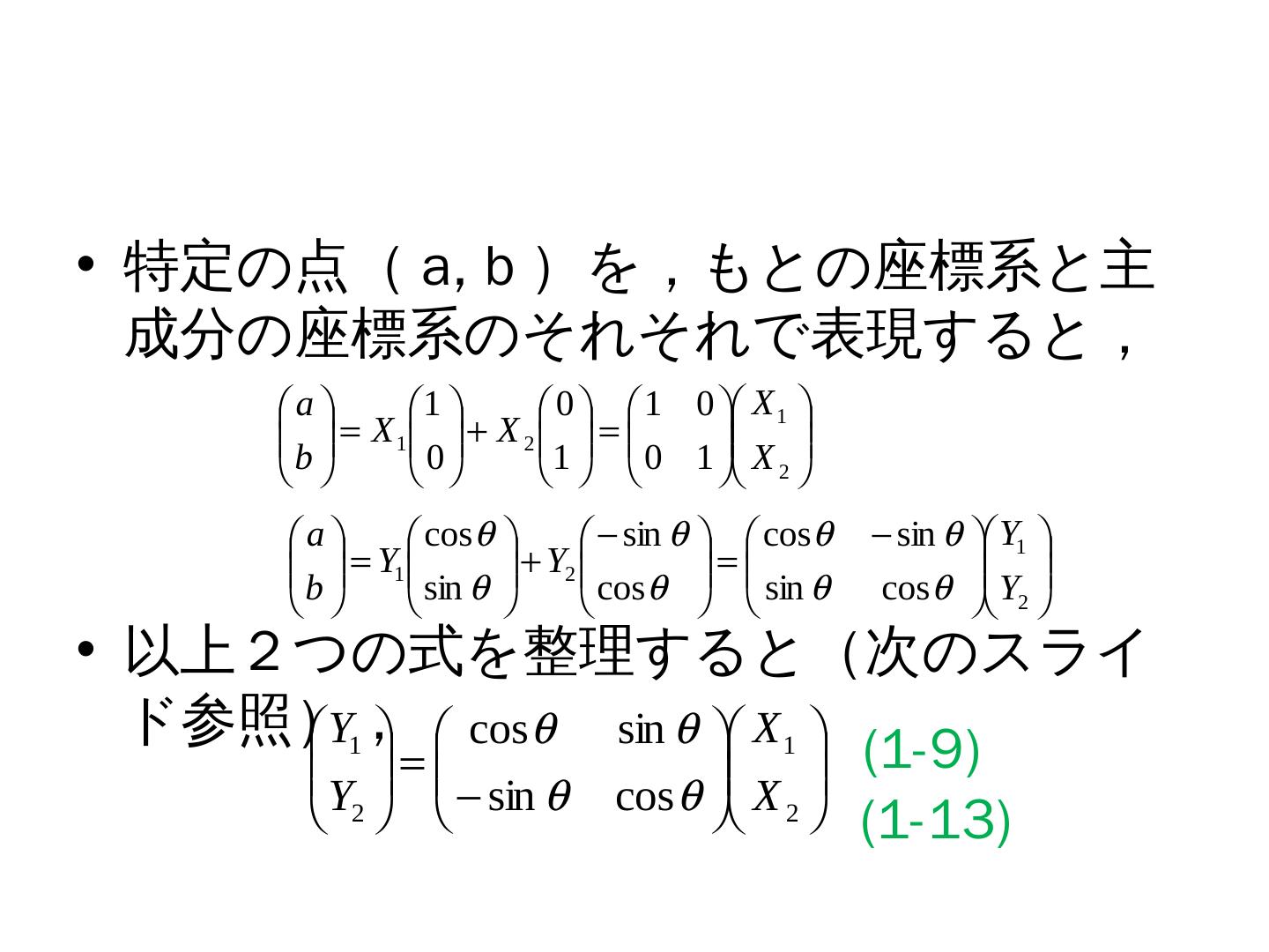 主成分分析の主要な目的は,相互に相関のある p 個の変数を,それら変数に含まれる情報を大きく損なうことなく,相互に無相関の,より少ない変数に置き換えること.
