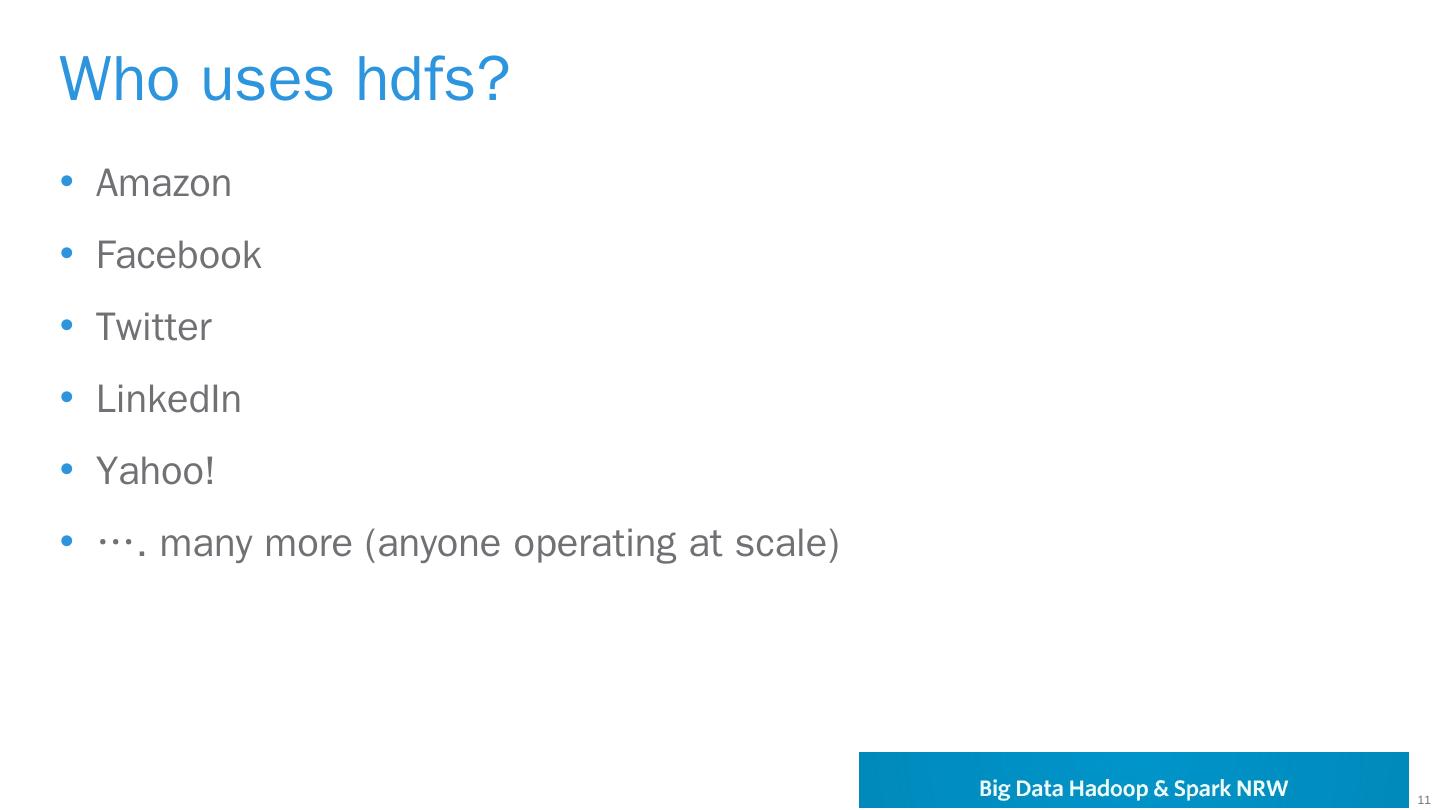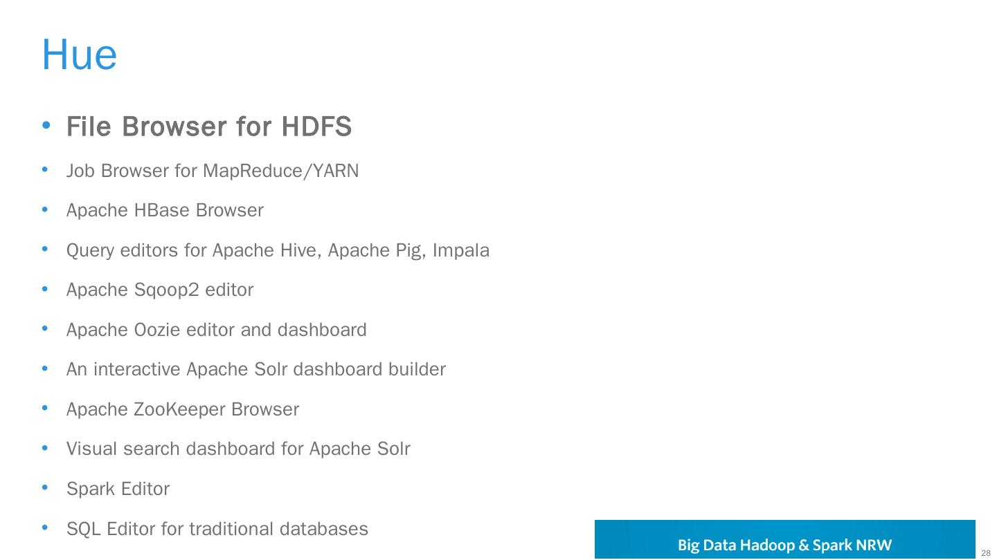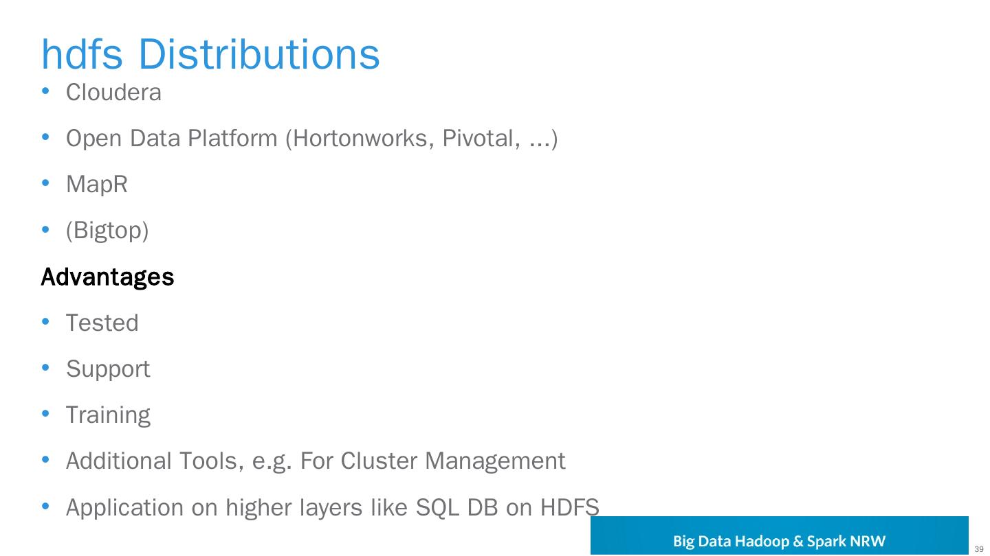 https://hadoop.apache.org/docs/r2.7.1/hadoop-project-dist/hadoop-hdfs/HdfsUserGuide.html. 28 ... Apache Ambari, Monitoring, Management ... MapR; (Bigtop).