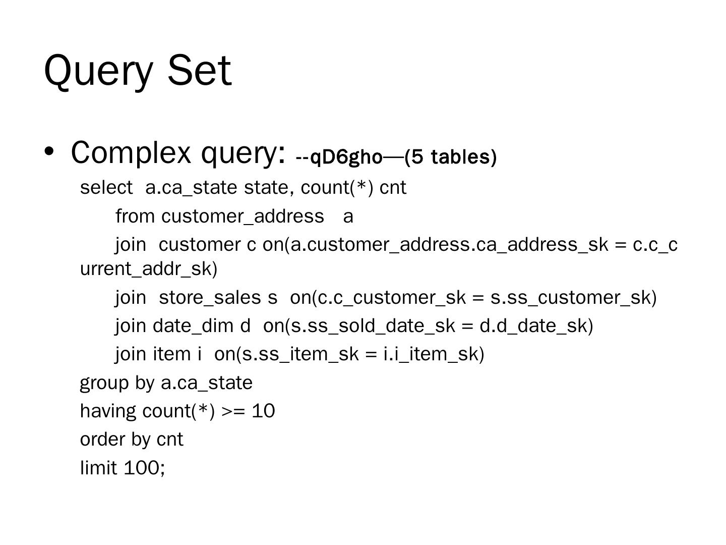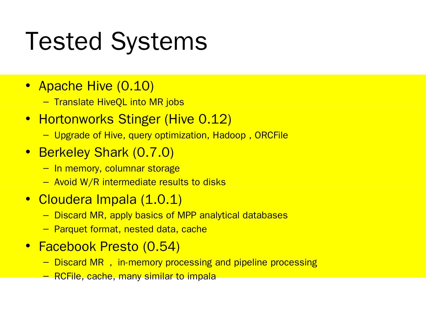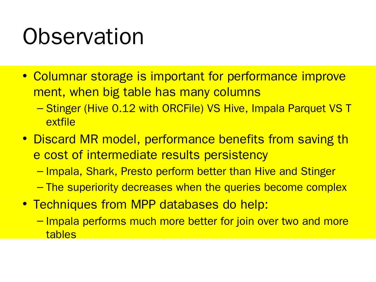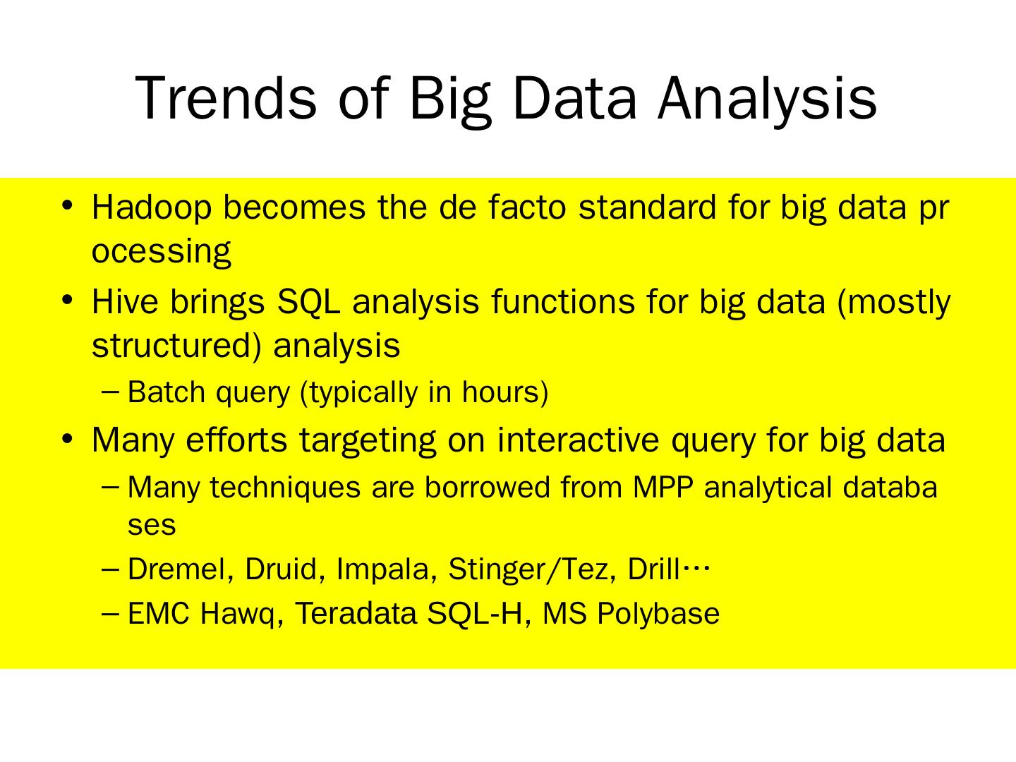 Many techniques are borrowed from MPP analytical databases; Dremel, Druid, Impala, Stinger/Tez, Drill… EMC Hawq ... Apache Hive (0.10). Translate HiveQL ...