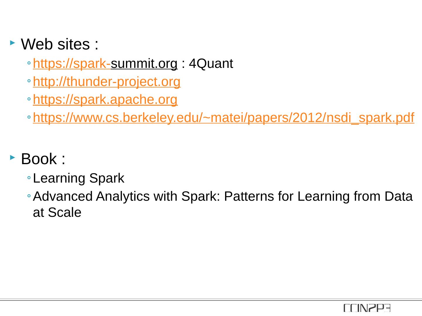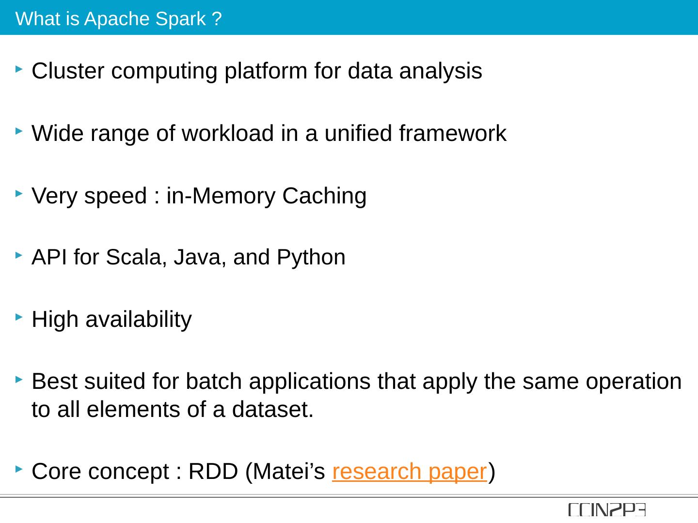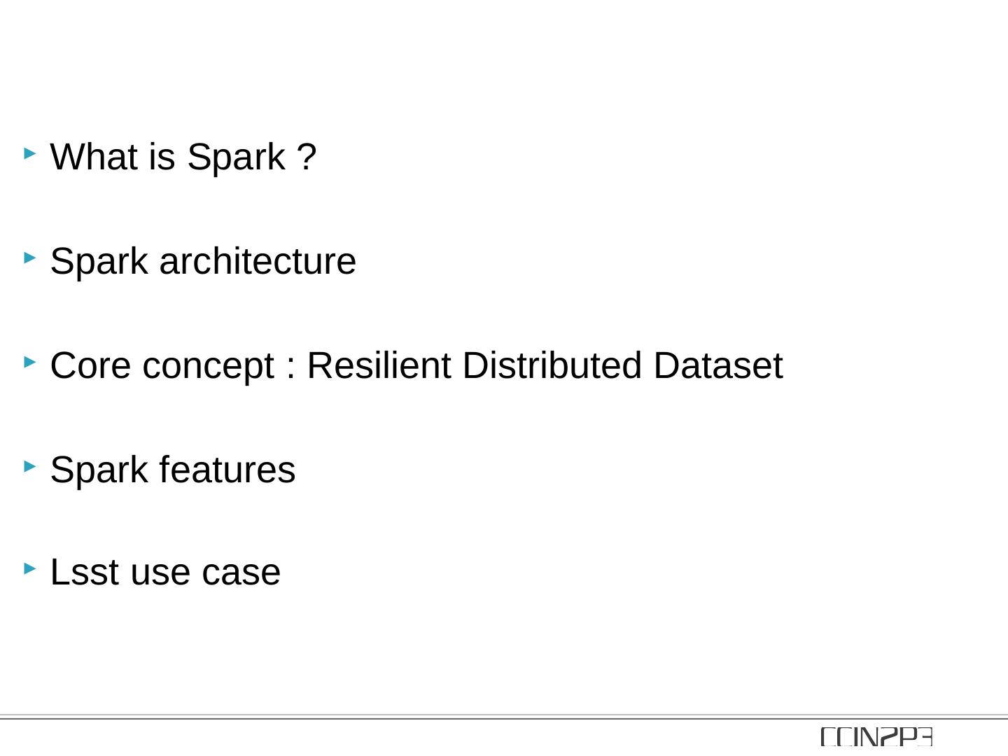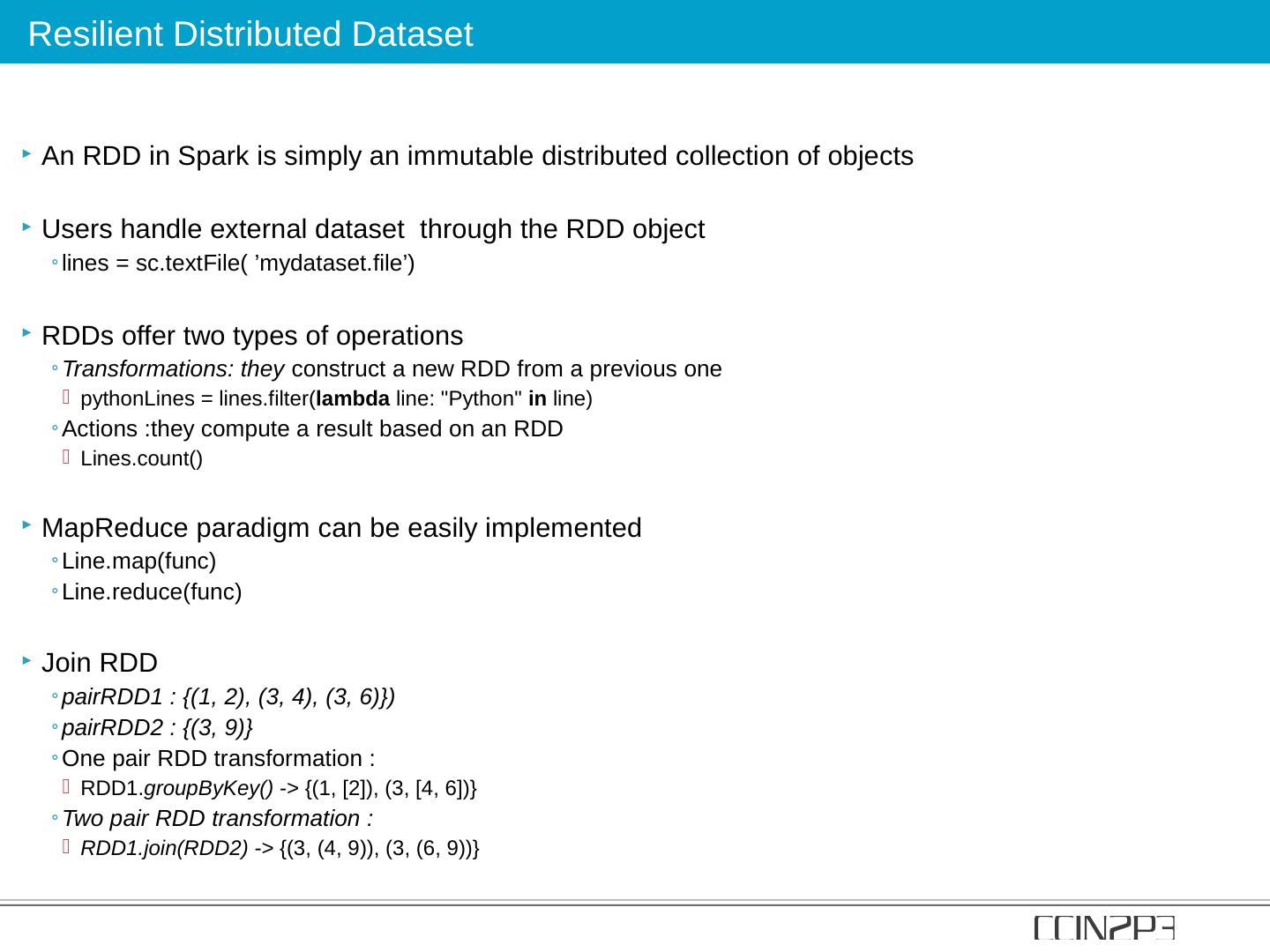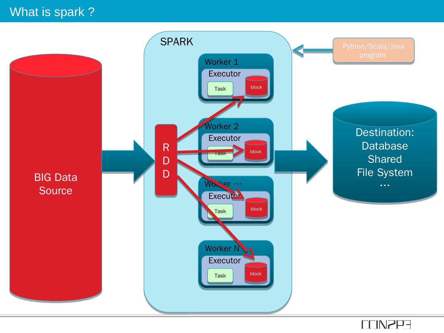An RDD in Spark is simply an immutable distributed collection of objects ... JDBC, ODBC, Hive, mongoGB. GraphX. Graph manipulating. Spark features.