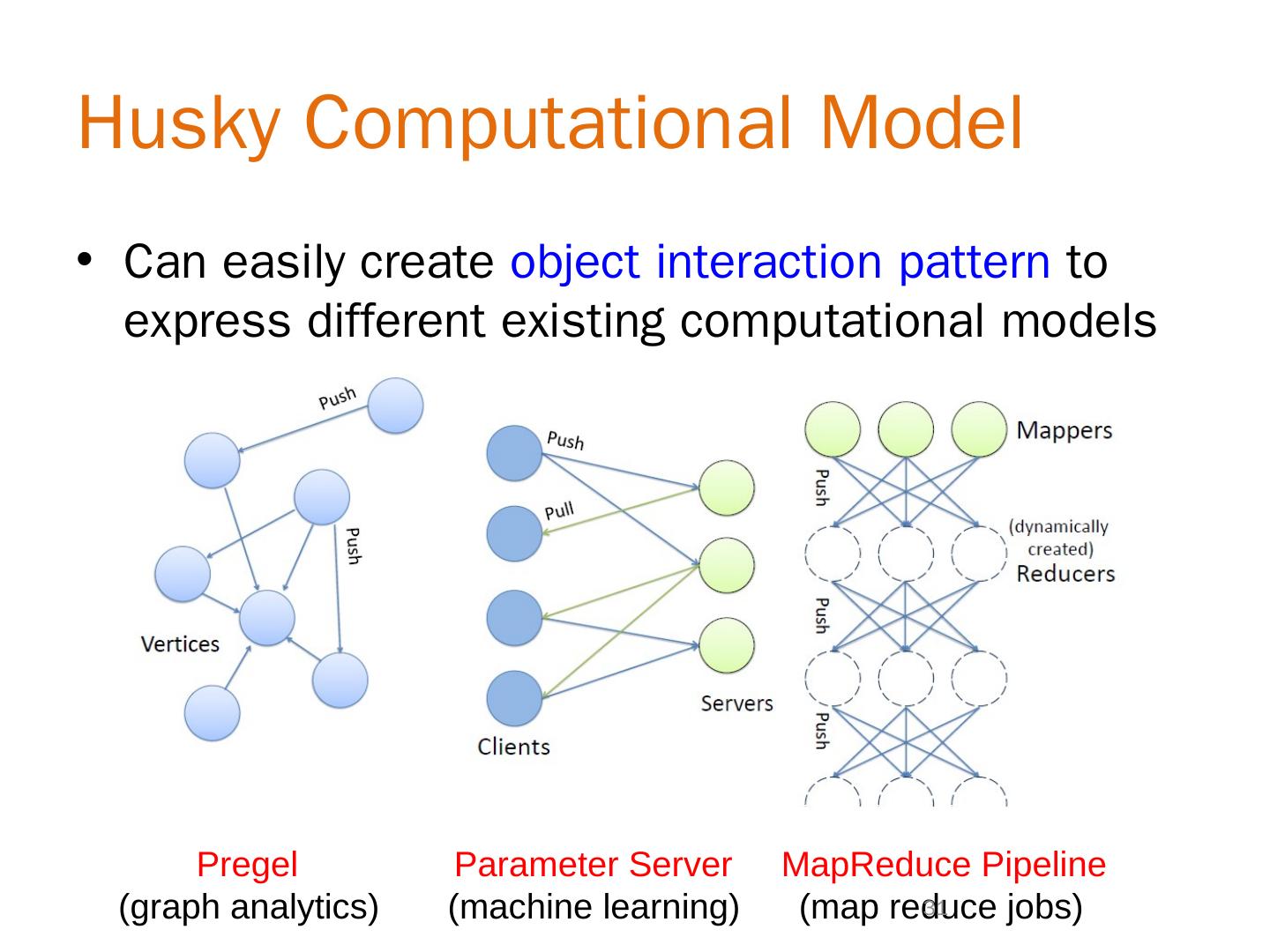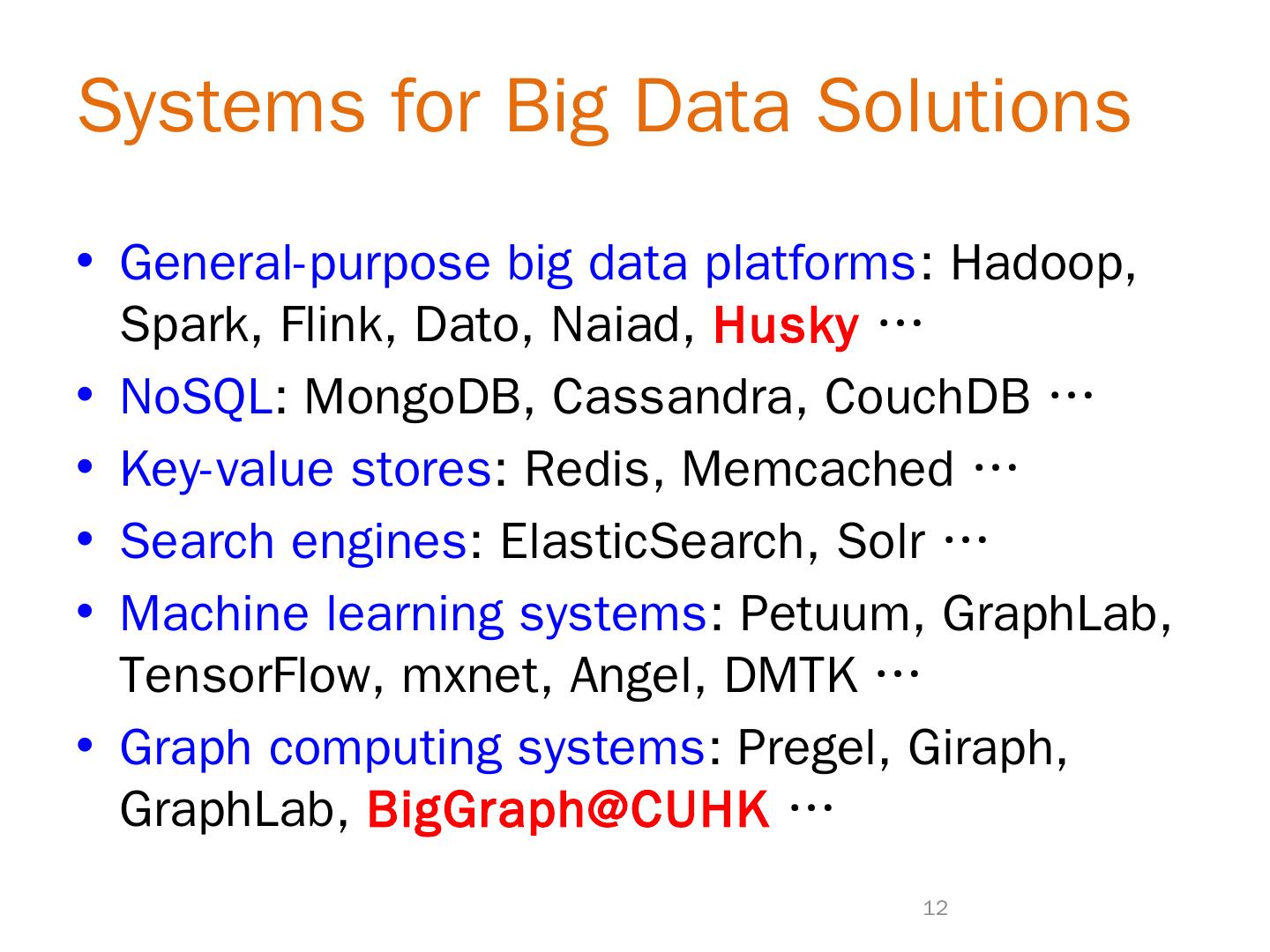 Machine learning systems: Petuum, GraphLab, TensorFlow, mxnet, Angel, DMTK … Graph computing systems: Pregel, Giraph, GraphLab, BigGraph@CUHK …