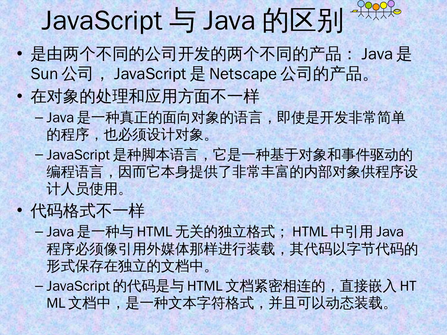 Java是一种真正的面向对象的语言,即使是开发非常简单的程序,也必须设计对象。 JavaScript是种脚本语言,它是一种基于对象和事件驱动的编程语言,因而它本身 ...
