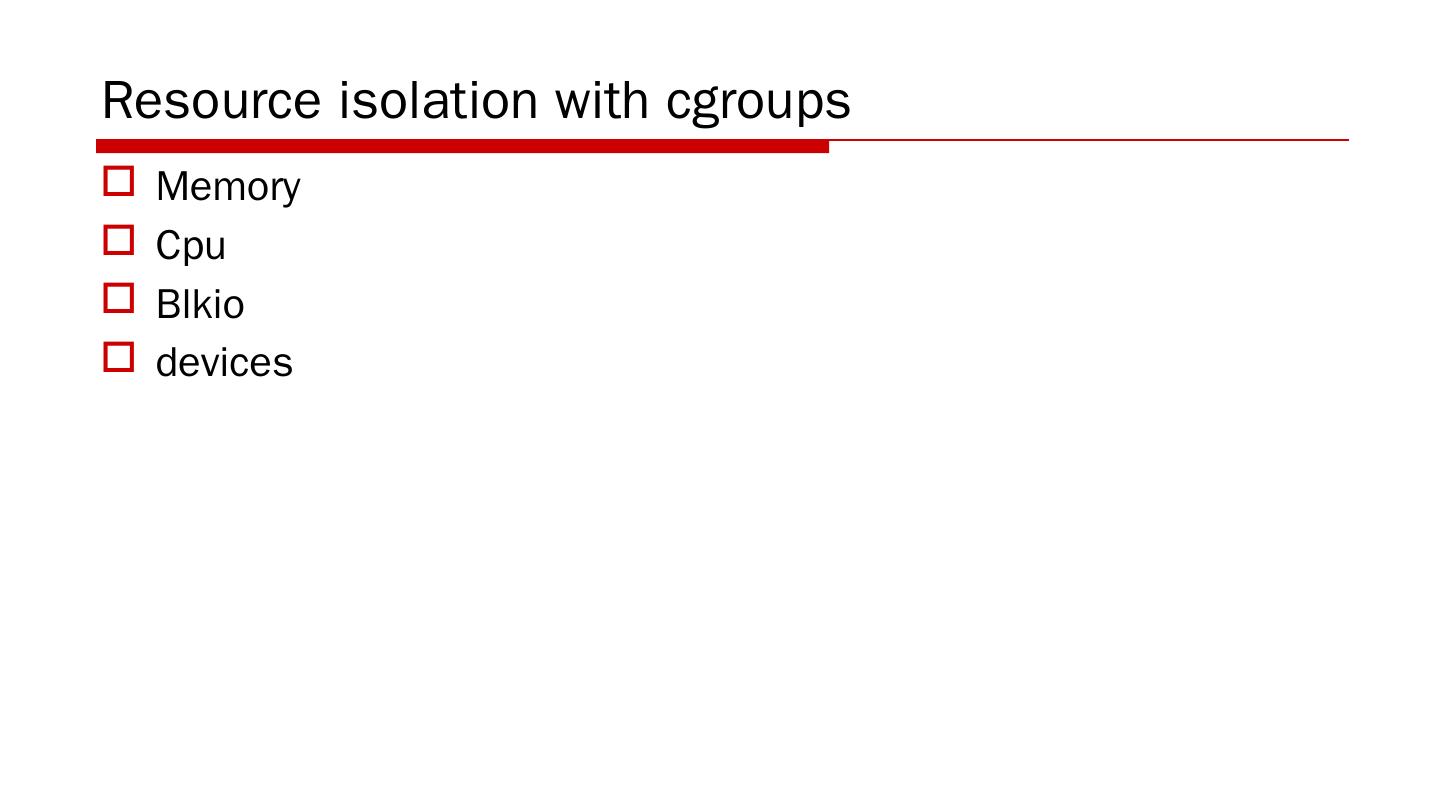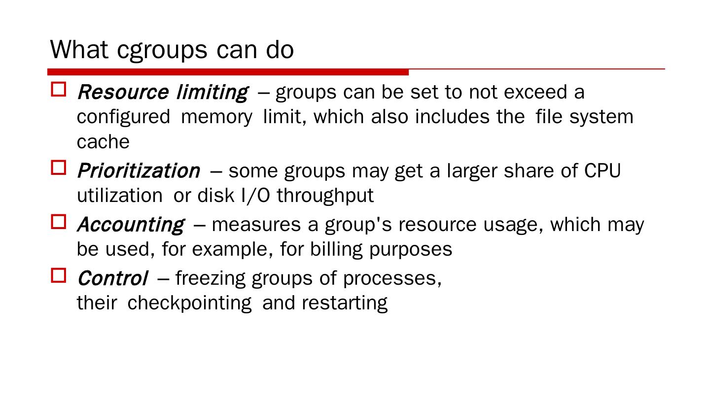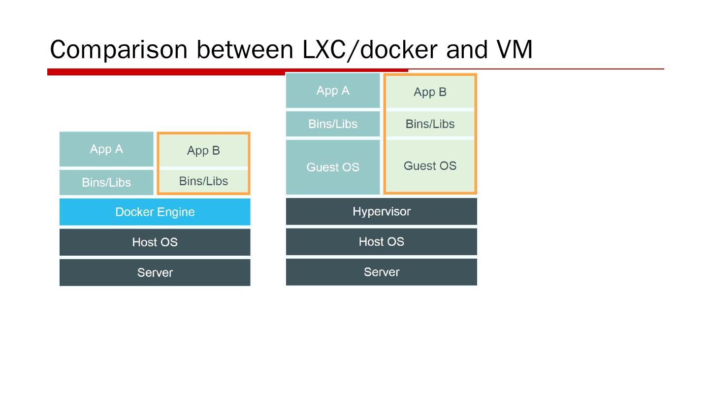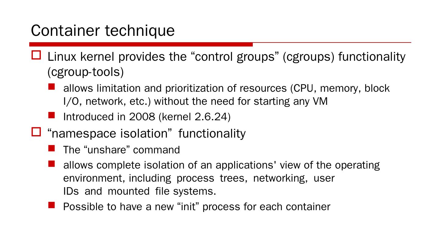 Comparison between LXC/docker and VM. Container technique. Linux kernel provides the “control groups” (cgroups) functionality (cgroup-tools).