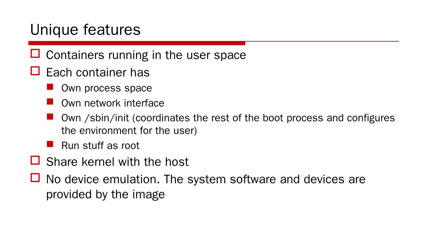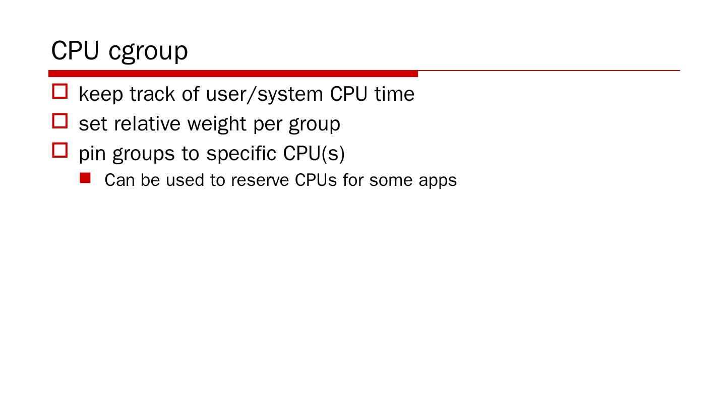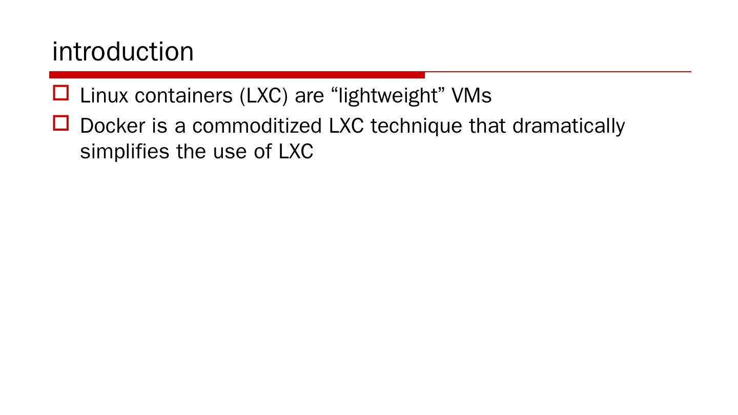 Comparison between LXC/docker and VM. Container technique. Linux kernel provides the “control groups” (cgroups) functionality (cgroup-tools).