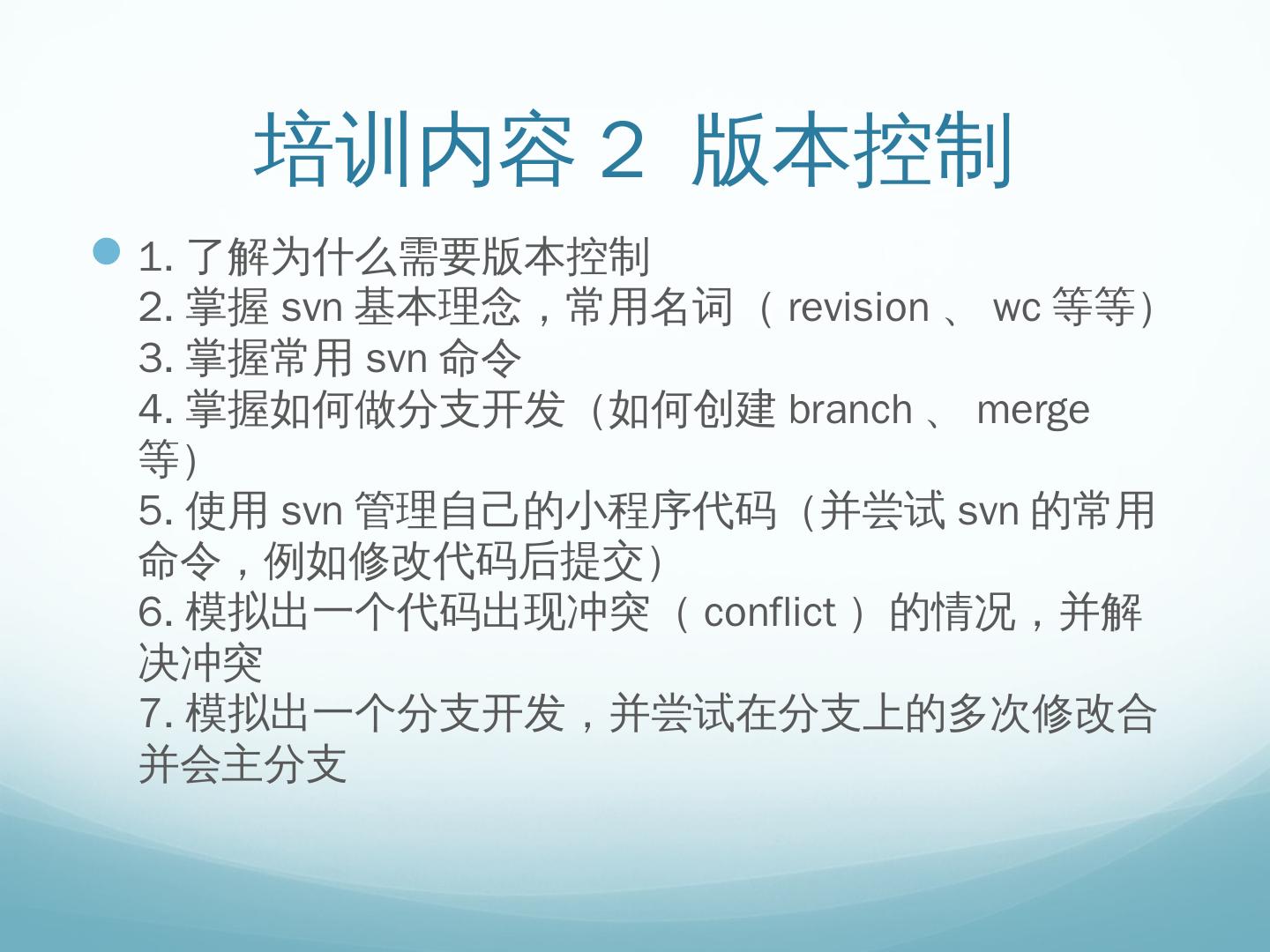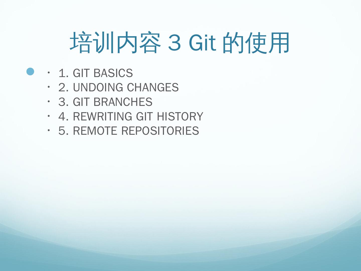 REMOTE REPOSITORIES. 培训内容4 Bash编程. 1)理解变量、条件语句、循环语句、标准输入输出、I/O重定向、管道、函数等概念; 2)能编写脚本,组合常用Linux工具 ...