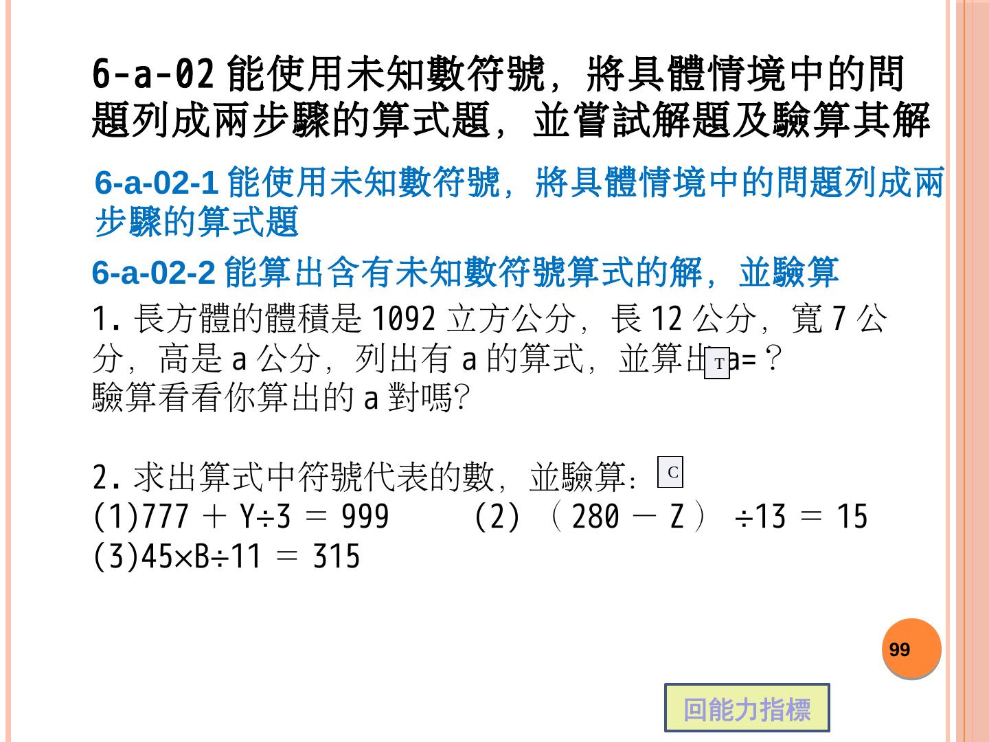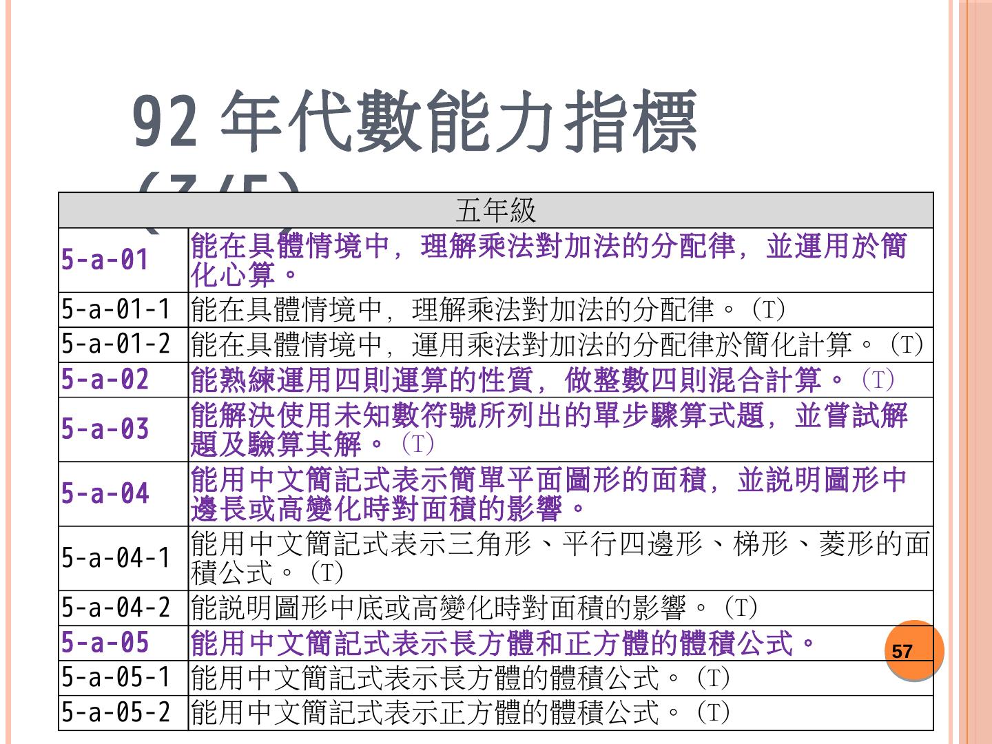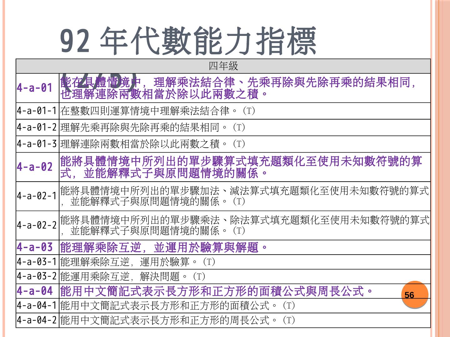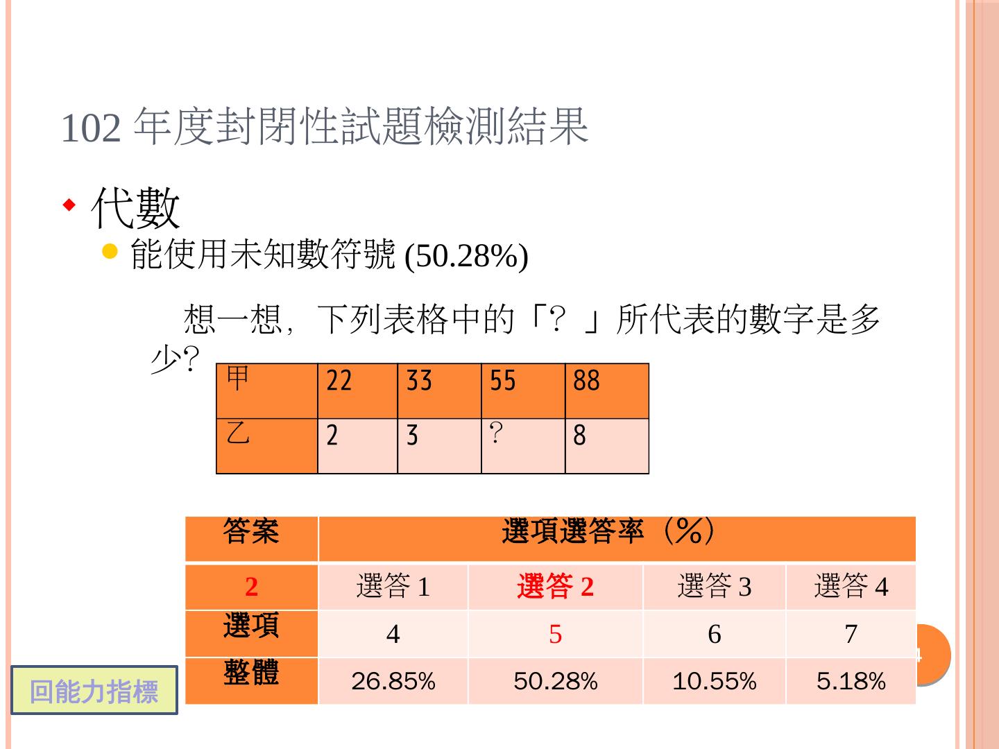 代數能力指標; 102年度代數檢測結果; 代數教學核心概念; 代數教學建議. 5 ..... 一般而言,代數是以一個未知數(如X)代表一個數,但規律的發現、數量的關係、變數都是 ...