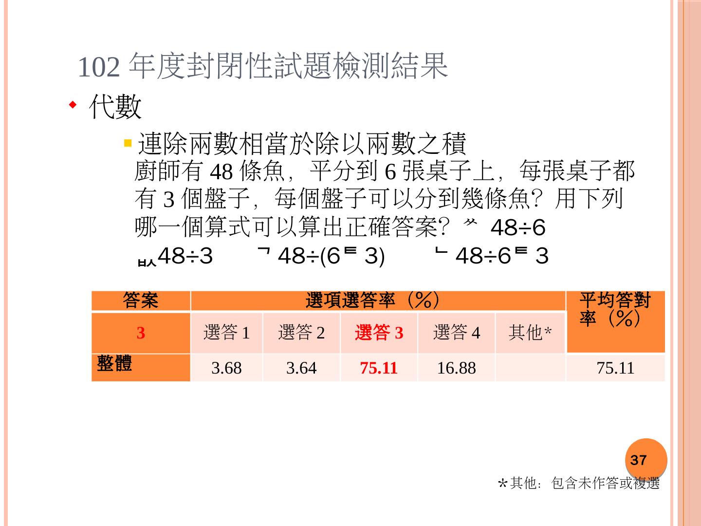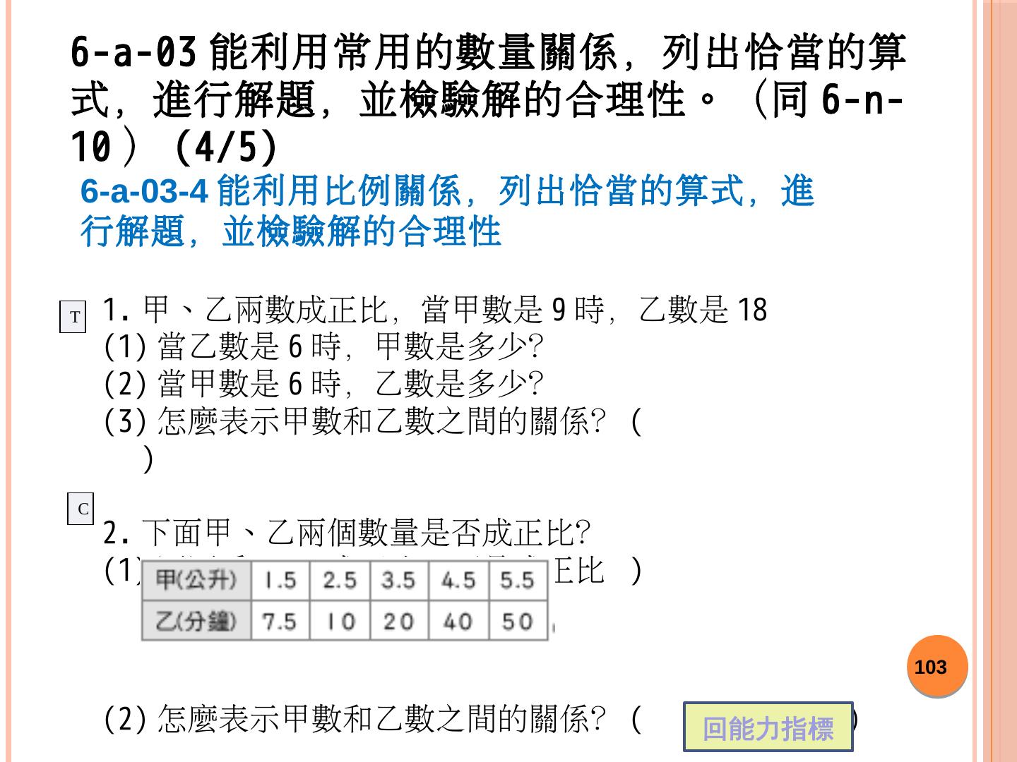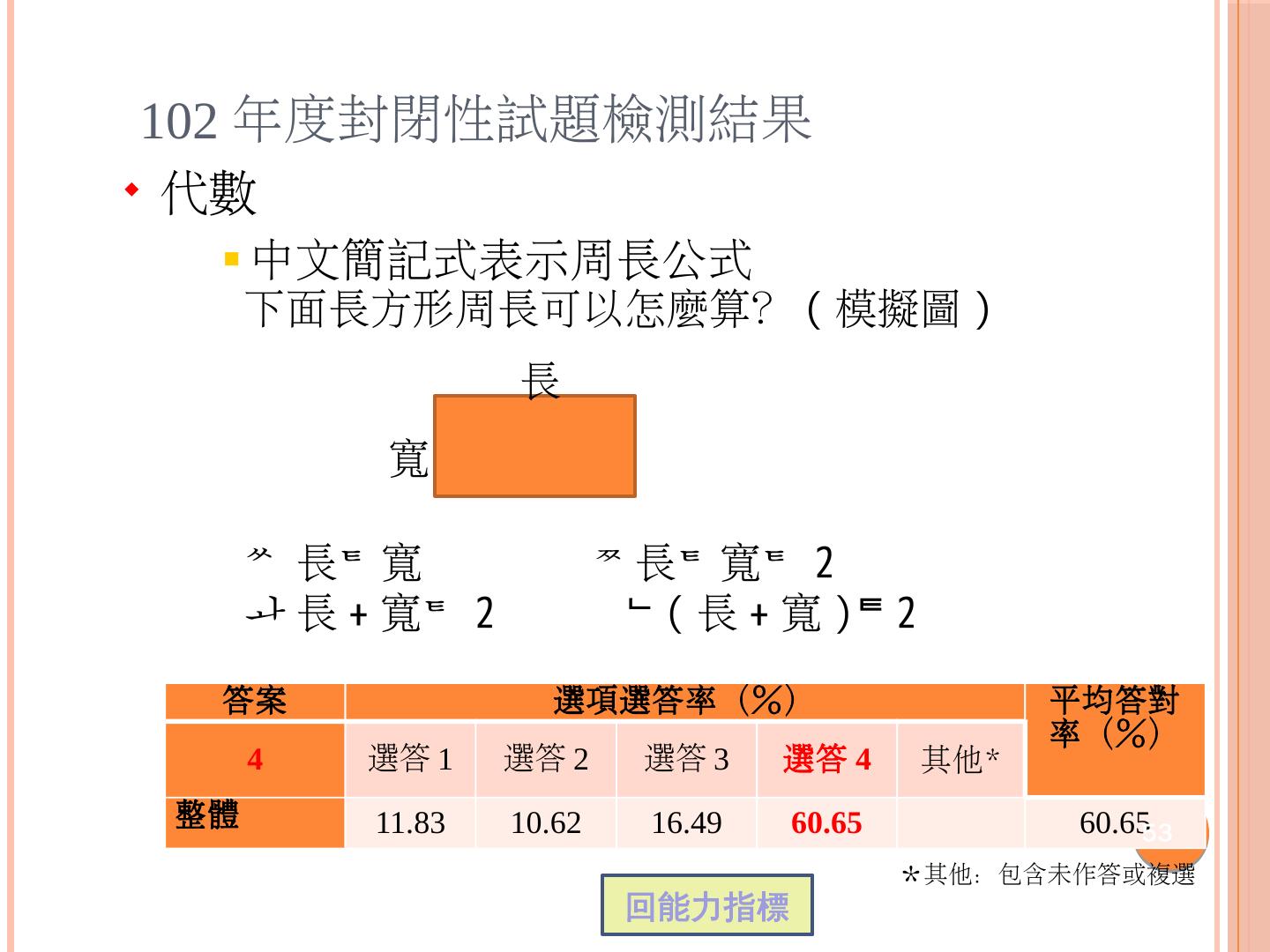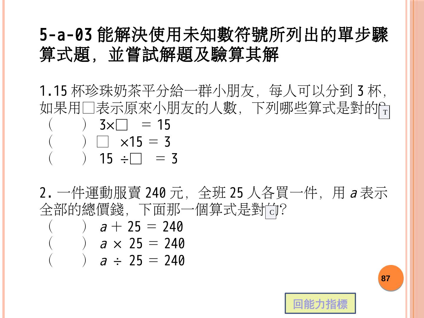 代數能力指標; 102年度代數檢測結果; 代數教學核心概念; 代數教學建議. 5 ..... 一般而言,代數是以一個未知數(如X)代表一個數,但規律的發現、數量的關係、變數都是 ...