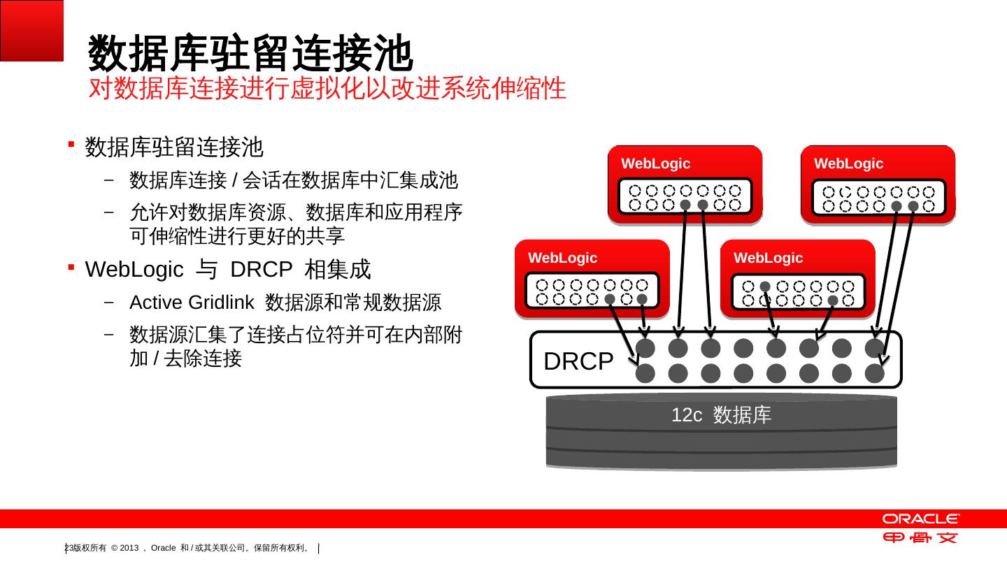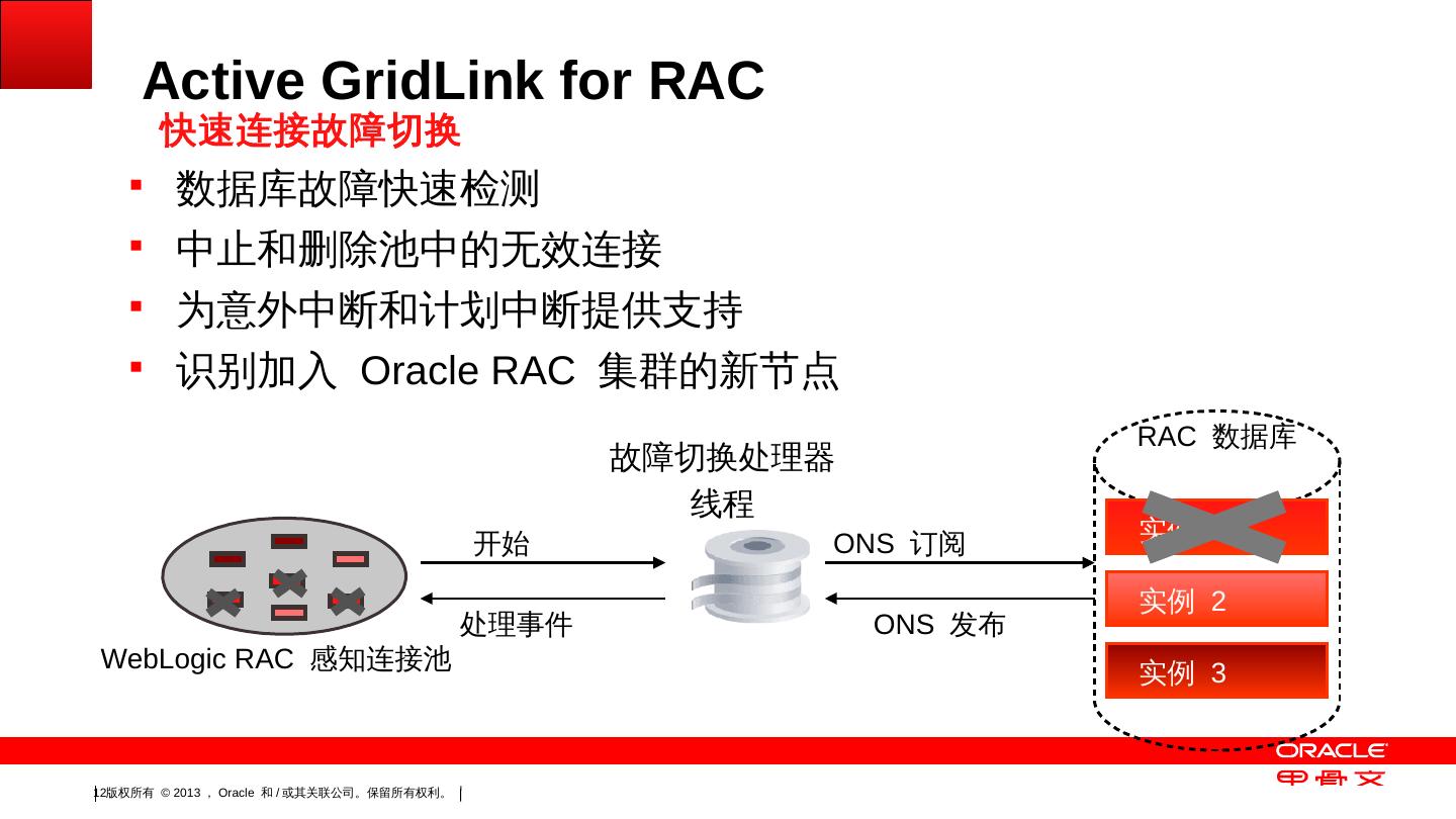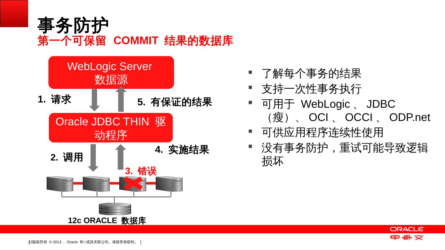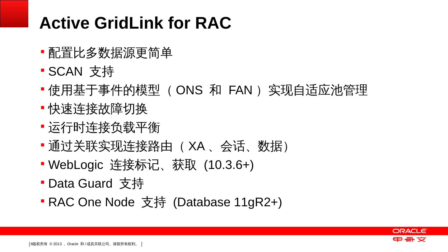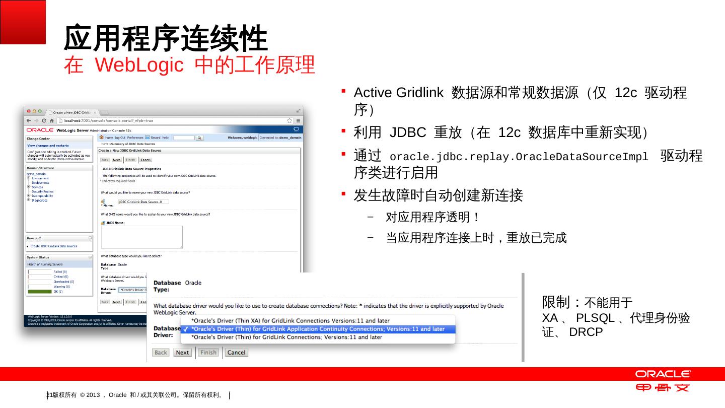 Active Gridlink 数据源和常规数据源(仅12c 驱动程序); 利用JDBC 重放(在12c 数据库中重新实现); 通过oracle.jdbc.replay.OracleDataSourceImpl 驱动程序类进行 ...