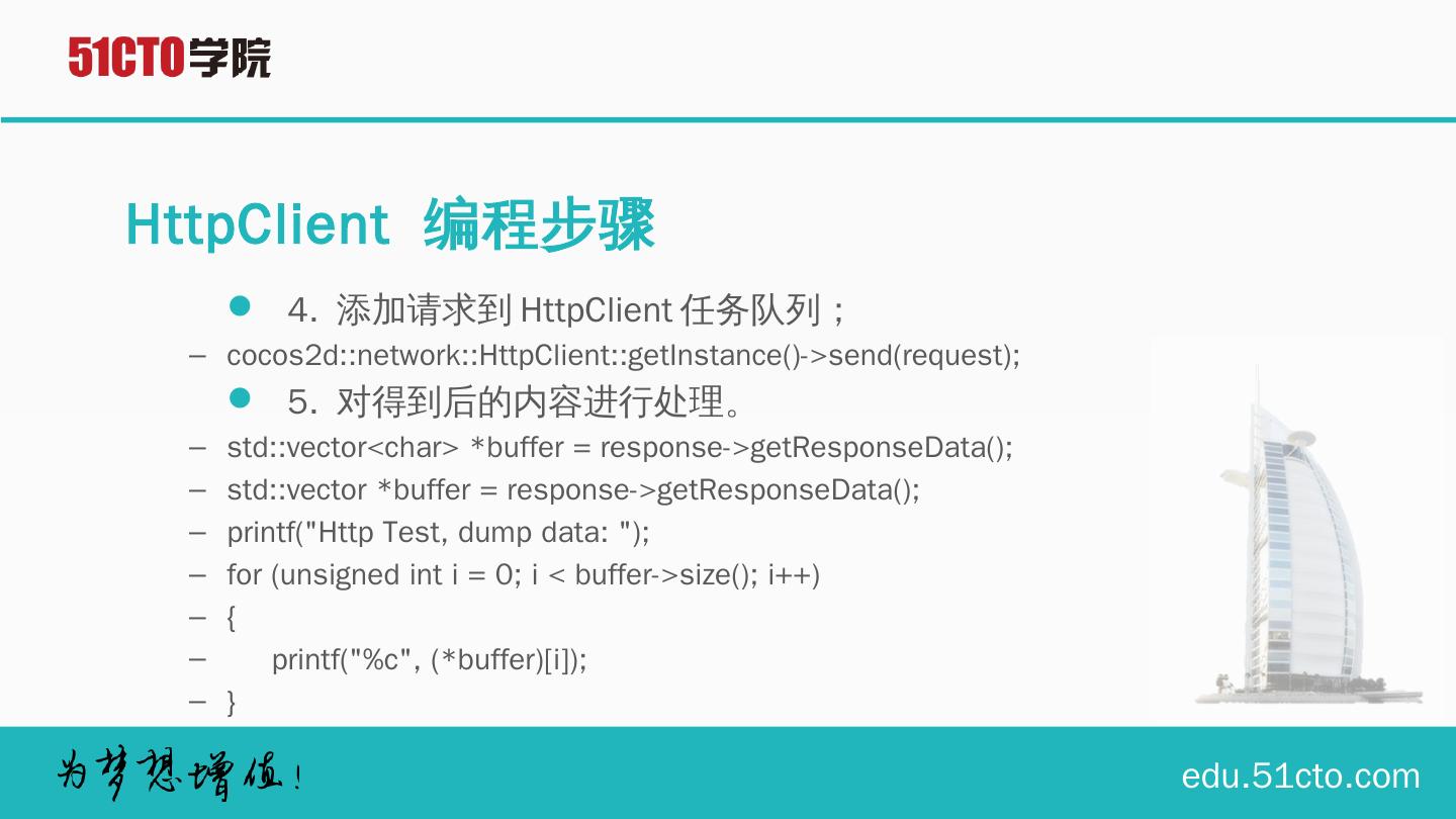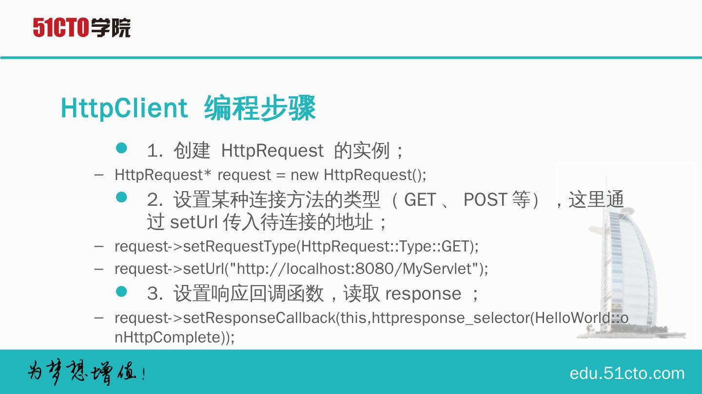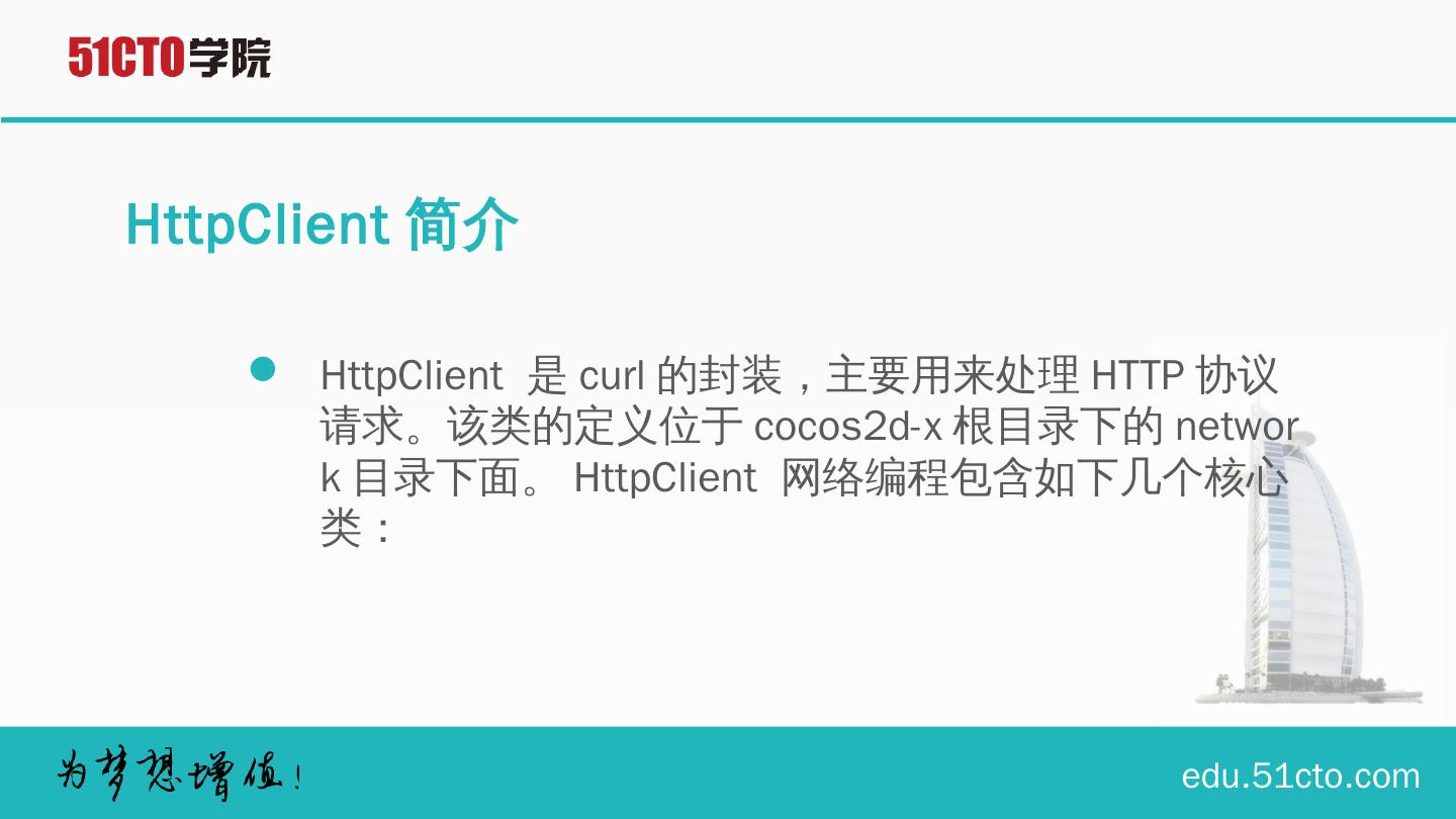 Cocos2d-x实战百集系列课程. edu.51cto.com. 讲师:. 郭宏志. 网络编程-HttpClient. edu.51cto.com. 课程目录. Course Contents. HttpClient简介; HttpClient的编程 ...