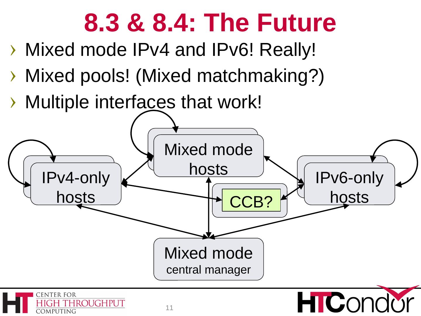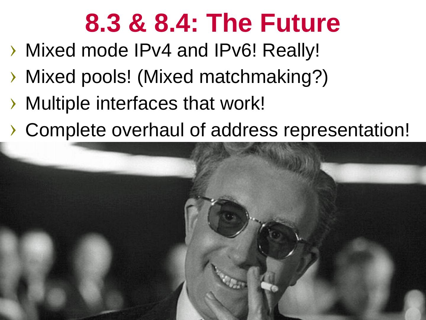 IPv4 stays on! Lots of odd limitations. Using IPv6 today? Also do. ENABLE_IPV4=FALSE. 8.1 & 8.2: The Present. 8. Mixed mode IPv4 and IPv6! Sorta; Kinda; Not ...