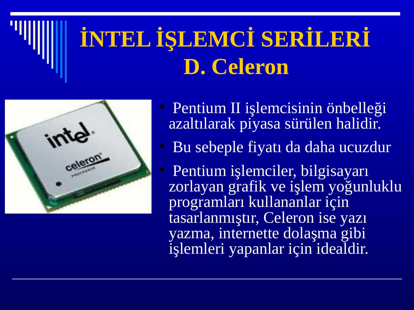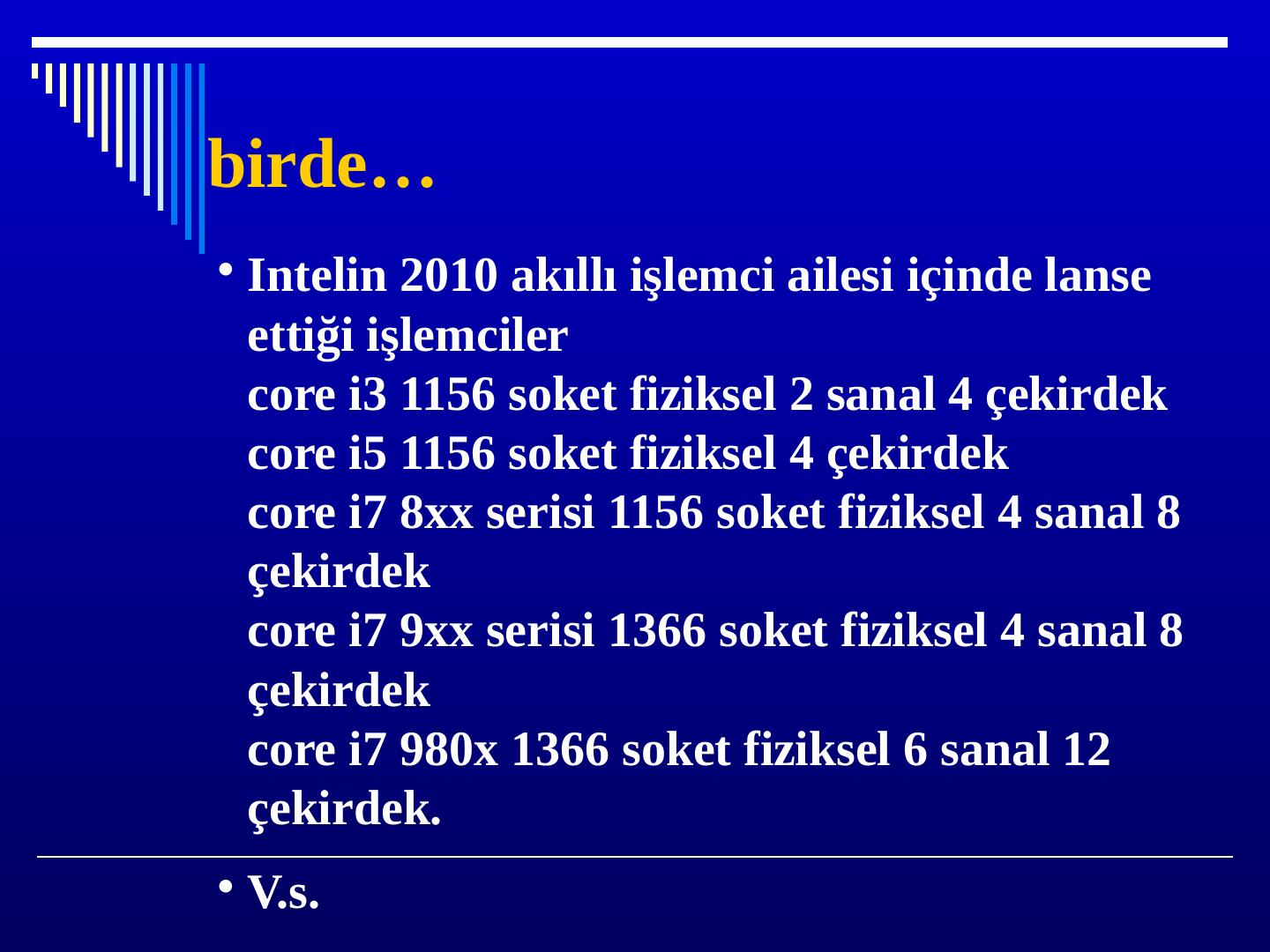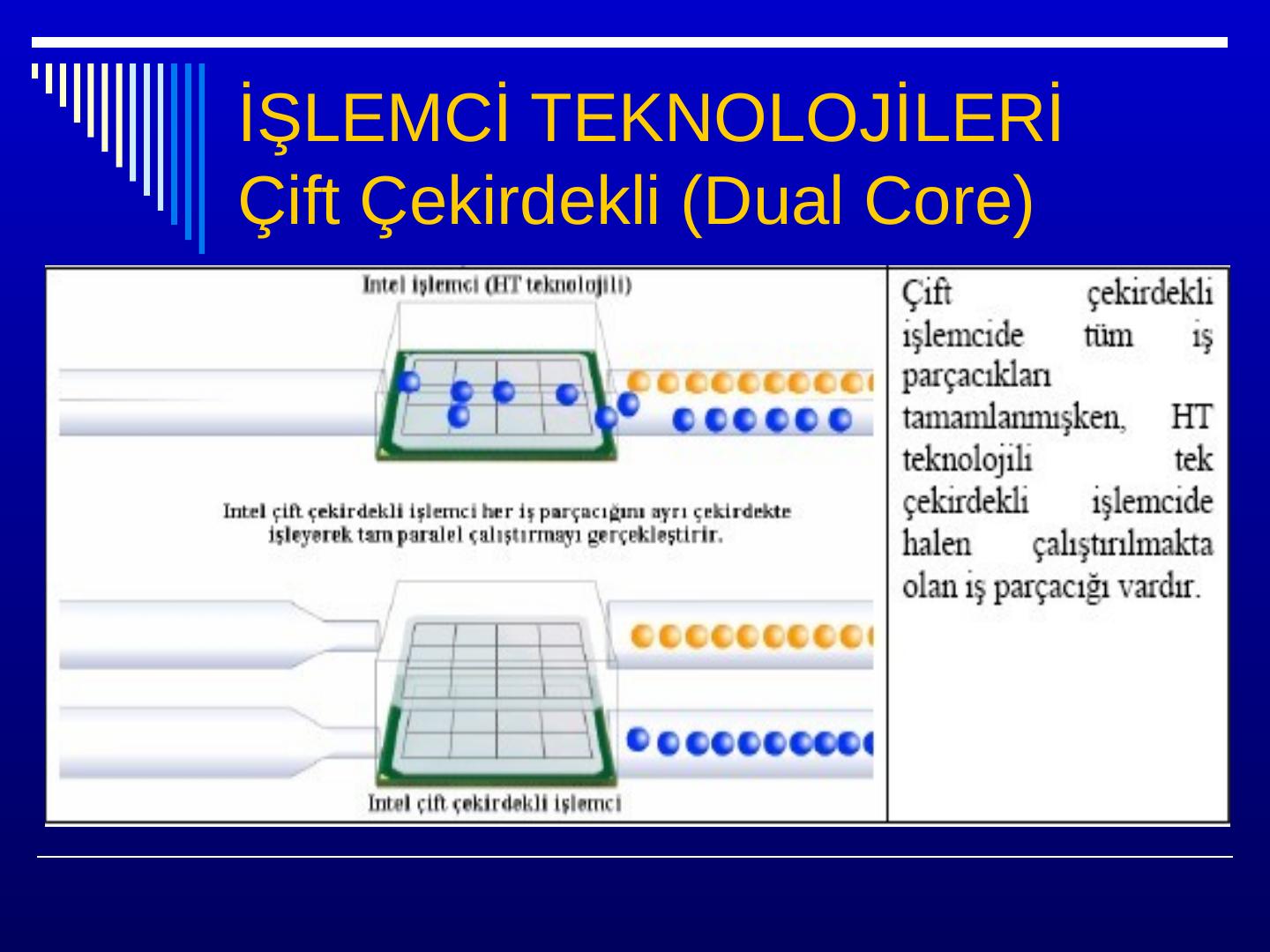 (Hyper Threading). Tek İşlemci İşleri parçalayıp yapıyor. Çift İşlemci. (Dual Processor). İki ayrı işlemci. Çift Çekirdek. (Dual Core). Bir işlemci içinde 2 çekirdek,