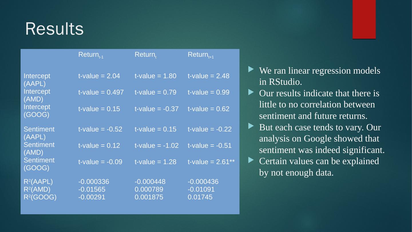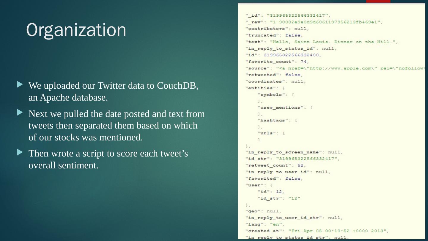 We uploaded our Twitter data to CouchDB, an Apache database. Next we pulled the date posted and text from tweets then separated them based on which of ...