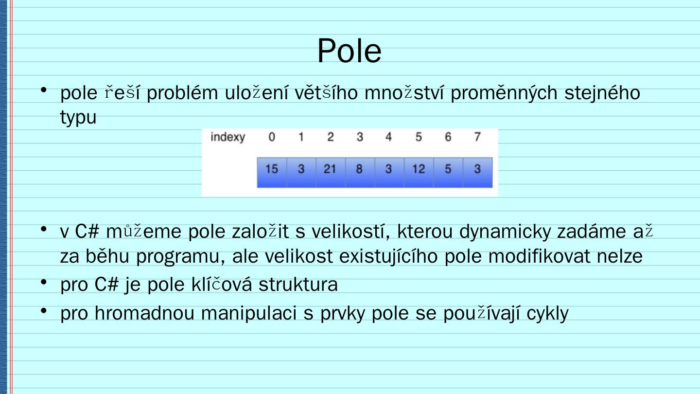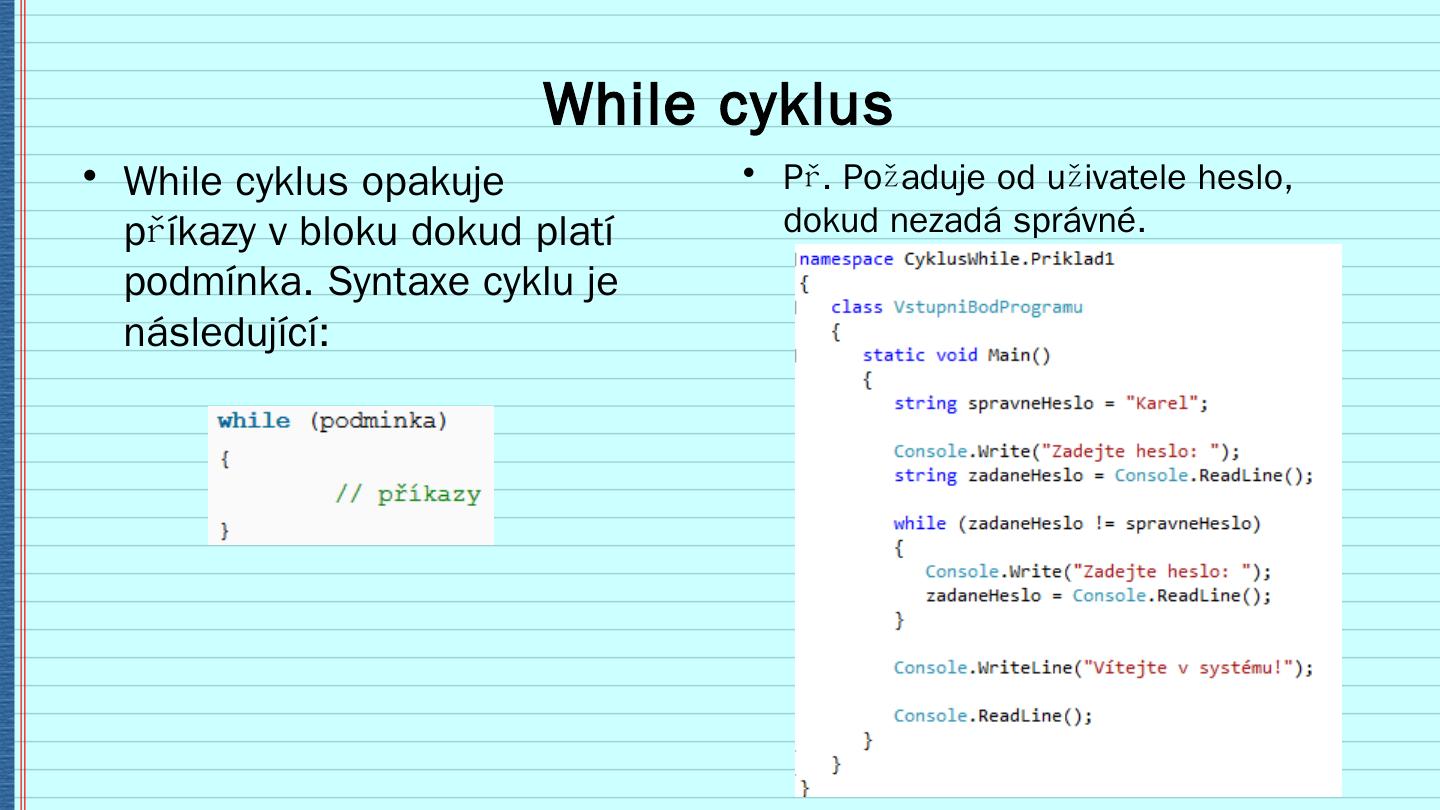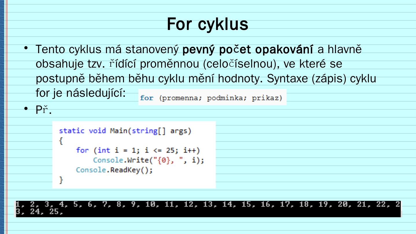 Programovací jazyk C#. 4. část - cykly. For cyklus. Tento cyklus má stanovený pevný počet opakování a hlavně obsahuje tzv. řídící proměnnou (celočíselnou), ...