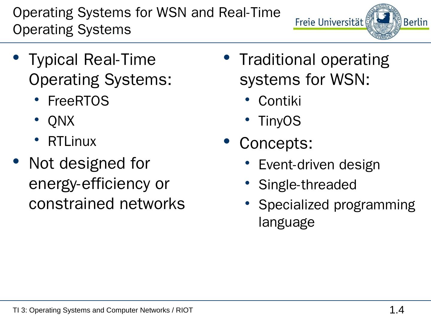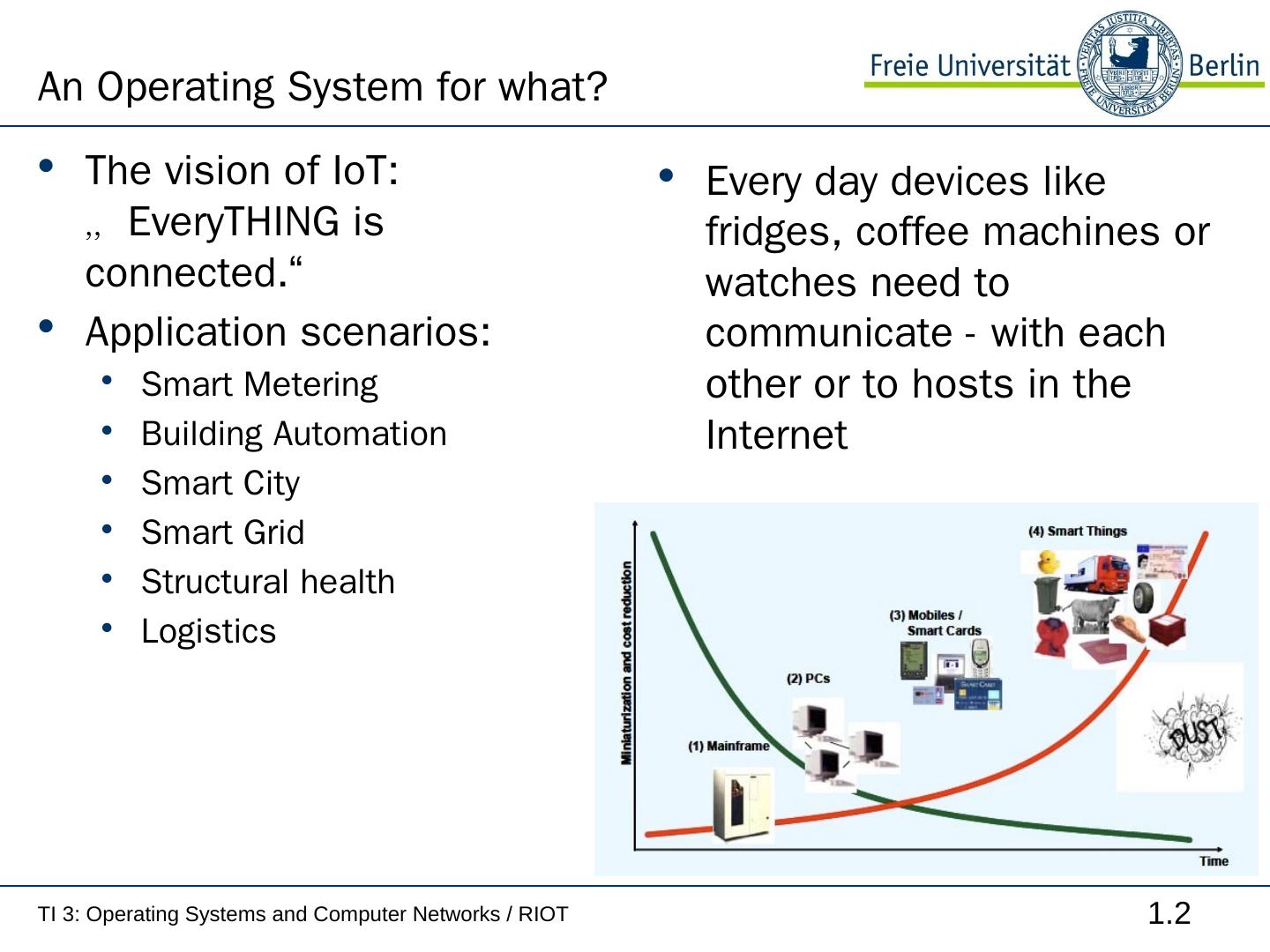 TI 3: Operating Systems and Computer Networks / RIOT. 1.2. An Operating System for what? The vision of IoT: „EveryTHING is connected.“ Application scenarios ...