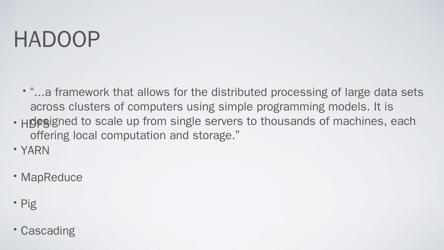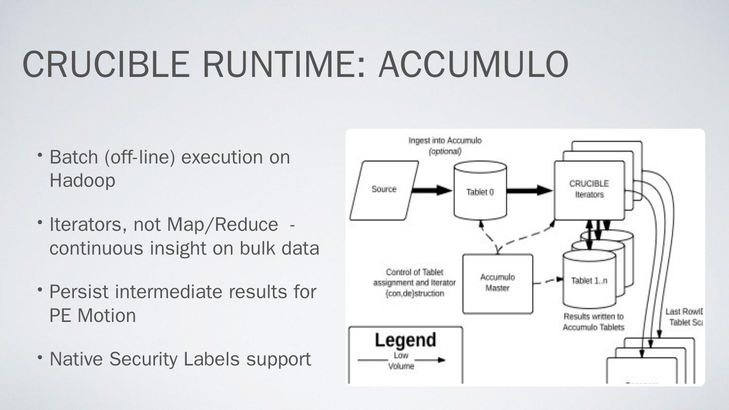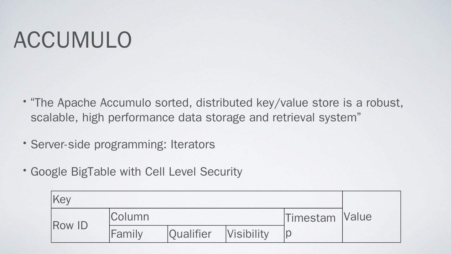 HDFS; YARN; MapReduce; Pig; Cascading; Drill. Accumulo. “The Apache Accumulo sorted, distributed key/value store is a robust, scalable, high performance ...