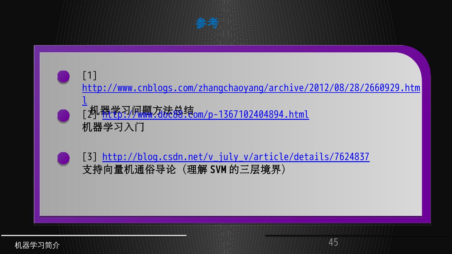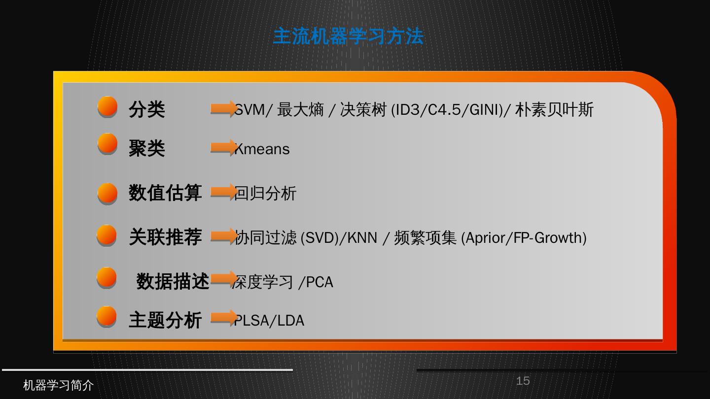 分类 SVM/最大熵/决策树(ID3/C4.5/GINI)/朴素贝叶斯. 聚类 Kmeans. 数值估算 回归分析. 关联推荐 协同过滤(SVD)/KNN /频繁项集(Aprior/FP-Growth). 数据描述 深度 ...