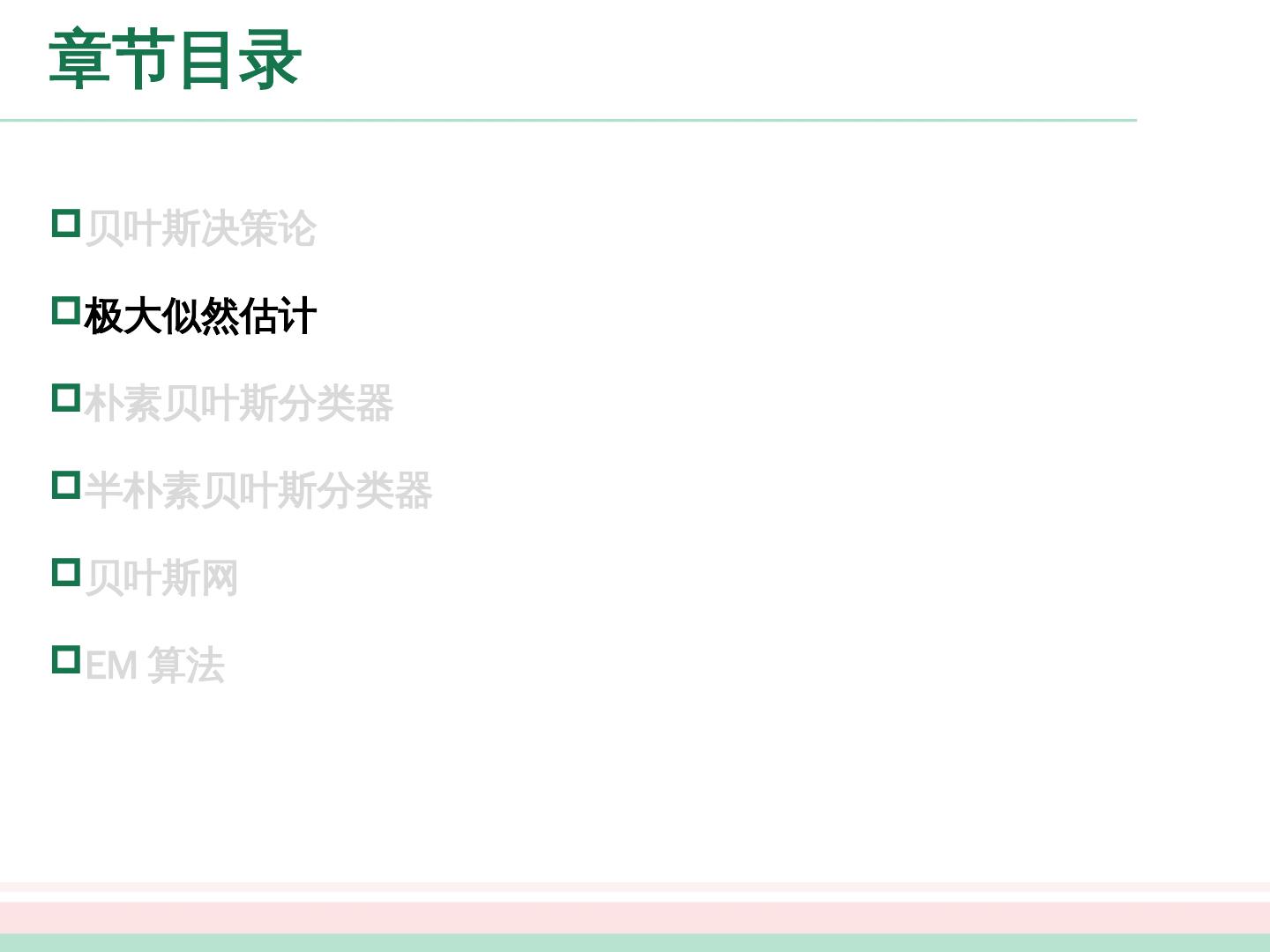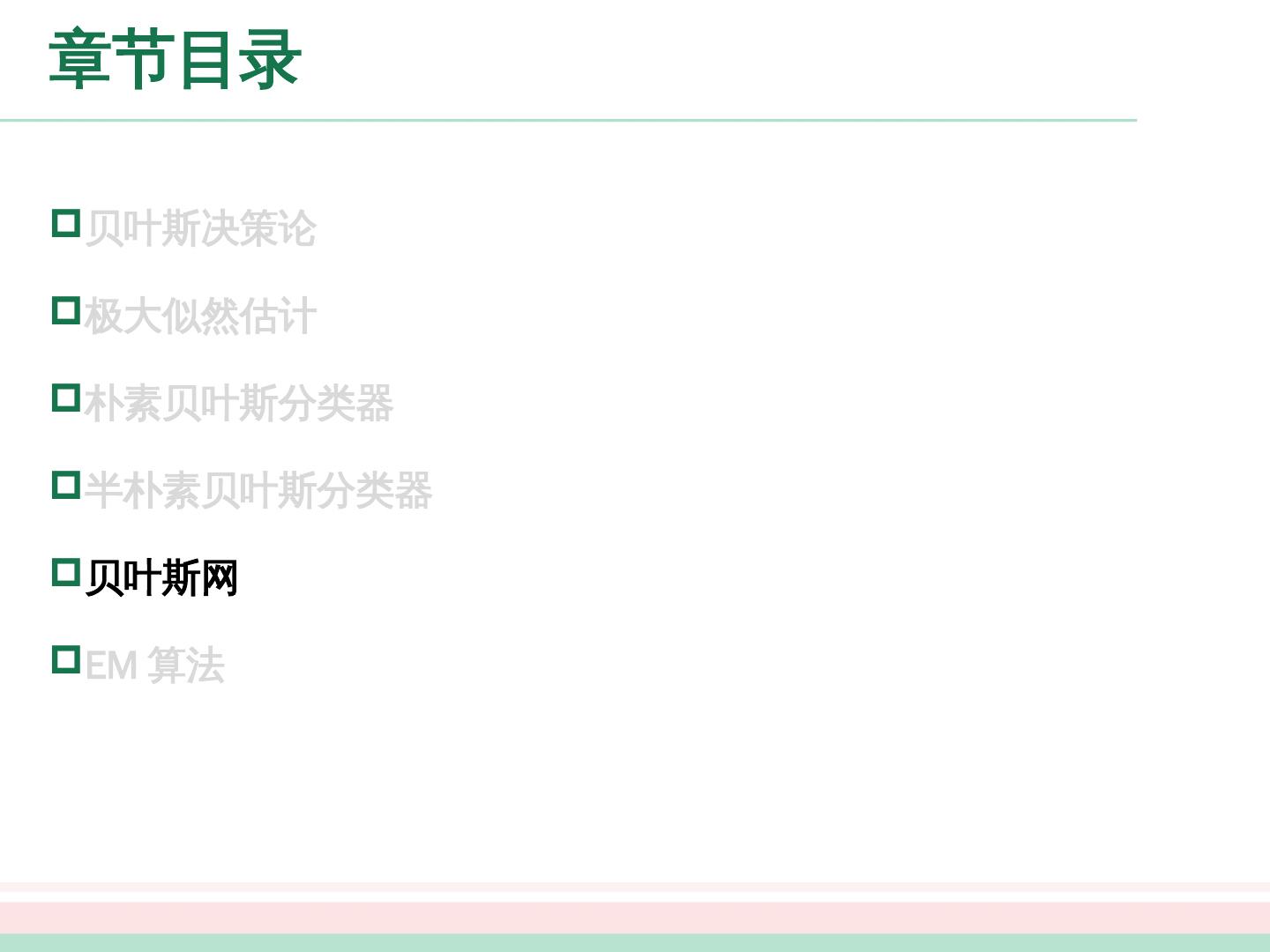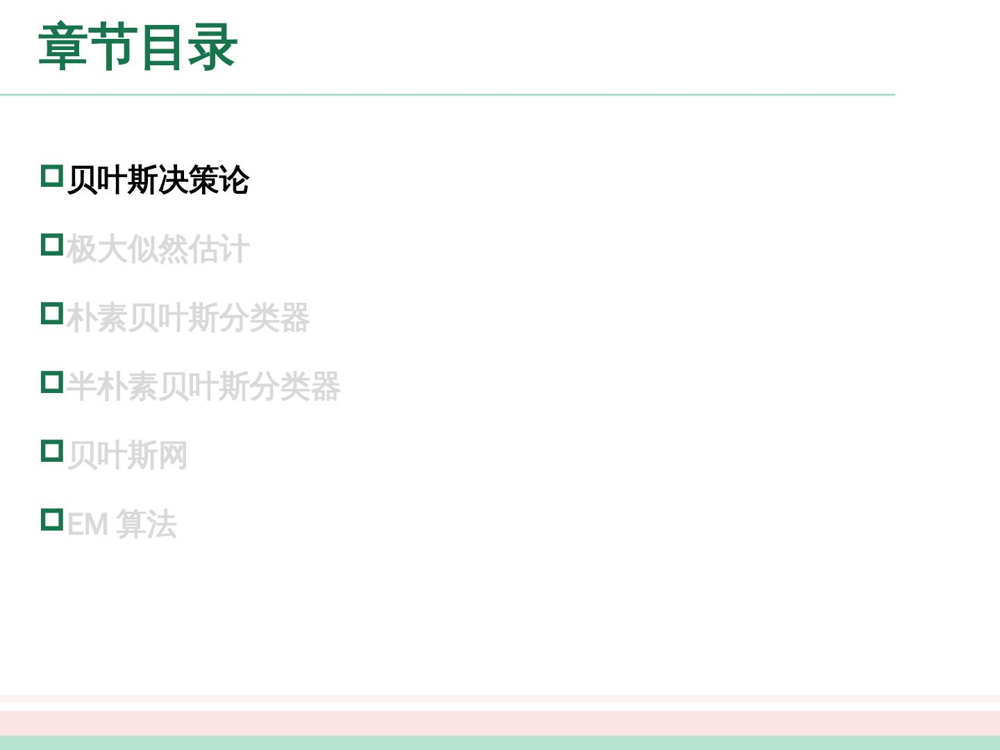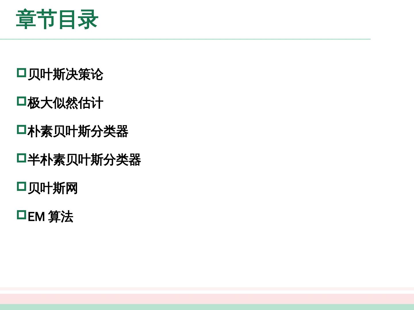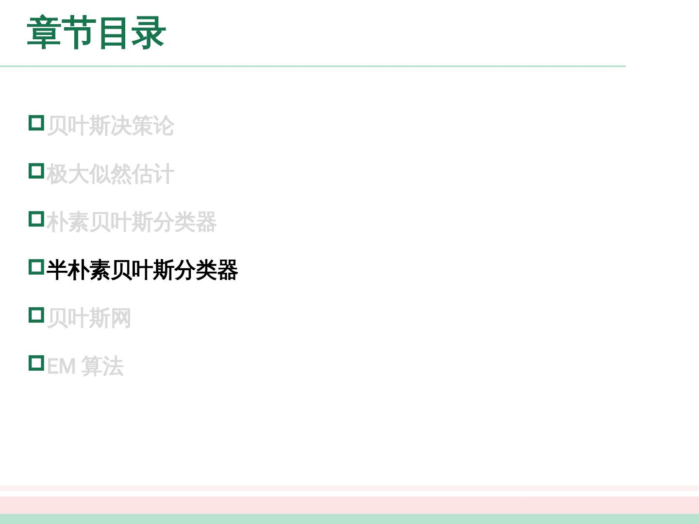 4 .章节目录 贝叶斯决策论 极大似然估计 朴素贝叶斯分类器 半朴素贝叶斯分类器 贝叶斯网 EM 算法