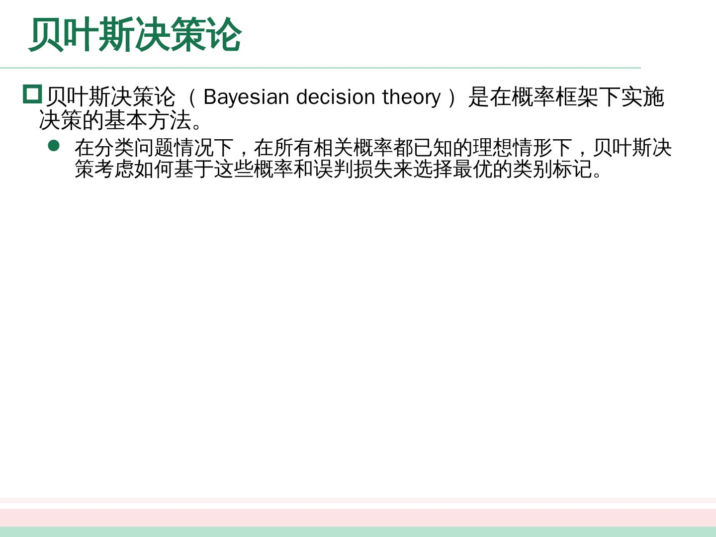 5 .贝叶斯决策论 贝叶斯决策论( Bayesian decision theory )是在概率框架下实施决策的基本方法 。 在分类问题情况下,在 所有相关概率都已知的理想情形下,贝叶斯决策考虑如何基于这些概率和误判损失来选择最优的类别标记。