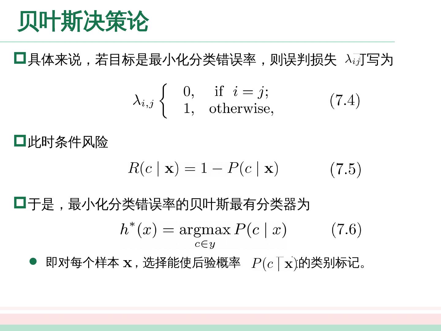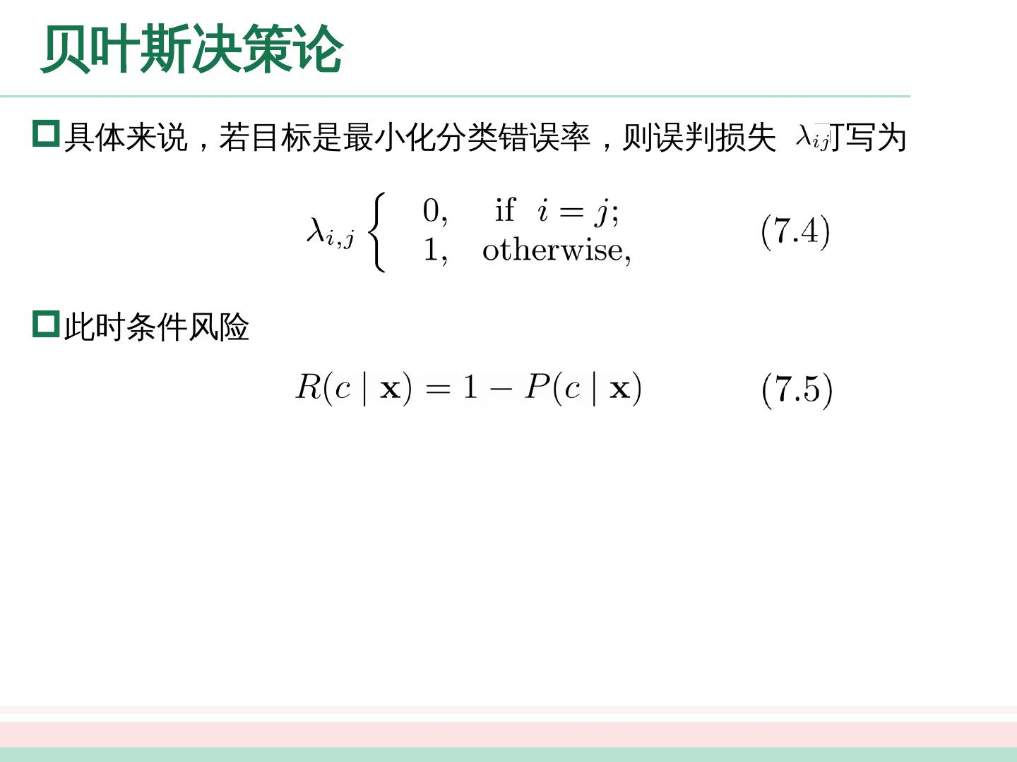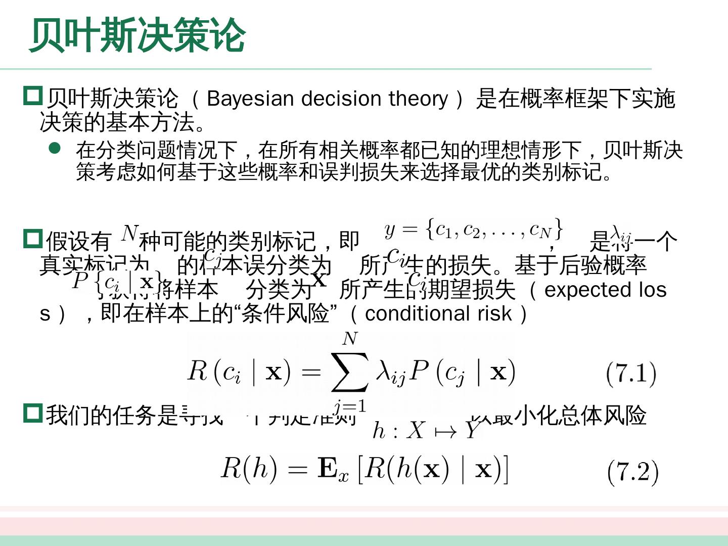 7 .贝叶斯决 策论 显然,对每个样本 ,若 能最小化条件风险 , 则总体风险 也 将被最小化 。