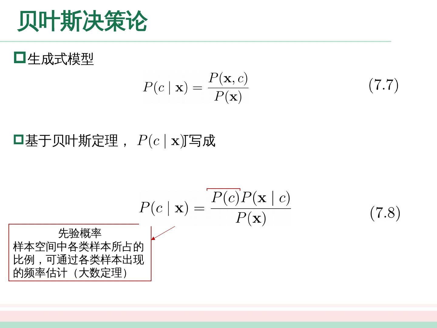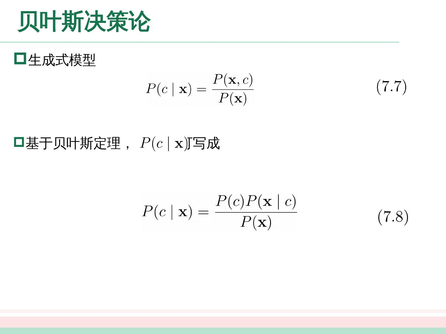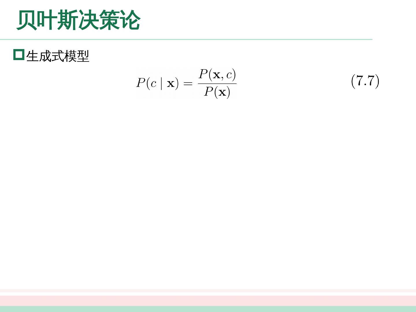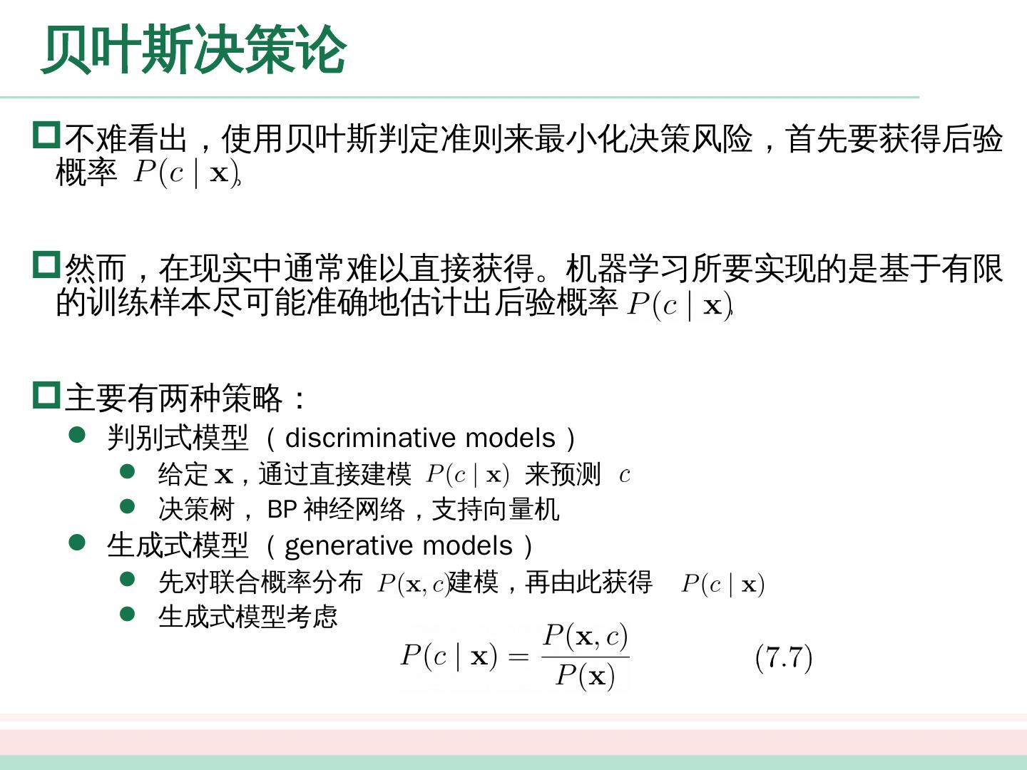 7 .贝叶斯决 策论 显然,对每个样本 ,若 能最小化条件风险 , 则总体风险 也 将被最小化 。
