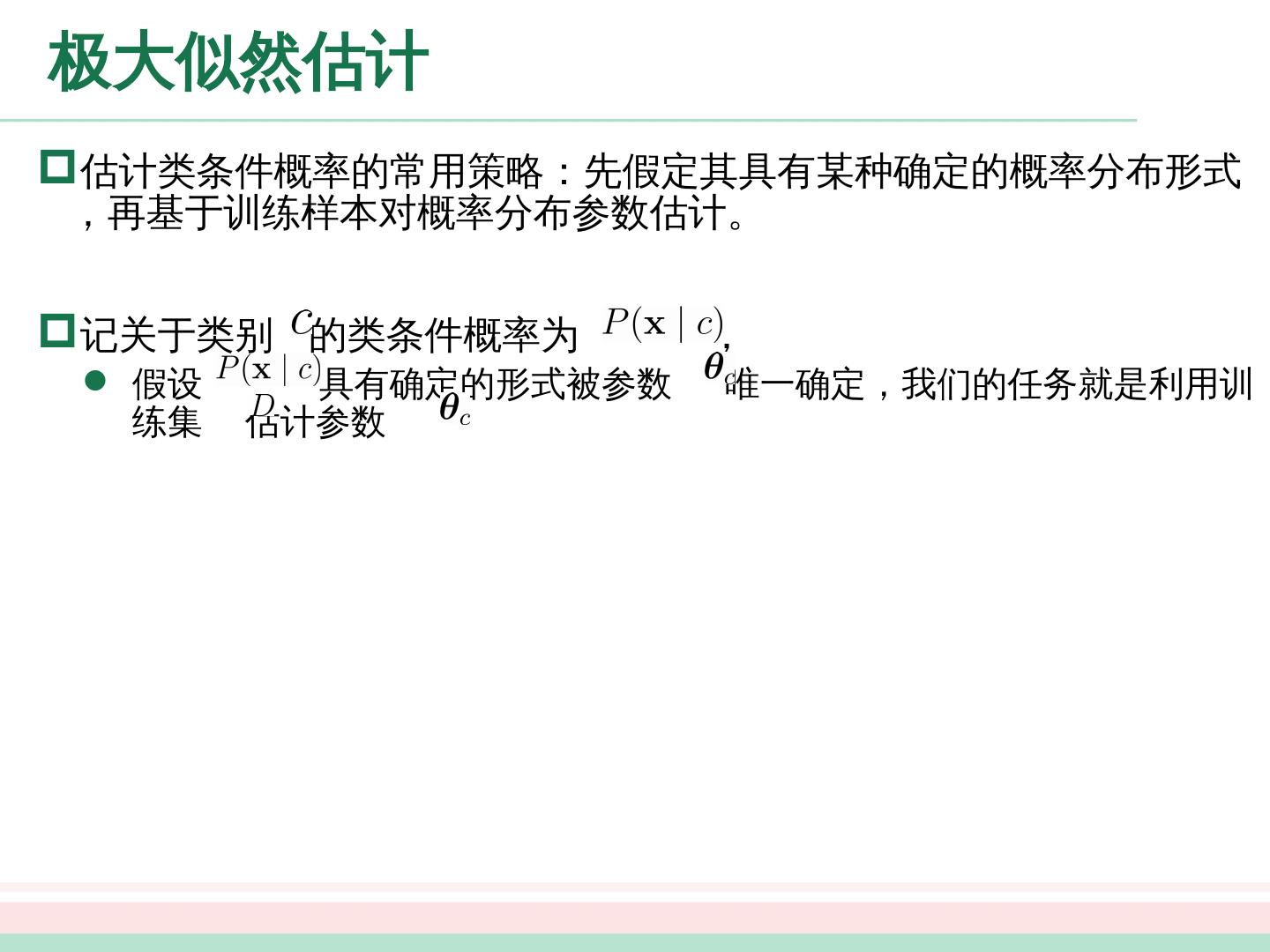 19 .极大似然估计 估计类条件概率的常用 策略:先假定其具有某种确定的概率分布形式,再基于训练样本对概率分布参数 估计。 记关于类别 的 类条件概率为 , 假设 具有 确定的形式被参数 唯一确定,我们的任务就是利用训练集 估计参数