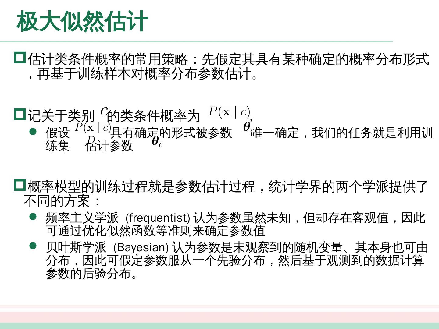20 .极大似然估计 估计类条件概率的常用 策略:先假定其具有某种确定的概率分布形式,再基于训练样本对概率分布参数 估计。 记关于类别 的 类条件概率为 , 假设 具有 确定的形式被参数 唯一确定,我们的任务就是利用训练集 估计参数 概率 模型的训练过程就是参数估计过程,统计学界的两个学派提供了不同的方案: 频率主义学派 ( frequentist ) 认为参数虽然未知,但却存在客观值,因此可通过优化似然函数等准则来确定参数值 贝叶斯学派 (Bayesian) 认为参数是未观察到的随机变量、其本身也可由分布,因此可假定参数服从一个先验分布,然后基于观测到的数据计算参数的后验分布。