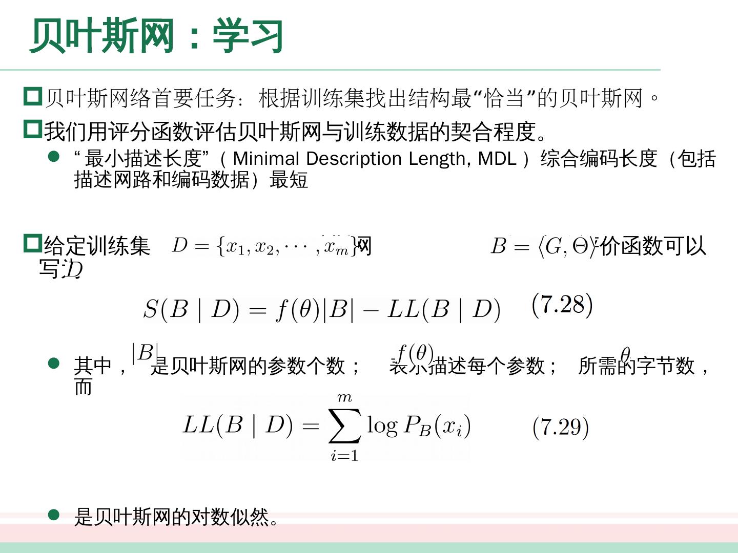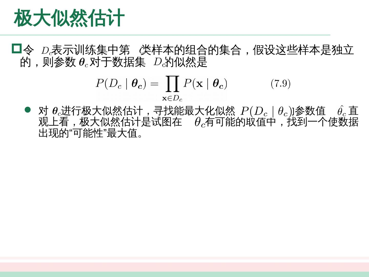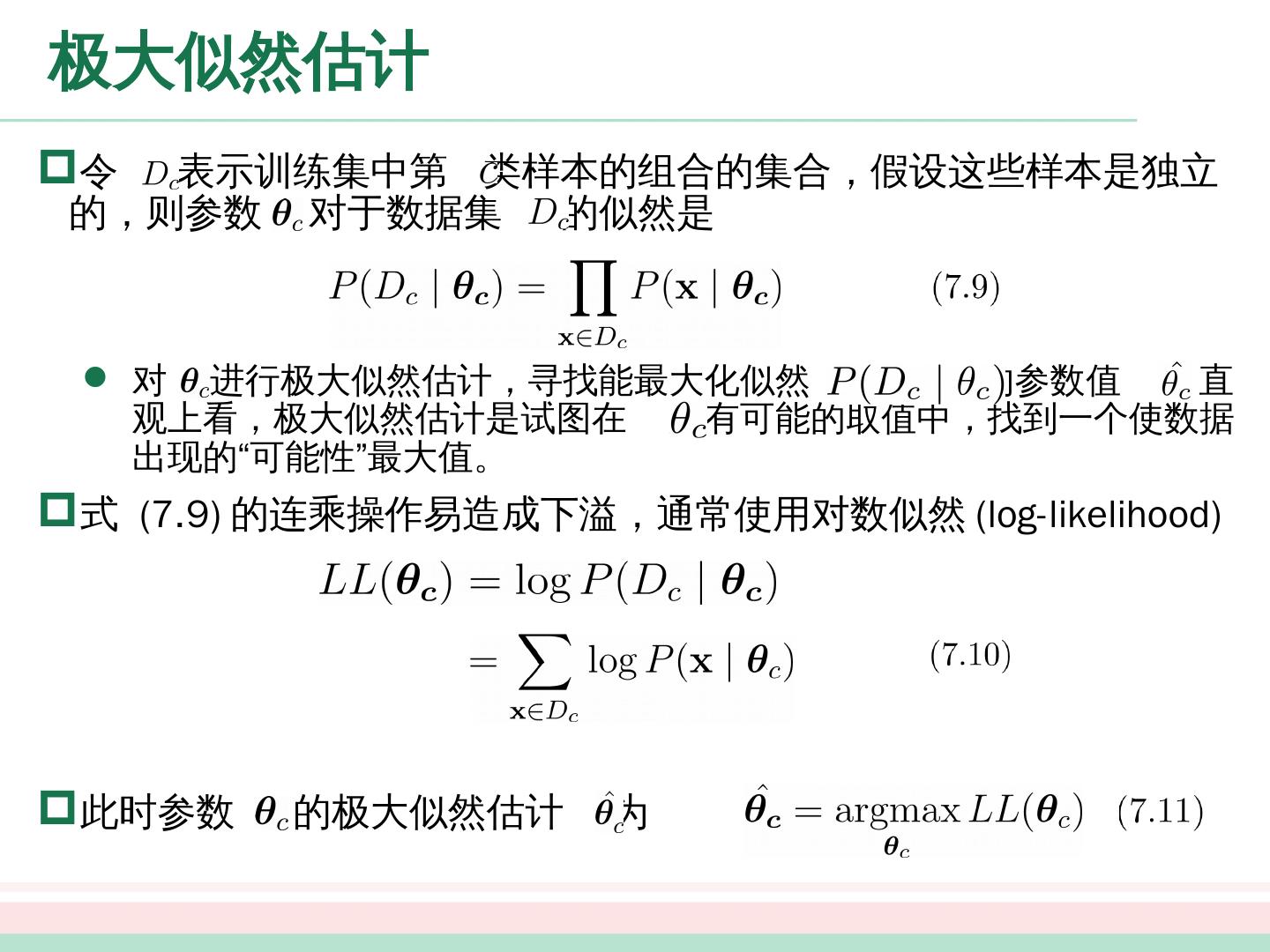 22 .极大似然估计 令 表示训练集中第 类样本的组合的集合,假设这些样本是独立的,则参数 对于数据集 的似然 是 对 进行极大似然估计,寻找能最大化似然 的参数值 。直观上看,极大似然估计是试图在 所有可能的取值中,找到一个使数据出现的“可能性”最大值。 式 (7.9) 的连乘操作易造成下溢, 通常使用对数 似然 (log-likelihood) 此时 参数 的极大似然估计 为
