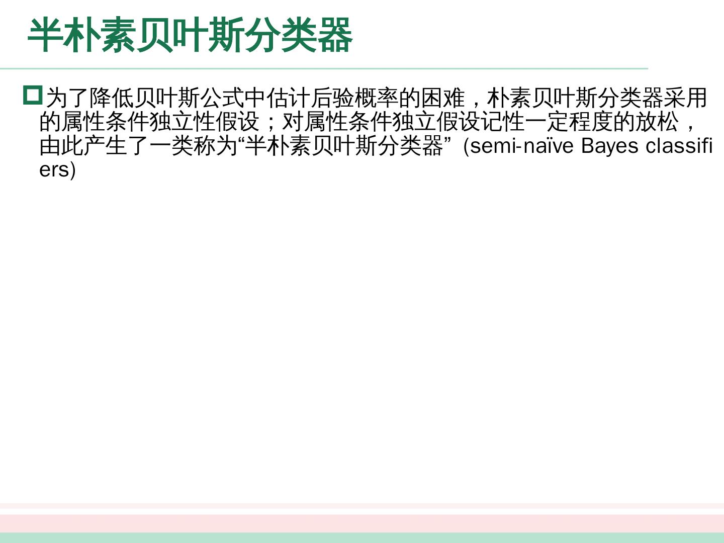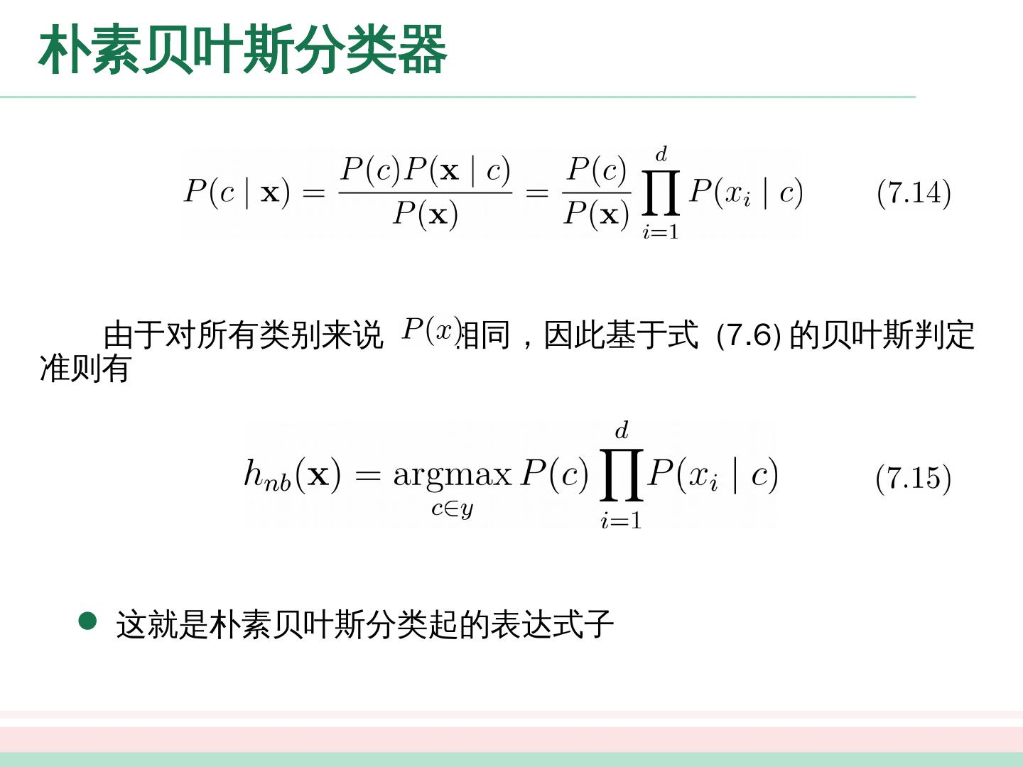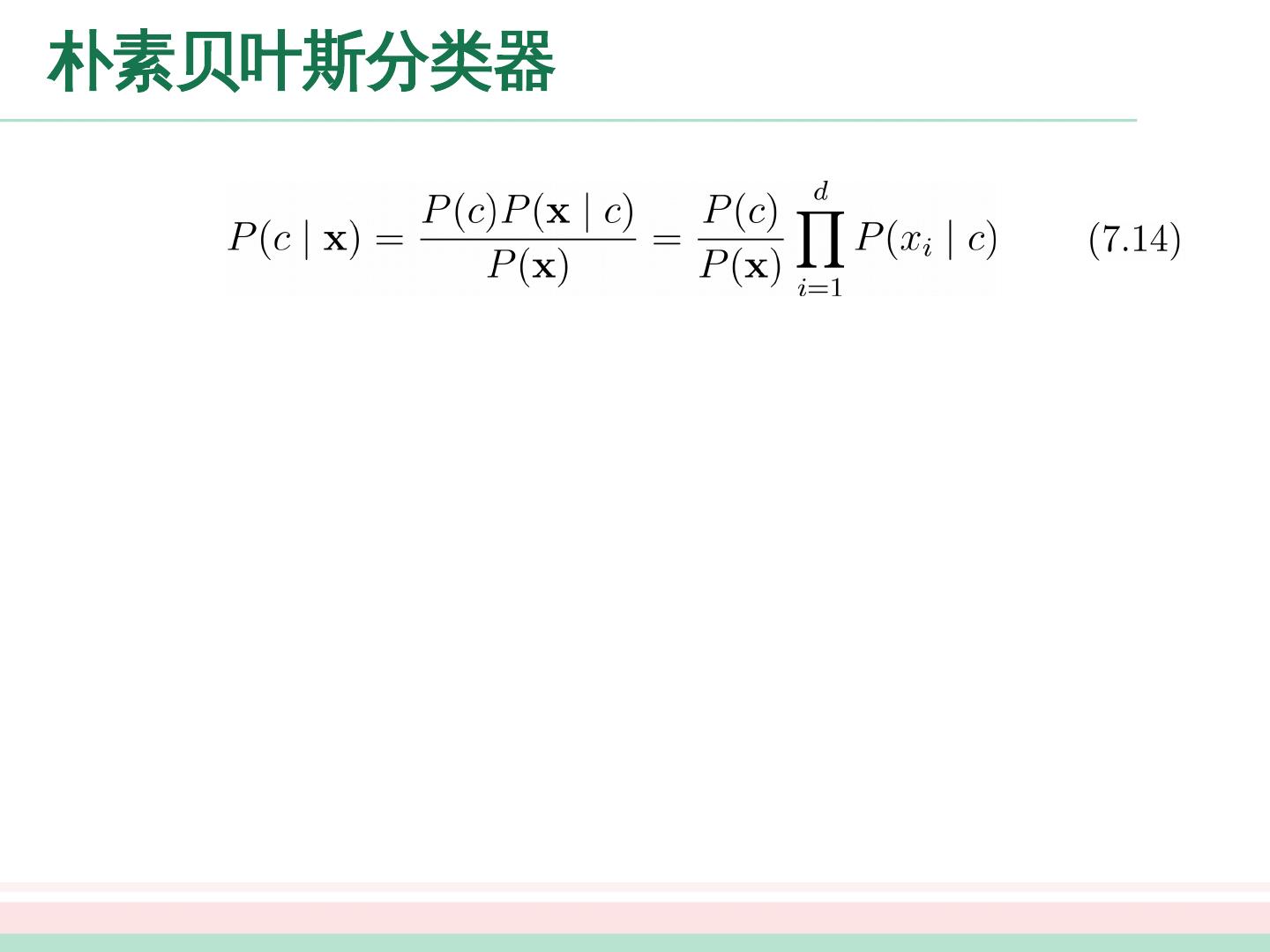 27 .朴素贝叶斯分类器 由于 对所有类别来说 相同,因此 基于式 (7.6) 的贝叶斯 判定准则有 这就是朴素贝叶斯分类起的表达式子
