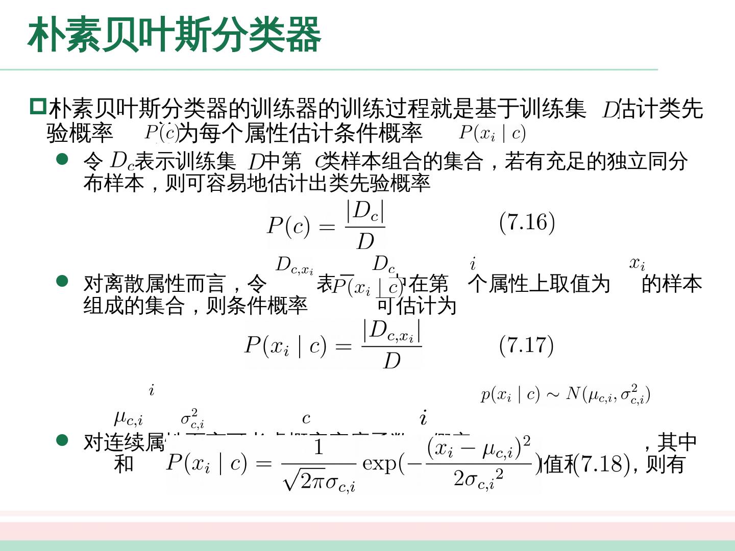 28 .朴素 贝叶斯分类器 朴素 贝叶斯分类器的训练器的训练过程就是基于训练集 估计类先验概率 并为每个属性估计条件概率 。 令 表示训练集 中第 类样本组合的集合,若有充足的独立同分布样本,则可容易地估计出类先验概率 对离散属性而言,令 表示 中在第 个属性上取值为 的样本组成的集合,则条件概率 可估计为 对连续属性而言可考虑概率密度函数,假定 ,其中 和 分别是第 类样本在第 个属性上取值的均值和方差,则有