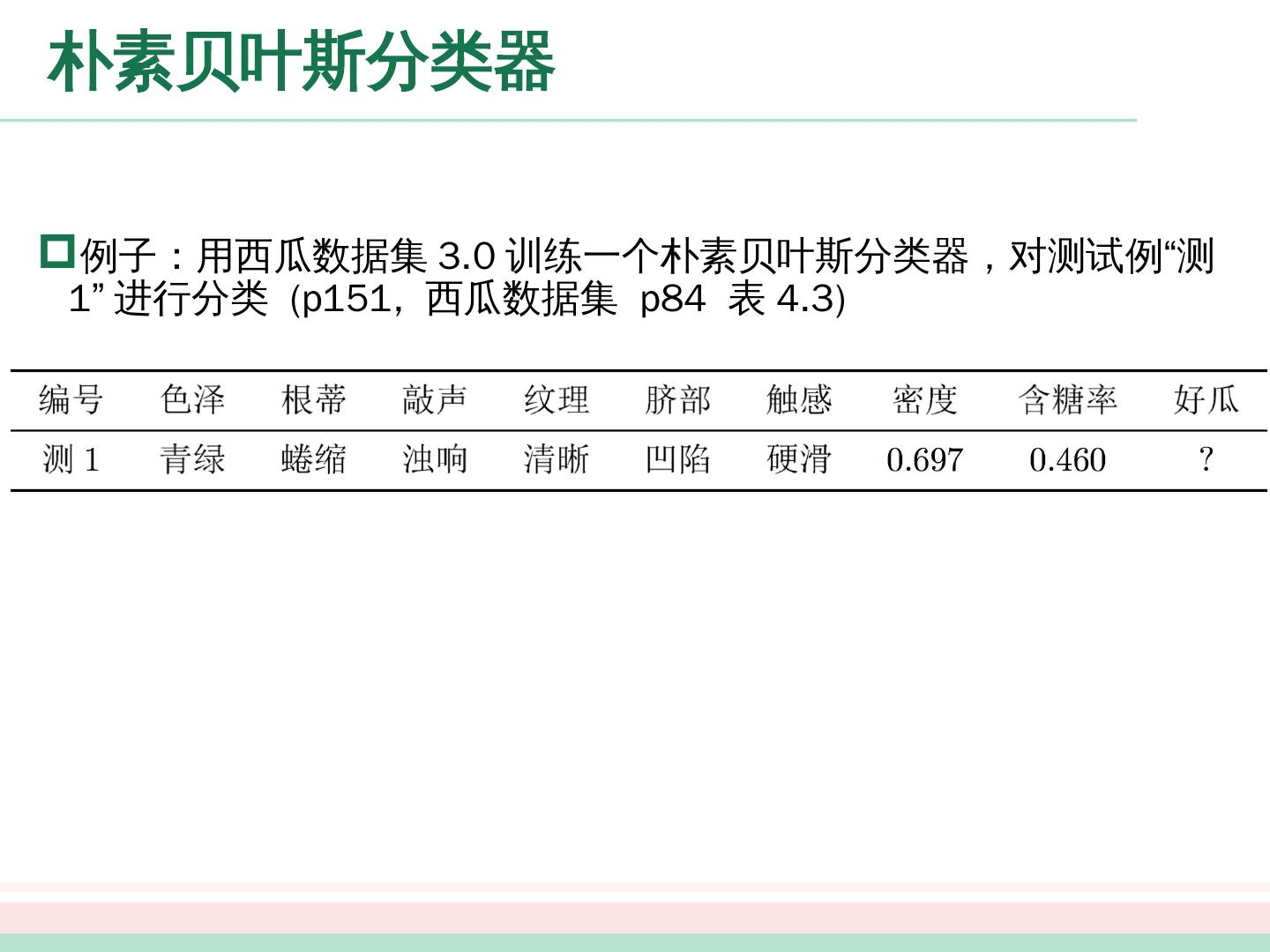 29 .朴素贝叶斯分类器 例子:用西瓜数据集 3.0 训练一个朴素贝叶斯分类器,对测试例“测 1 ”进行分类 (p151, 西瓜数据集 p84 表 4.3)